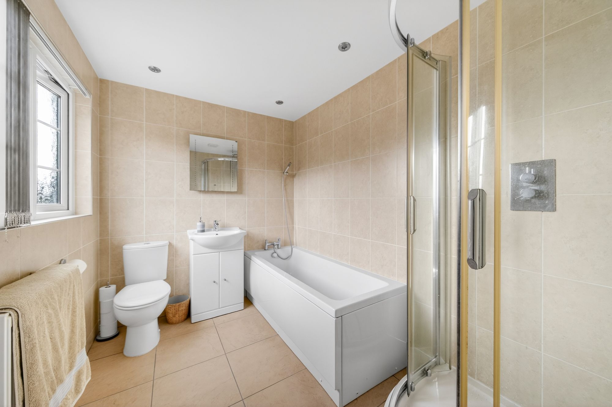 The house bathroom features a contemporary four-piece suite comprising a quadrant-style shower cubicle with thermostatic rainfall shower, a panel bath with showerhead mixer tap, a broad wash hand basin with vanity cupboard beneath and chrome monobloc mixer tap, and a low-level WC with push-button flush. There is tiling to the walls, tiled flooring, inset spotlighting to the ceiling, an extractor fan, a radiator, and a bank of double-glazed windows with obscure glass to the side elevation.