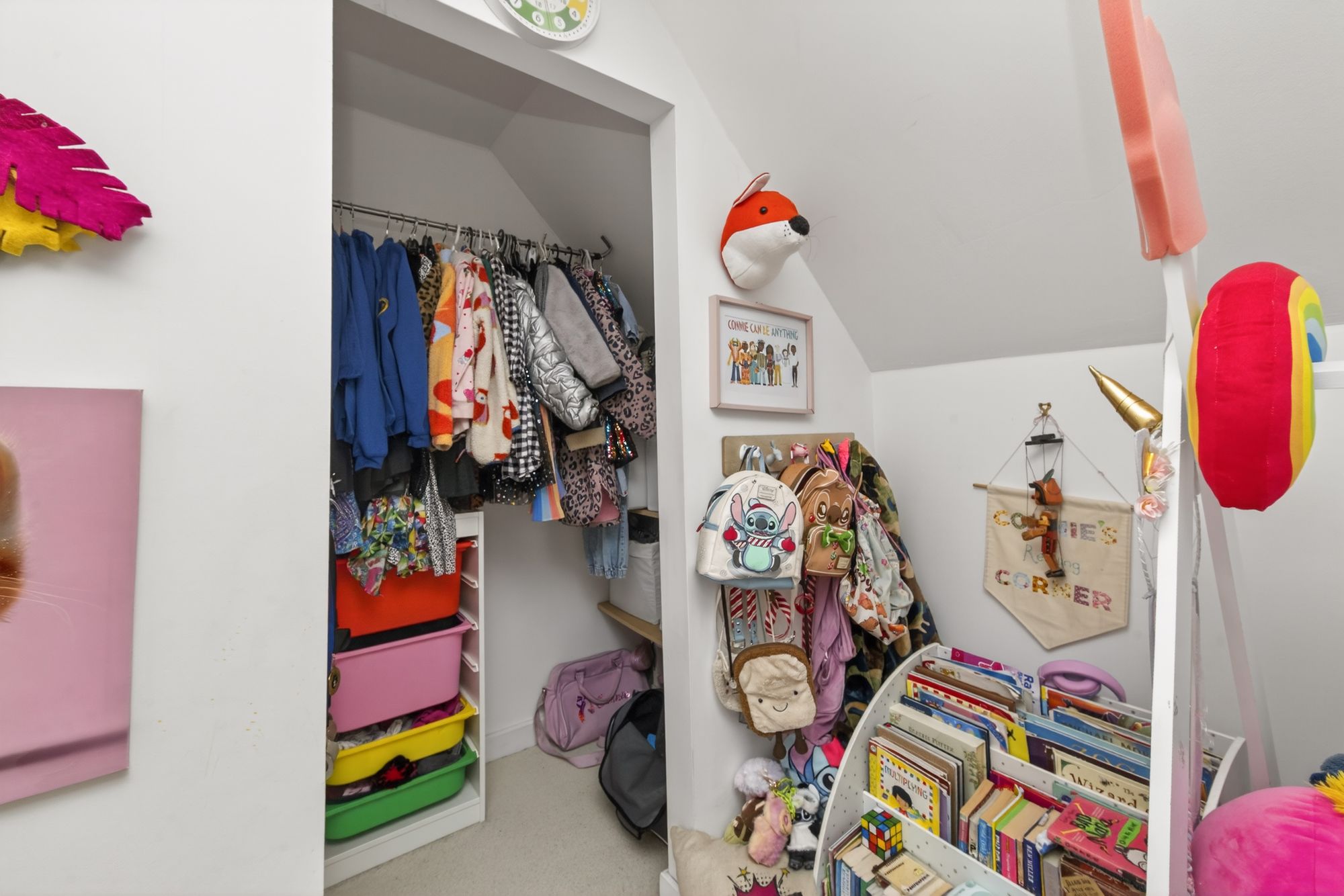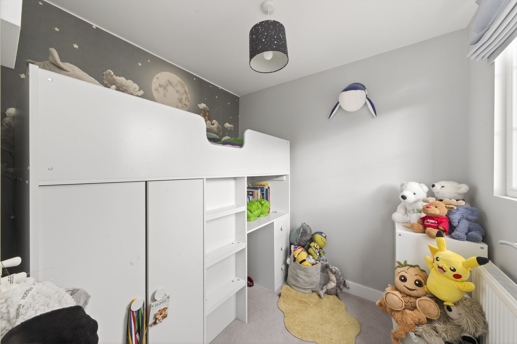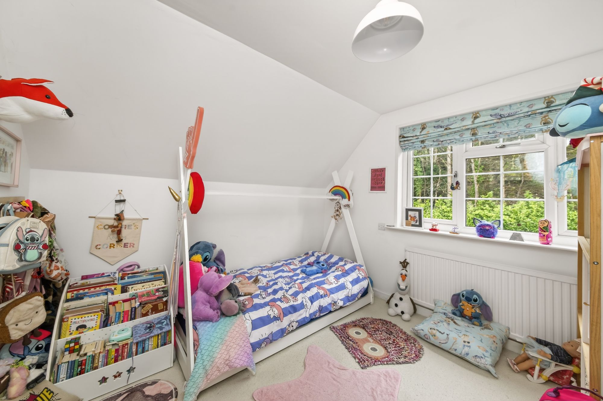 Bedroom two can accommodate a double bed with space for freestanding furniture. It is situated to the front of the property and features a bank of double-glazed windows, a ceiling light point, a radiator, and a loft hatch providing access to a useful attic space. The room also benefits from a walk-in wardrobe with hanging rail and shelving in situ.