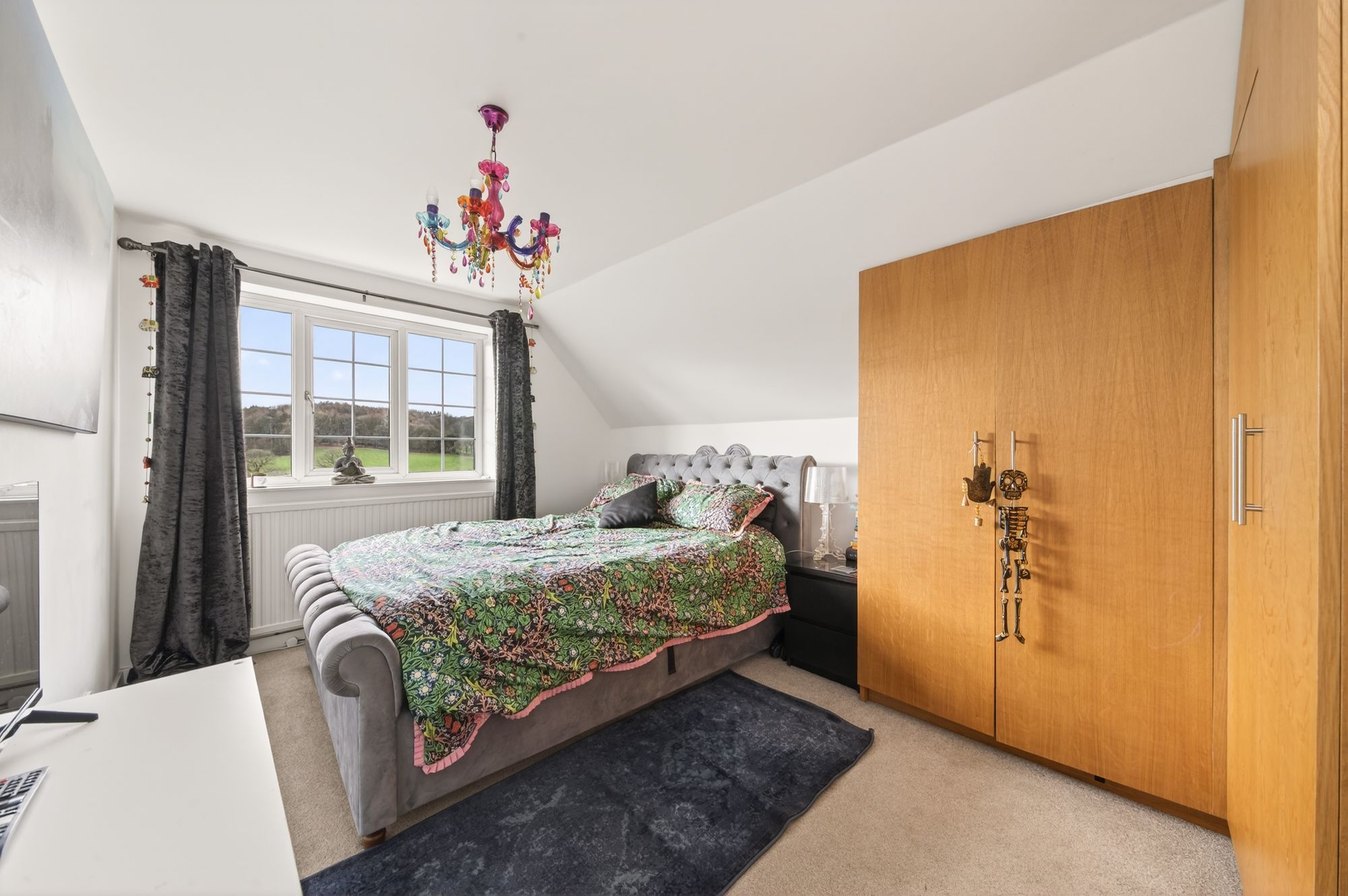 Bedroom one is a generously proportioned, light and airy double bedroom with ample space for freestanding furniture. There is a bank of double-glazed windows to the rear elevation which take full advantage of the elevated position of the property, boasting panoramic views across the valley. There is a ceiling light point, a radiator, a bank of fitted wardrobes with hanging rails and shelving, and a cupboard over the bulkhead for the stairs which offers a great deal of additional storage space.