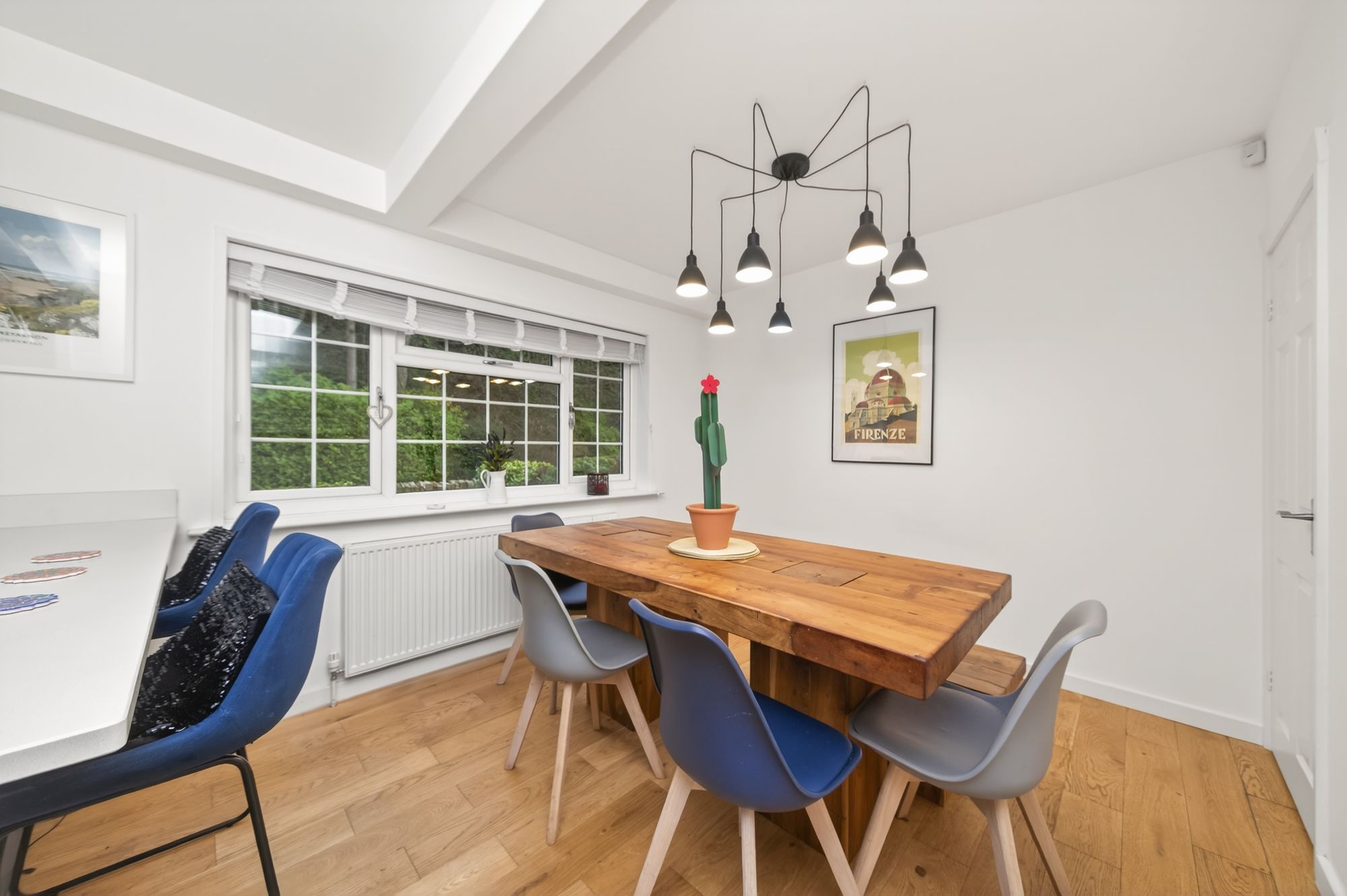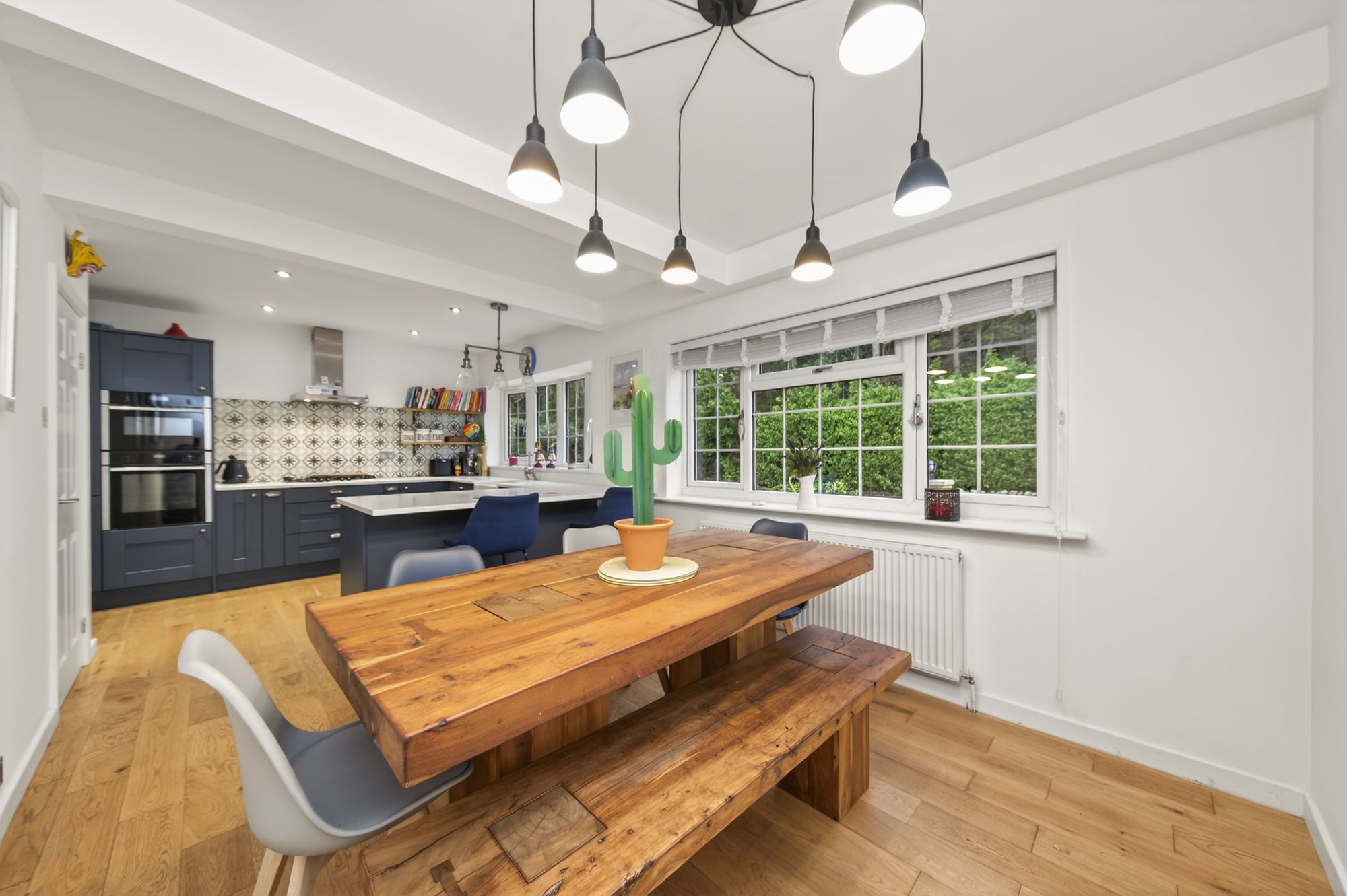 The dining kitchen is a fabulously proportioned, impressive, light and airy room, featuring two banks of windows to the front elevation, including a bay window to the kitchen area. There is inset spotlighting, a ceiling light point over the breakfast peninsula, a pendant light point over the dining area, attractive hardwood flooring, a radiator, and a multi-panel door enclosing the downstairs WC.