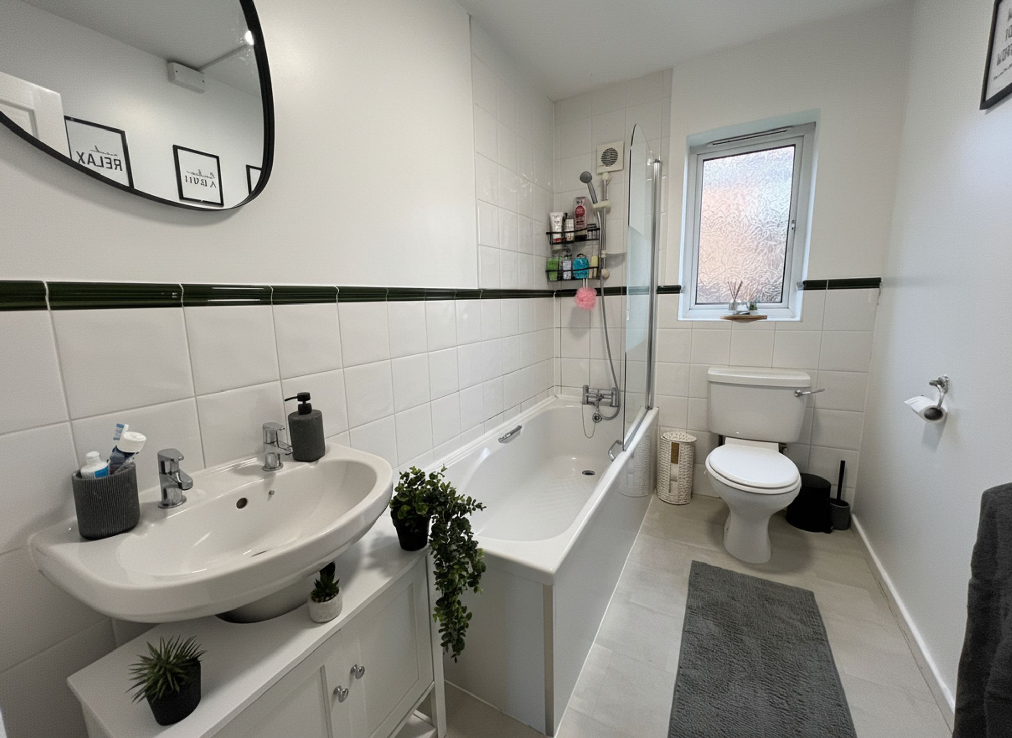 The bathroom features a modern white three-piece suite comprising a panelled bath with a showerhead mixer tap and glazed shower screen, a low-level WC, and a pedestal wash hand basin. There is tiling to the splashback areas, a ceiling light point, a radiator, and a double-glazed window with obscure glazing to the rear elevation.