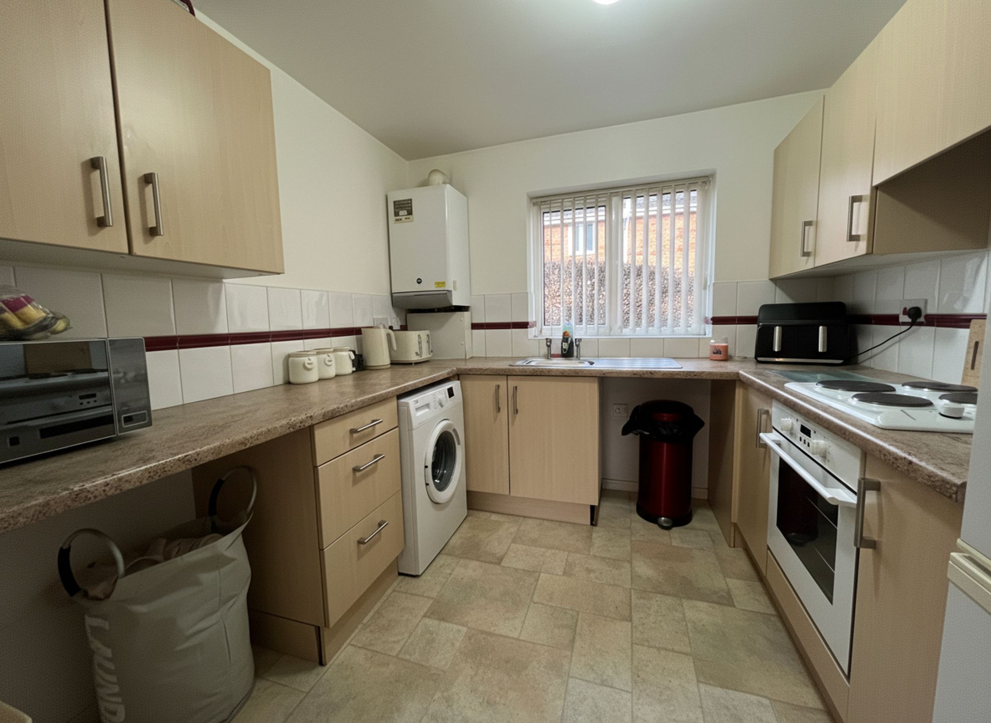 The kitchen features a range of fitted wall and base units with complementary rolled-edge work surfaces over, incorporating a single-bowl stainless steel sink and drainer unit with chrome taps. The kitchen is equipped with built-in appliances, including a four-ring electric hob with an integrated cooker hood over and a built-in fan-assisted oven. There is plumbing and provision for an automatic washing machine, as well as space for a fridge, freezer, and potentially a condensing tumble dryer. The kitchen also features tiling to the splashback areas, a central ceiling light point, a radiator, and a bank of double-glazed windows to the rear elevation. It houses the wall-mounted combination boiler system.