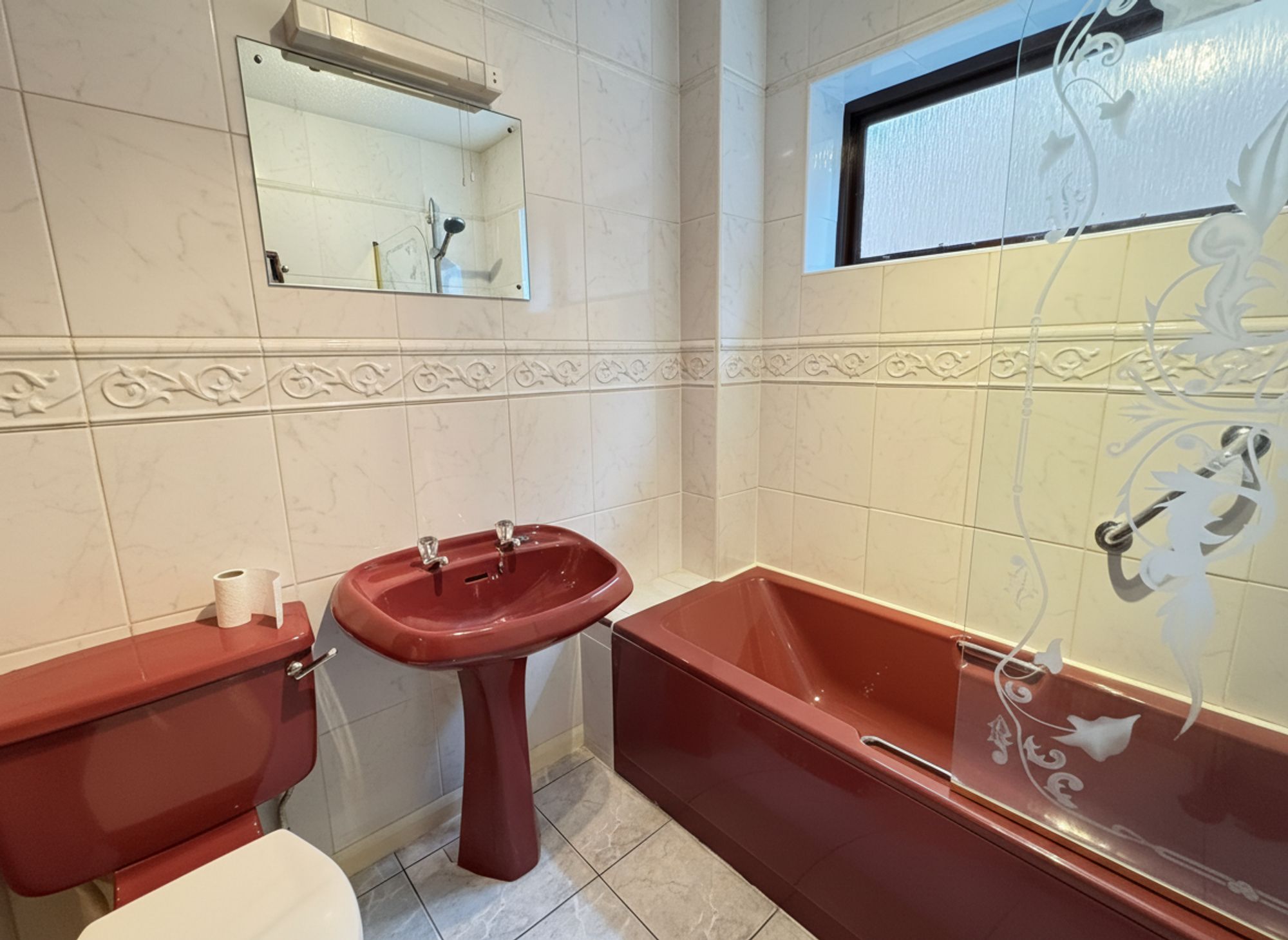 BATHROOMComprising a three-piece suite, including a close-coupled WC, a pedestal basin with chrome mixer taps, and a bathtub with mains-fed shower and shower attachment. The walls and floor are fully tiled, and the room benefits from a ceiling light and a timber-framed, obscured-glass window to the side.