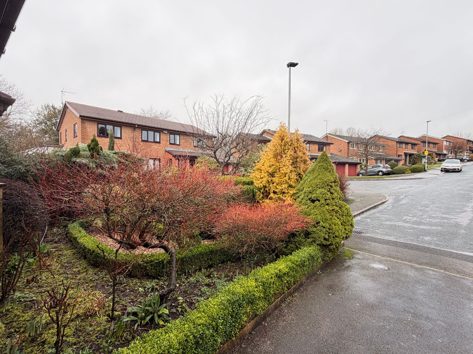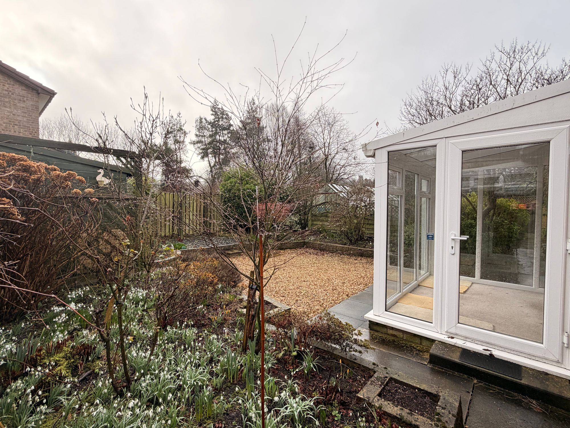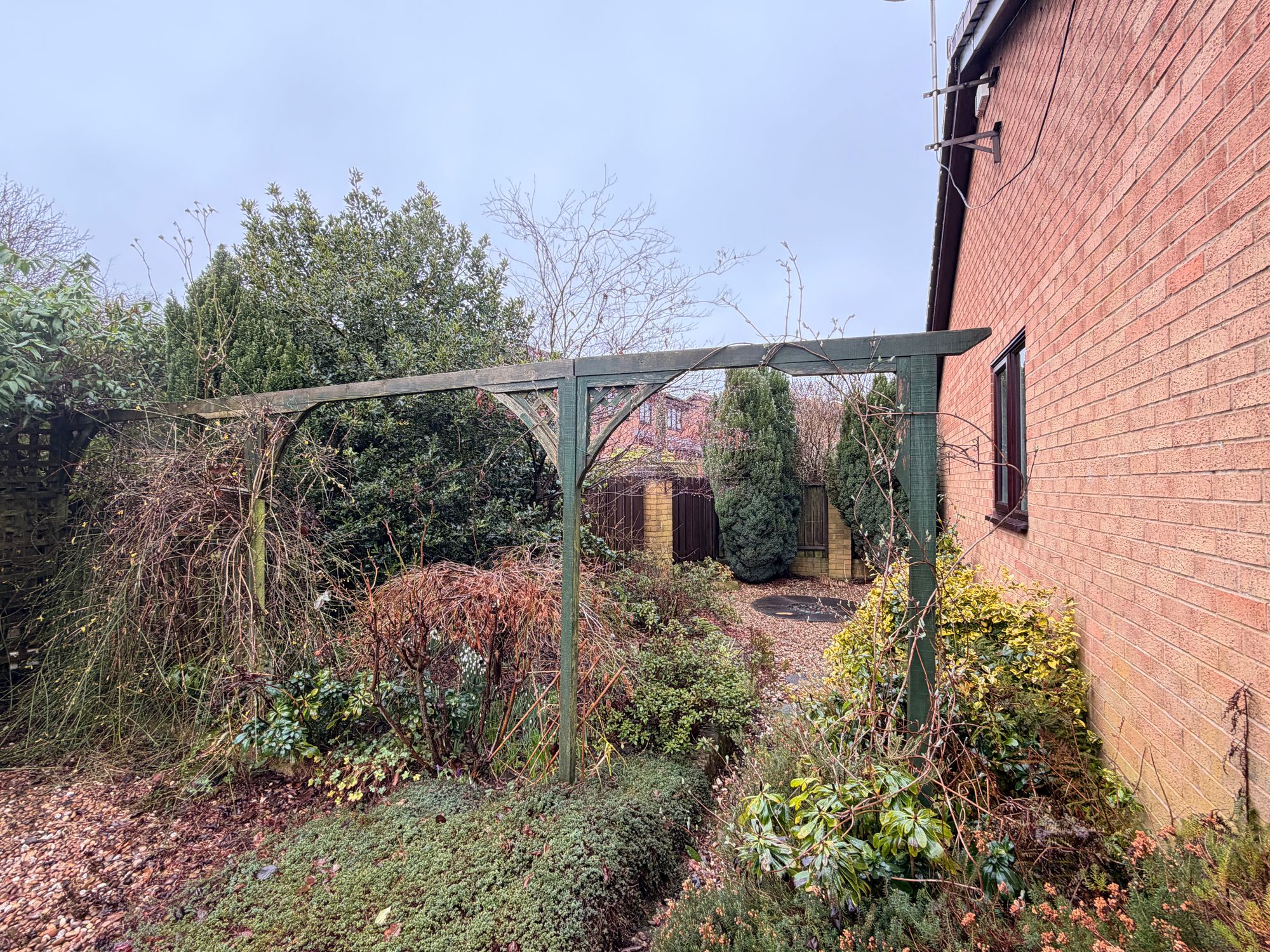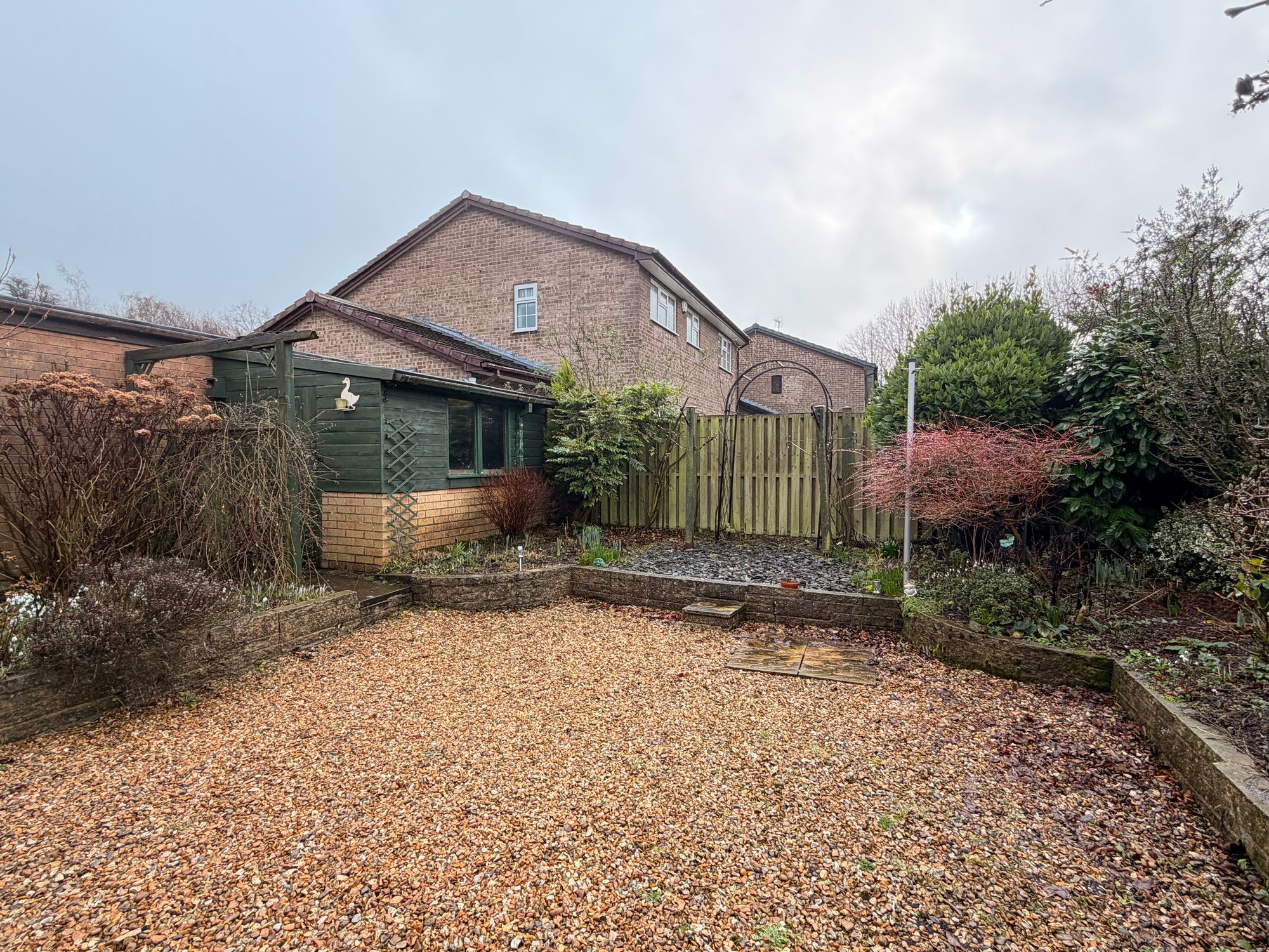 OUTSIDEThe property is situated at the end of a quiet cul-de-sac within this well-regarded residential development. To the front, there is a beautifully landscaped garden featuring a variety of plants, mature trees, and shrubs. A tarmac driveway provides off-street parking for at least four vehicles and leads to the detached single garage. The rear garden is enclosed with perimeter fencing and hedging, enjoying a private outlook. It features extensive raised beds planted with flowers, shrubs, and mature trees, with the main area predominantly gravelled with pebbles. A brick-built and timber shed provides additional storage or workspace. A flagged pathway runs through the garden, connecting the different areas and leading to a further enclosed section at the corner of the plot, where the current vendors have installed two greenhouses and vegetable beds for growing produce. The pathway also provides access to the side garden, which has an Indian stone-paved area, ideal for outdoor furniture.
