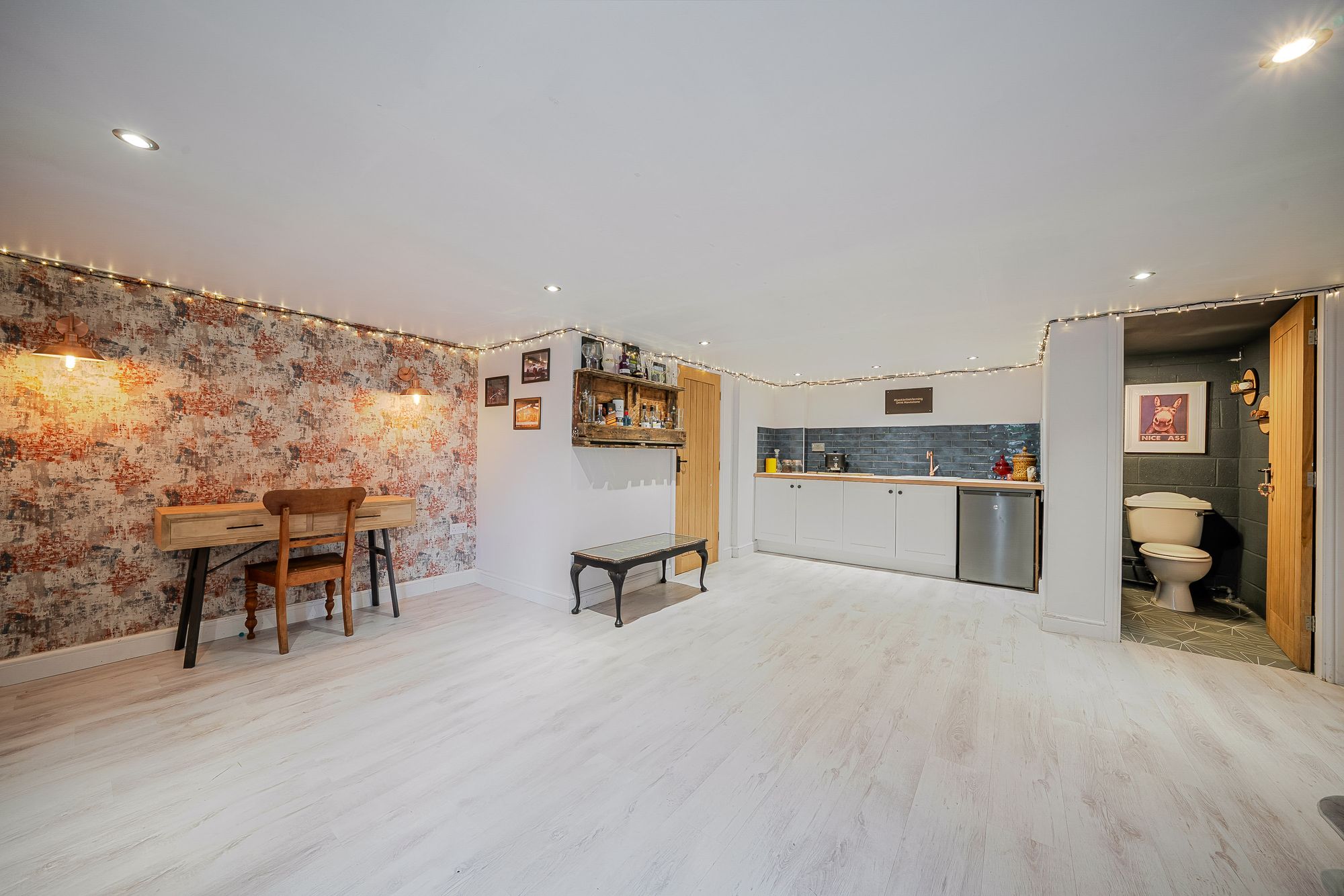 The kitchen is fitted with a range of anthracite shaker style wall and base cupboards , drawers, these are complimented by contrasting overlying quartz worktops with matching splashbacks with additional tiling above, there is a Belfast sink with a brass monobloc tap with extending hose, there is a brushed stainless steel range style Bertzzoni Italia cooker with five ring induction hob and twin electric ovens, Neff integrated microwave, integrated dishwasher and integrated fridge and freezer. To one side there is a lobby with an oak- veneered door giving access to the living room and useful storage area beneath the staircase.