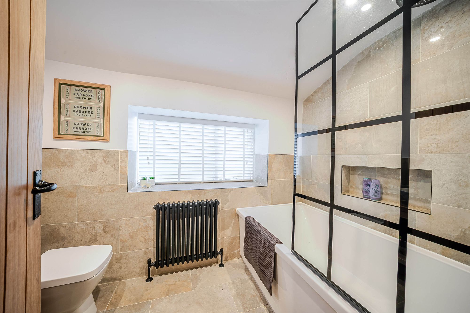 This has a frosted sealed unit double glazed window, inset LED downlighters, wall light point, part tiled walls, tiled floor, column style central heating radiator and fitted with a suite comprising twin oval handwash basins mounted onto a timber plinth with storage beneath, low flush WC and panelled bath with glazed shower screen and shower fitting over incorporating fixed shower rose and separate hand spray.