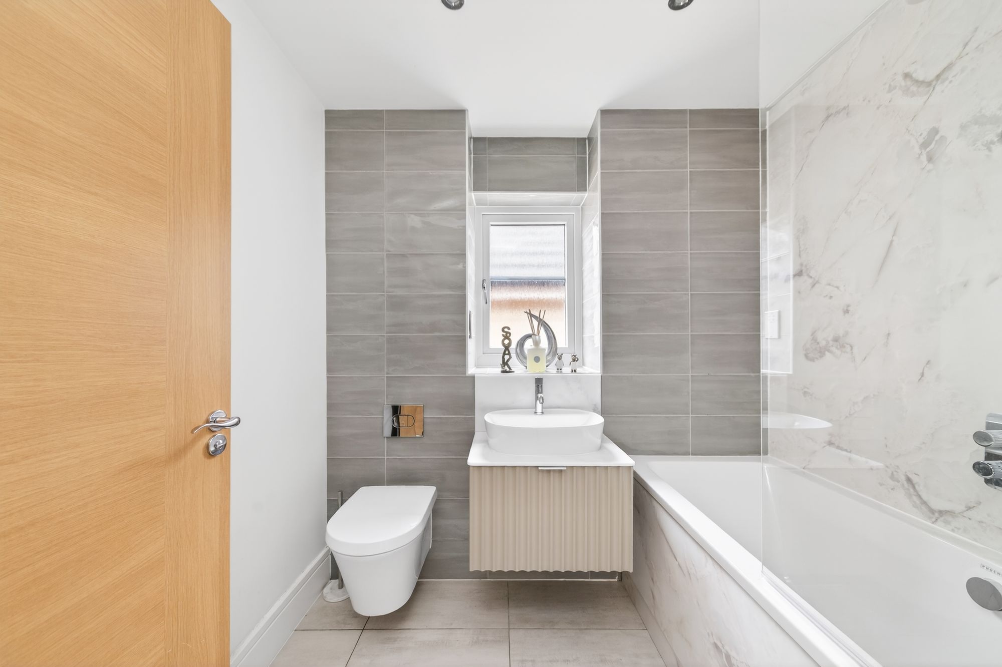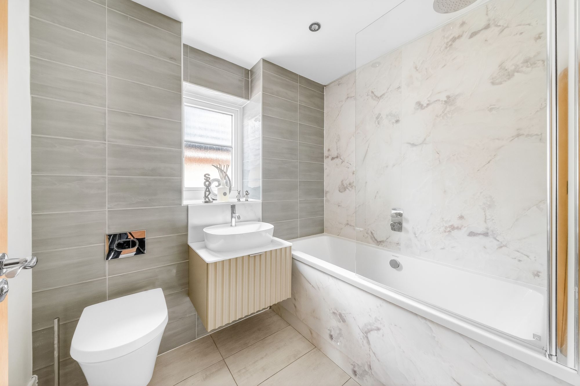 The house bathroom is superbly finished and features a beautiful three piece suite in white comprising of a double ended high specification bath with screen and high-quality chrome shower fittings above. The bathroom also features a delightful wash hand basin with mixer tap, a concealed cistern W.C. of chrome manufacture, shaver sockets and tiling where appropriate to the ceiling height. There is an extractor fan, obscure glazed window and inset lighting to the ceiling. There is also a cream chrome ladder style heated towel rail.
