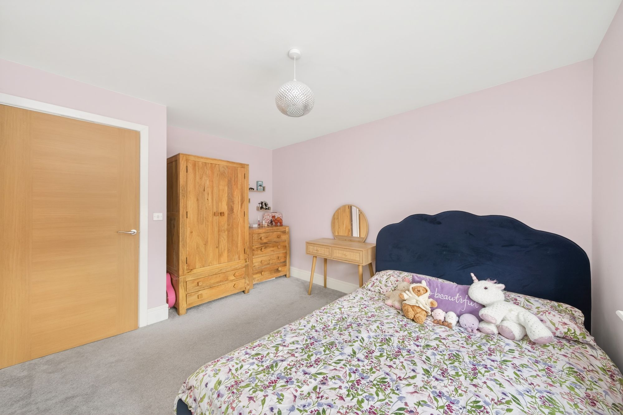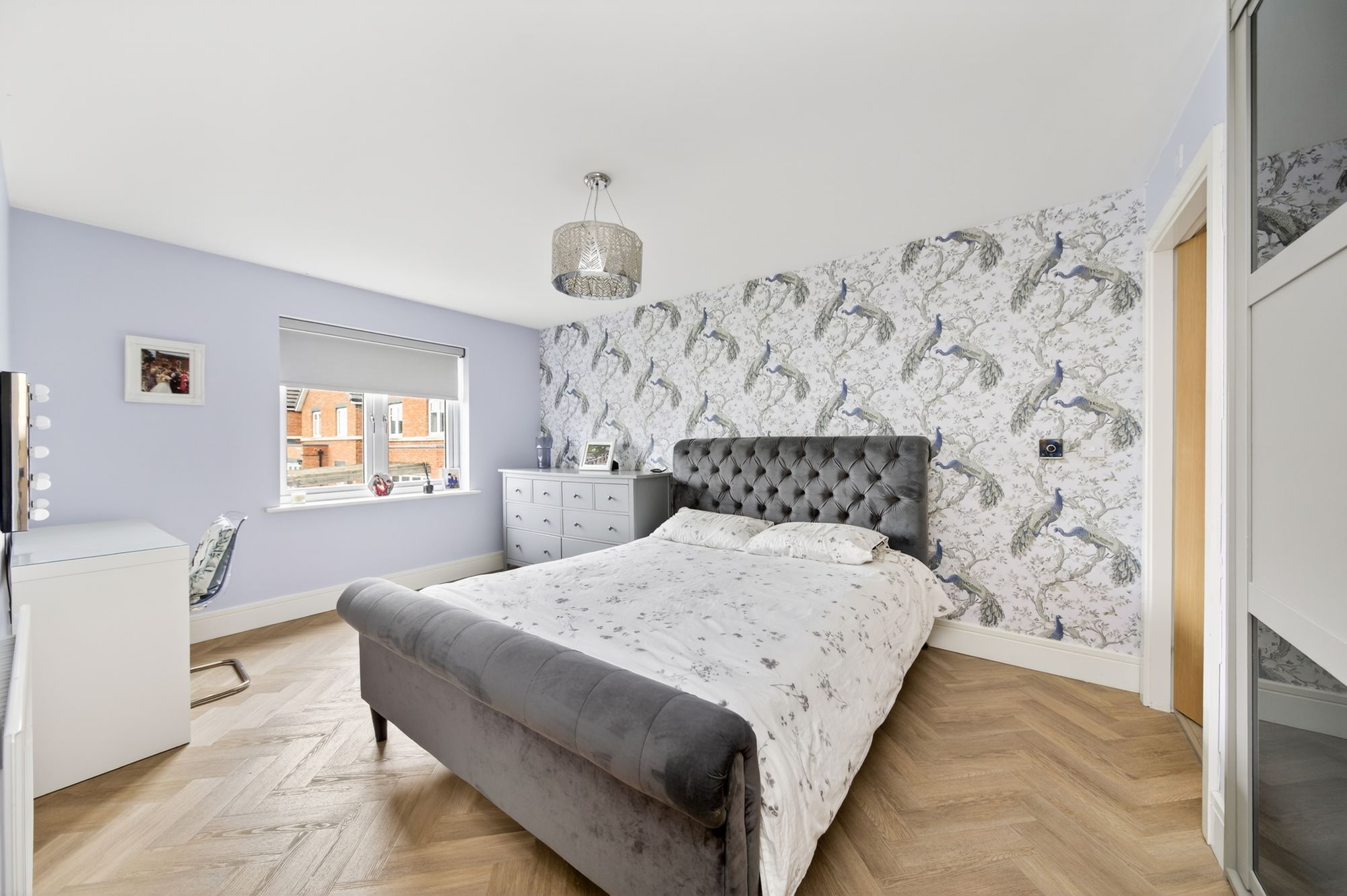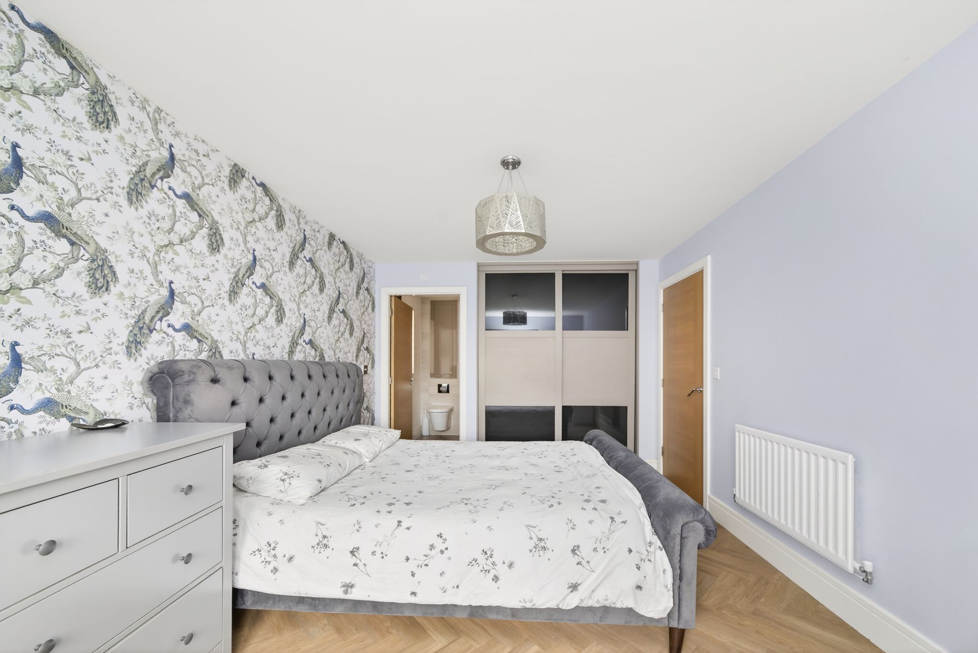 Bedroom one is a lovely room with high quality flooring, high quality décor and a pleasant view out over the property’s enclosed rear gardens courtesy of twin windows. There is a central ceiling light point and a wall of inbuilt robes.