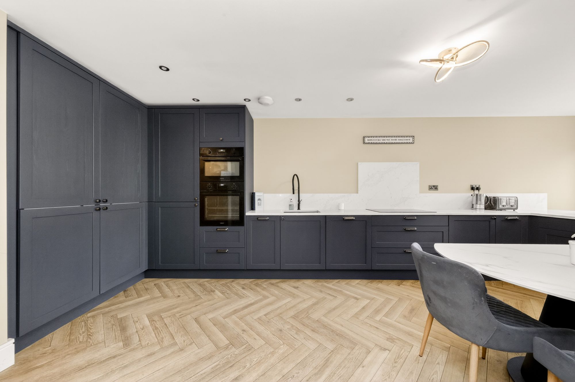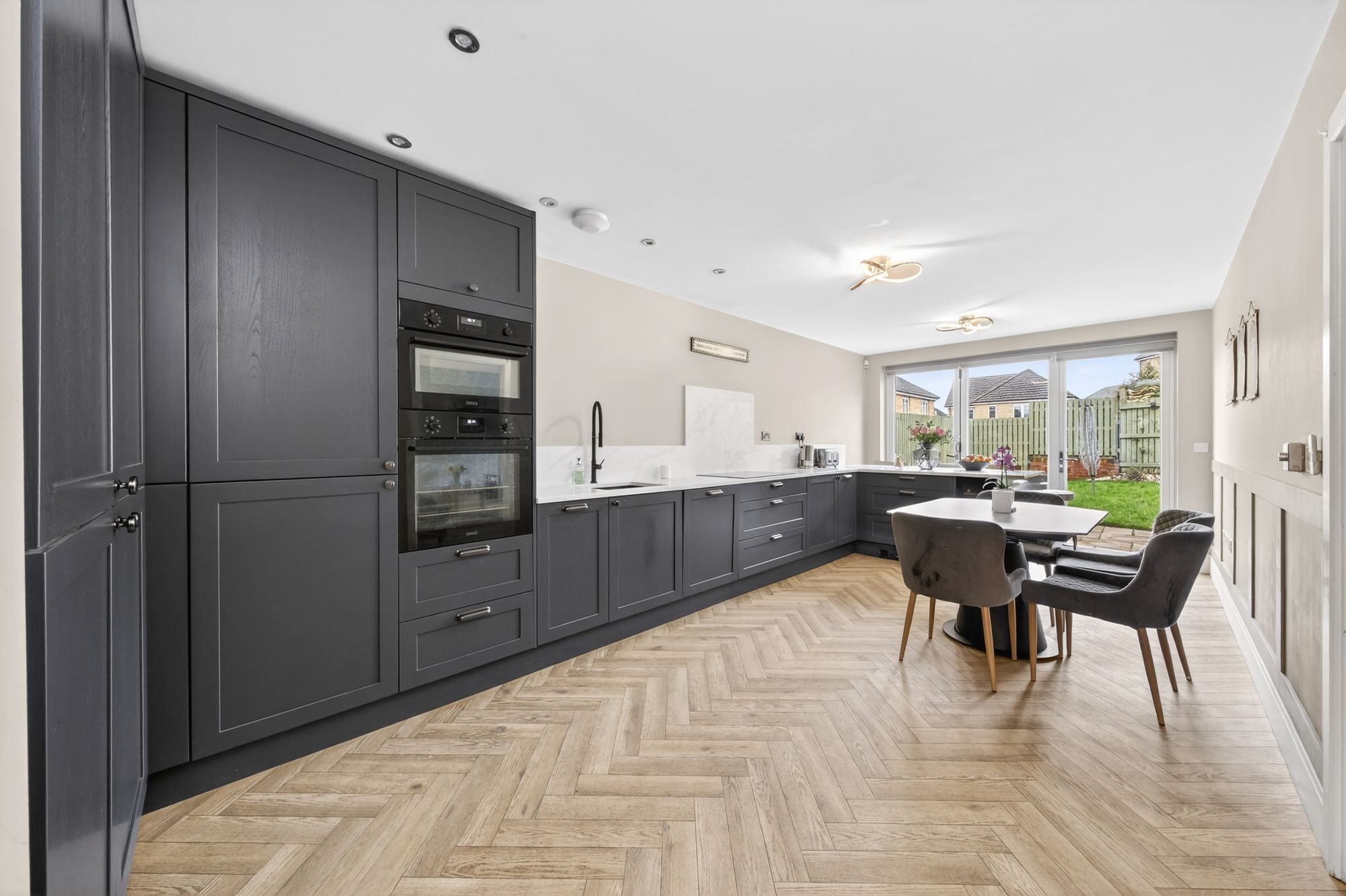 A recent addition to the home is this beautiful array of units these being at both the high and low level providing a large amount of delightful working surfaces which extends out to a broad breakfast bar with seating for four. The kitchen enjoys bi-folding doors giving a stunning view out to the property’s rear gardens. These three bi-folding doors flood the room with natural light. There are high specification inbuilt appliances including a Smeg induction hob, trash bin, inset one and a half bowl sink with stylish mixer tap above, built in wine fridge, dishwasher, double oven and a particularly tall fridge/freezer. With inset spotlighting and other lighting points, the dining kitchen is a great asset to the home.