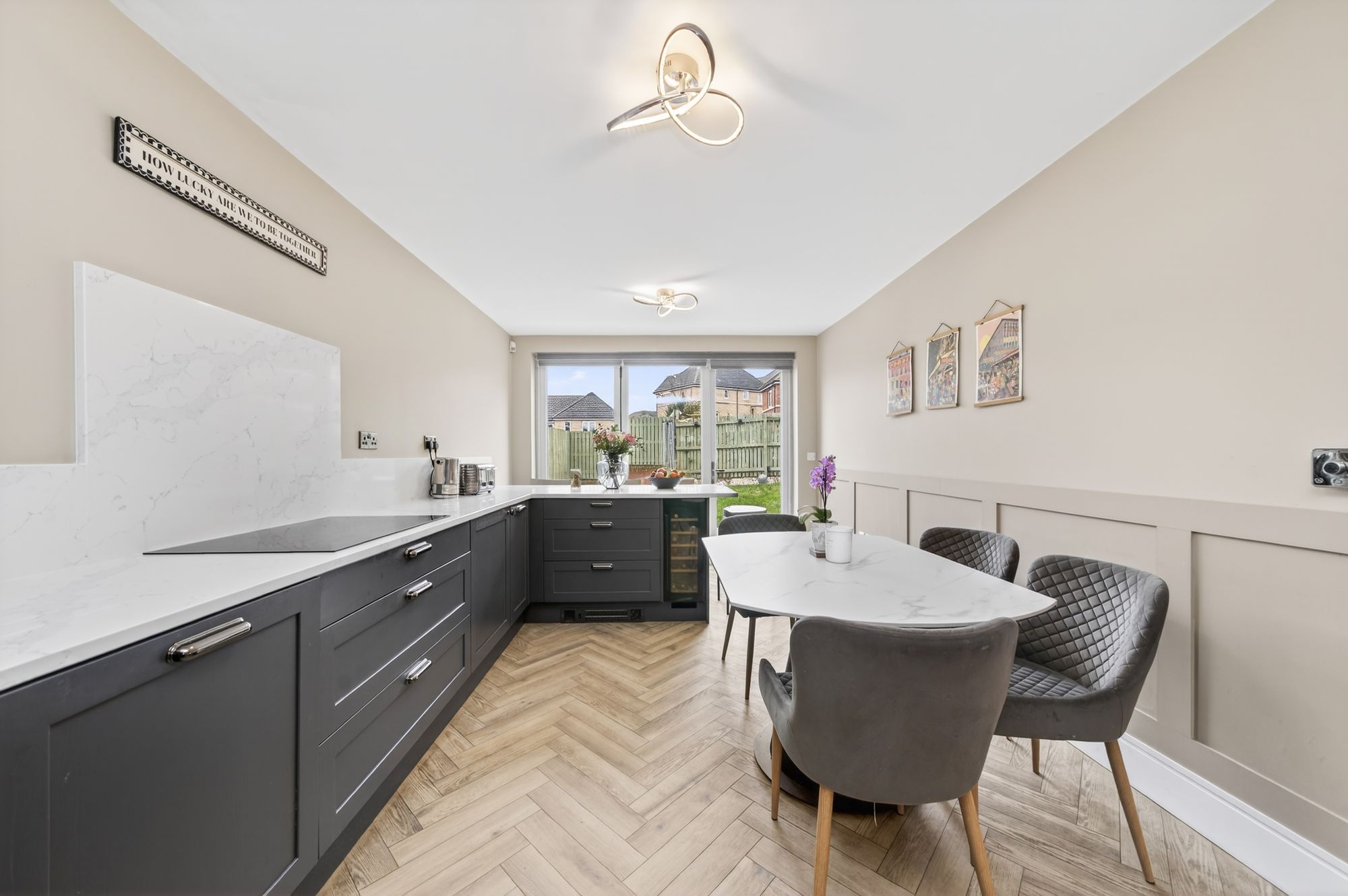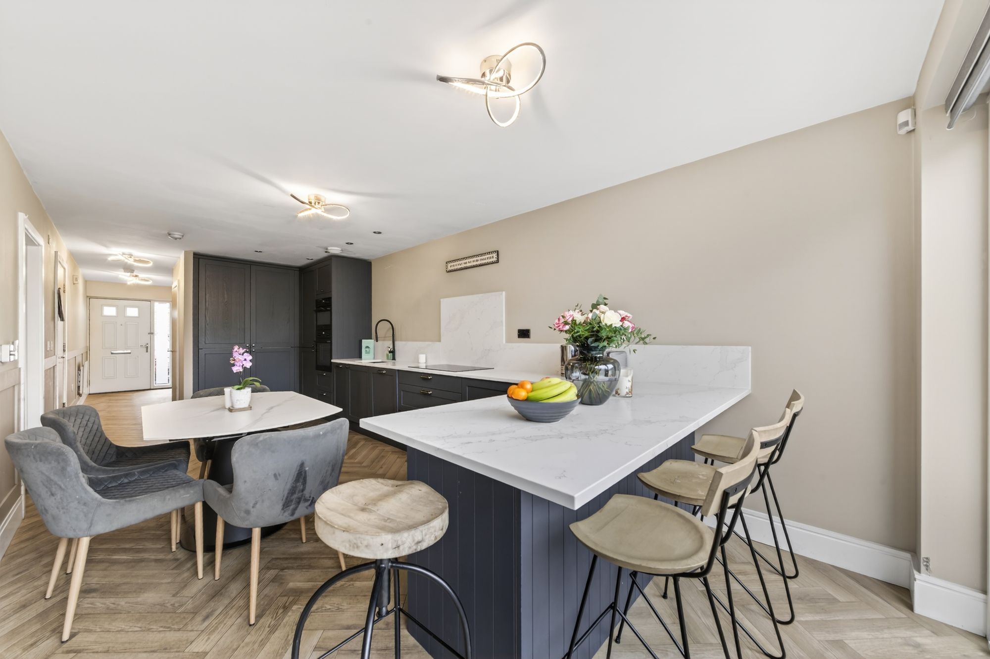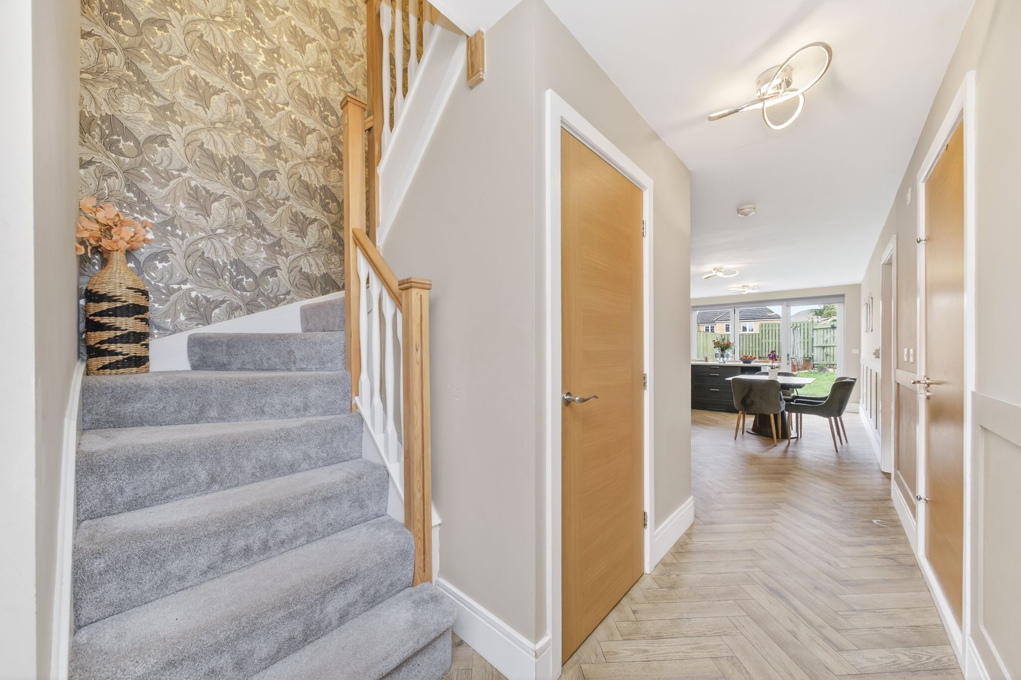 A stylish entrance door with inset glazing and matching glaze side panel gives access through to the entrance hallway. This fabulous entrance hallway sets the scene in terms of décor and style. It has superb flooring and this continues all the way through to the rear of the home via the dining kitchen. The view out over the rear garden is immediately apparent when entering the front entrance door. To the left, there is a downstairs W.C. Moving into the home, we pass the staircase which turns and rises to the first-floor landing and there is a useful understairs storage cupboard. A doorway gives access to the playroom/utility room.