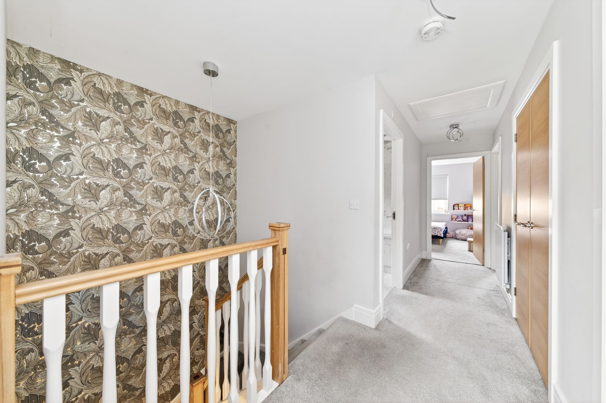 A staircase turns and rises up to the first-floor landing. This has lighting points to the ceiling and good sized storage cupboards being home for the property’s Potterton gas central heating boiler. A doorway leads through to bedroom one.
