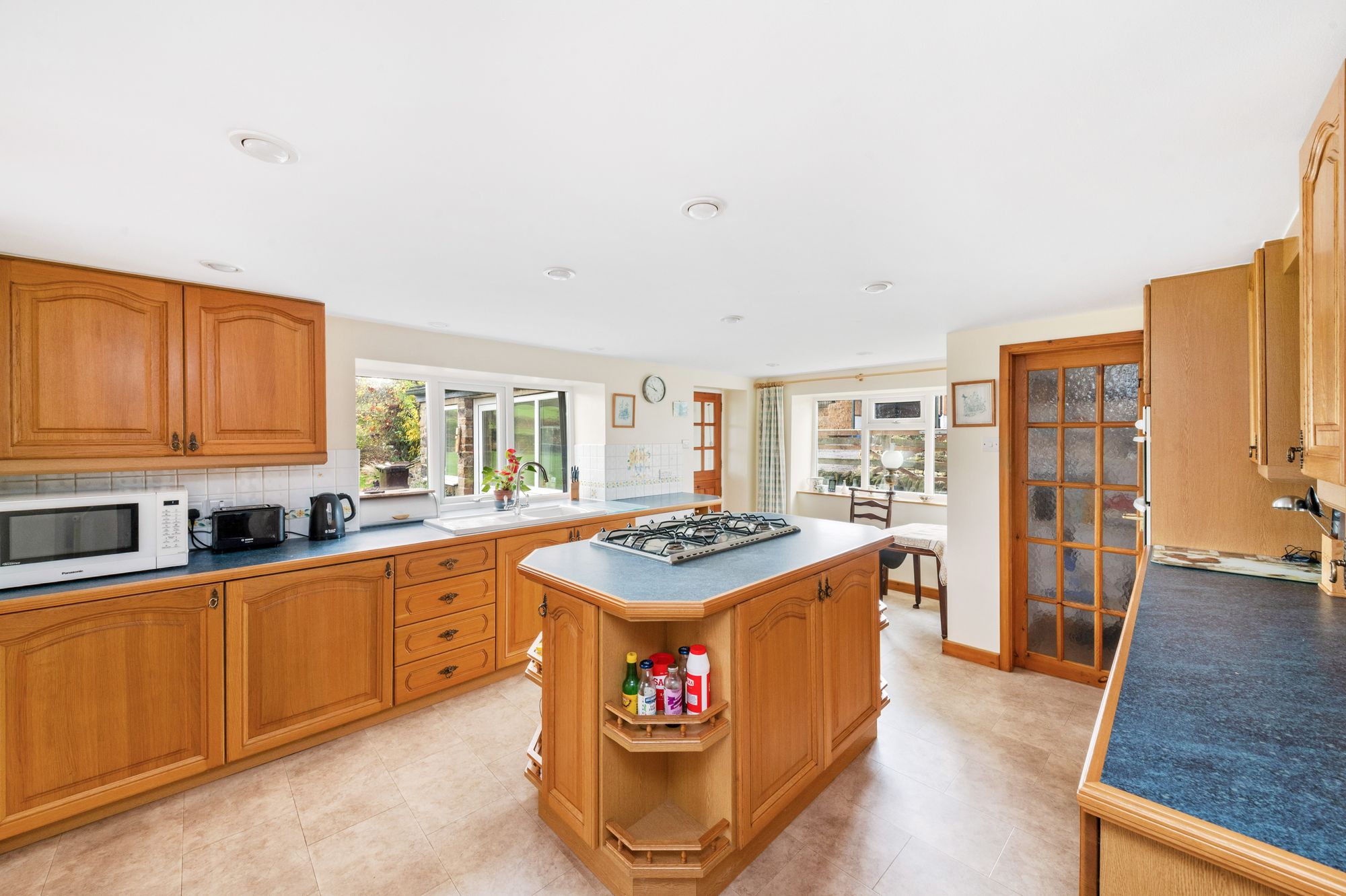 The breakfast kitchen enjoys a great deal of natural light courtesy of dual-aspect banks of windows to the side and rear elevations, with the window to the rear taking full advantage of the property's picturesque setting. There is recessed lighting to the ceiling, a radiator, luxury vinyl tiled flooring, multi-panel timber and glazed twin doors proceeding into the formal dining room and pantry, and a stable-style door leading into the utility room. The kitchen features a range of high-quality fitted wall and base units with shaker-style cupboard fronts and complementary work surfaces over, which incorporate a one-and-a-half-bowl, ceramic sink and drainer unit with chrome mixer tap, a five ring gas hob inset into the central island with cupboard beneath and corner display shelving, a waist-level double oven, and a dishwasher. The kitchen also features tiling to the splash areas, glazed display cabinets, under-unit lighting, and inset spotlighting to the cornice.