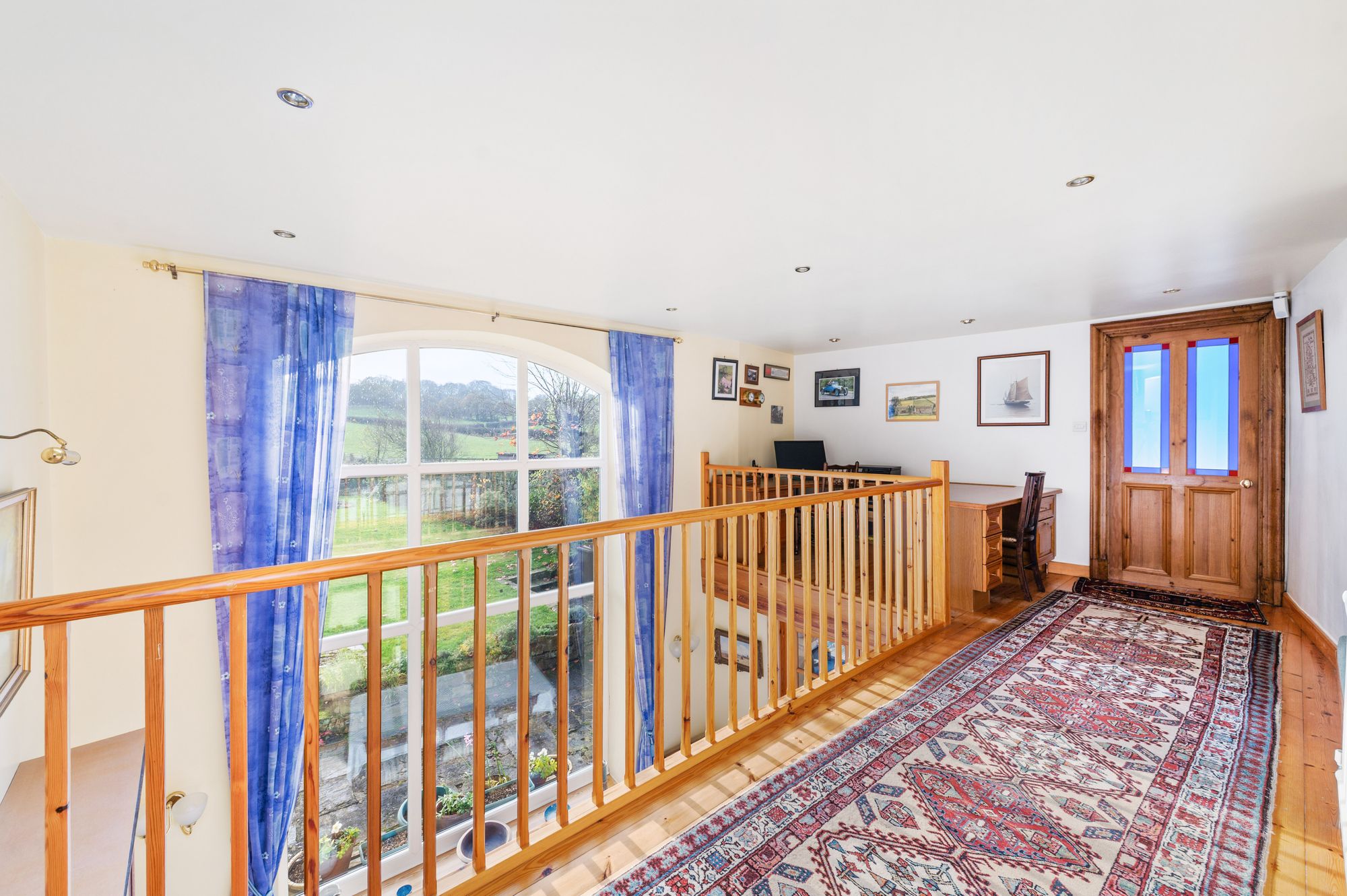Taking the timber staircase from the reception hall, you reach the first floor landing. There is inset spotlighting to the ceiling and a wooden banister with chamfered spindle balustrade over the formal dining room. The office landing area has ample space for twin working desks and features hardwood flooring, a radiator, doors providing access to the bathroom and bedroom accommodation, a double-glazed window to the side elevation, and two wall light points.