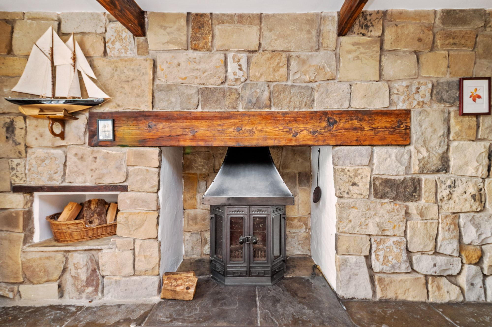 The living room is a generously proportioned, light and airy reception room which features dual-aspect windows, including a fabulous bay window to the front elevation taking advantage of pleasant views, and double-glazed French doors with adjoining window to the rear elevation offering a fabulous open outlook across the rear gardens and neighbouring fields beyond. There are exposed timber beams to the ceiling, partly exposed stone walls, bespoke bench seating by the bay window, and the focal point of the room is the fabulous open fire with cast-iron Clearview stove and matching cast-iron canopy. The fireplace features a stone backcloth with timber lintel above and is set upon a raised stone hearth. Additionally, there are three wall light points, inset spotlighting to the ceiling, and two radiators.