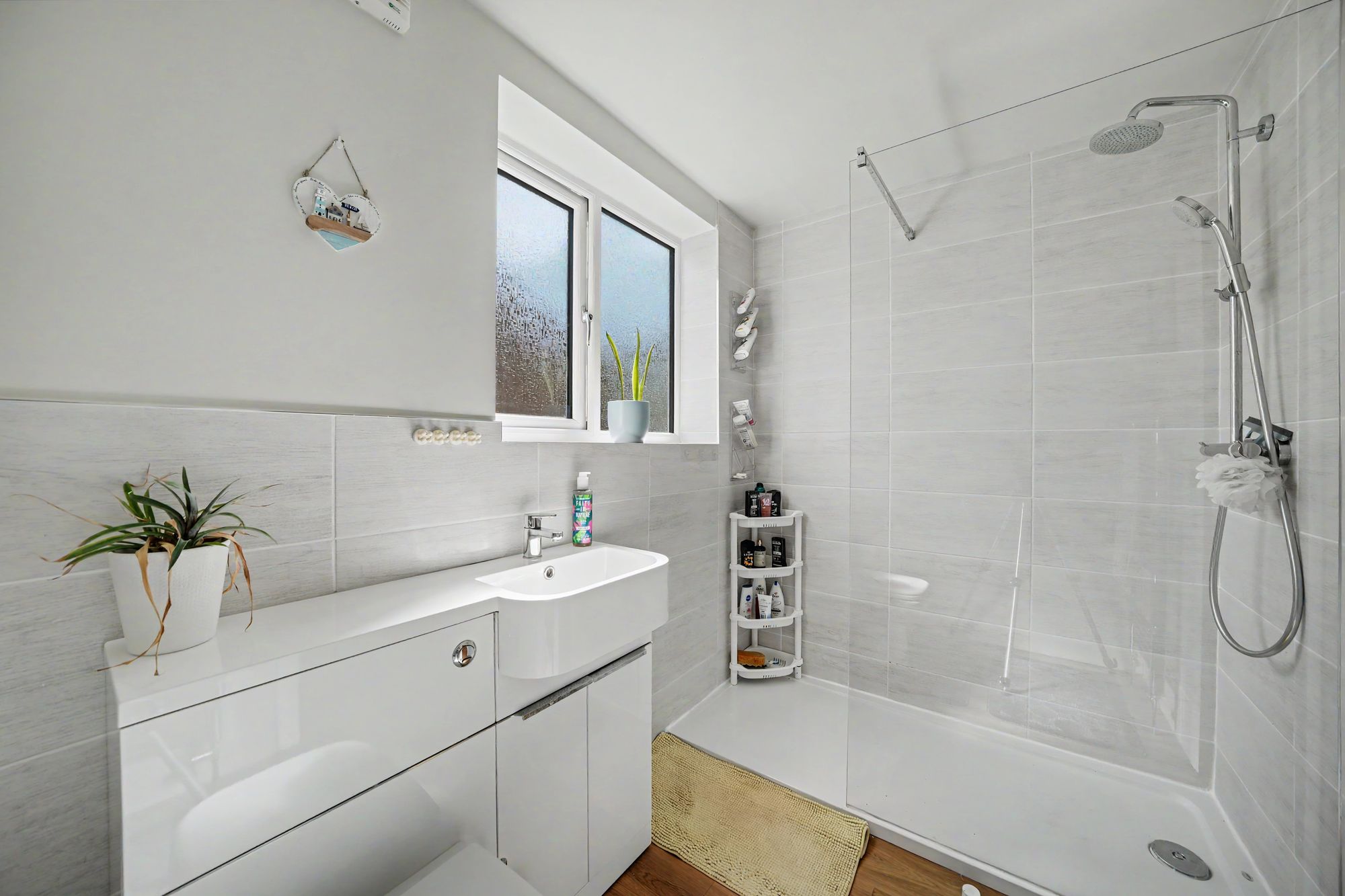 With a frosted uPVC double glazed window, inset ceiling spotlight, extractor fan, laminate flooring, part tiled walls which are floor to ceiling around the shower, chrome ladder style heated towel rail and fitted with a four piece suite comprising double ended panelled bath with chrome mixer tap, vanity unit incorporated wash basin with chrome monobloc tap and low flush w.c with concealed cistern together with a large walk in shower with glazed side panel and chrome shower fitting incorporating fixed shower rose and separate hand spray.