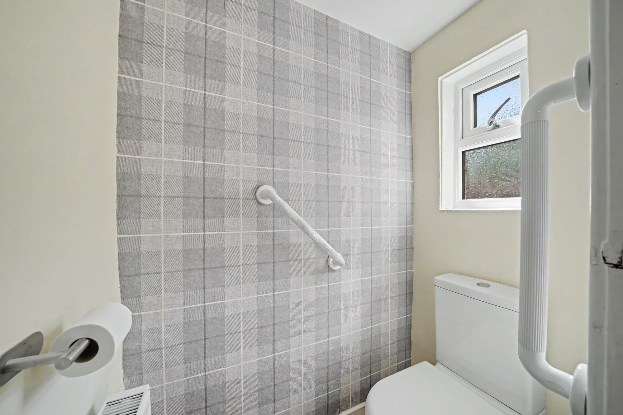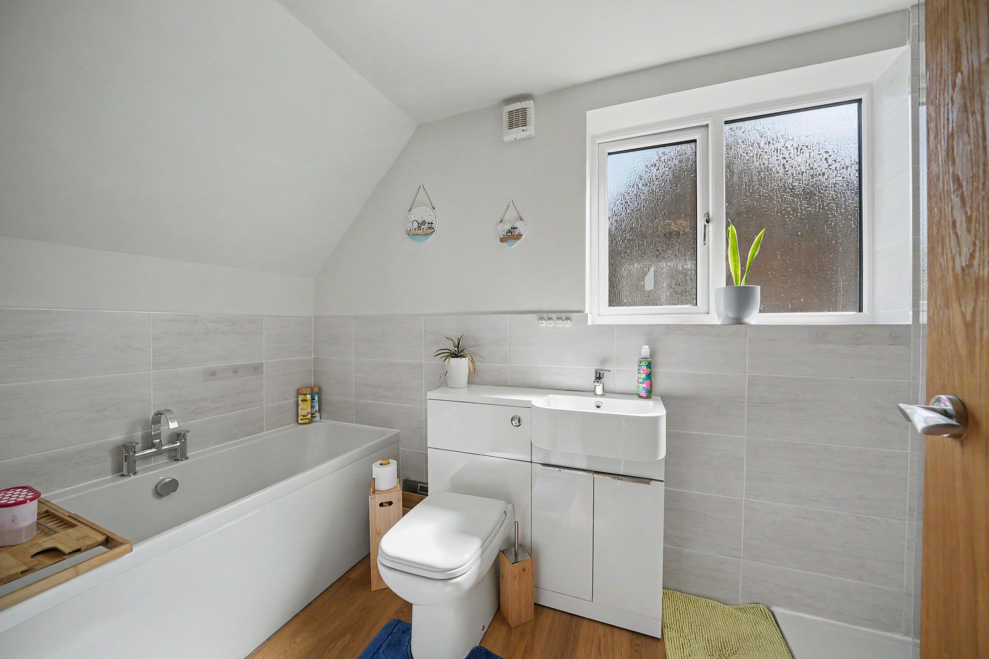 With automatic inset ceiling spotlight, frosted uPVC double glazed window, laminate floor, central heating radiator and fitted with a low flush w.c.