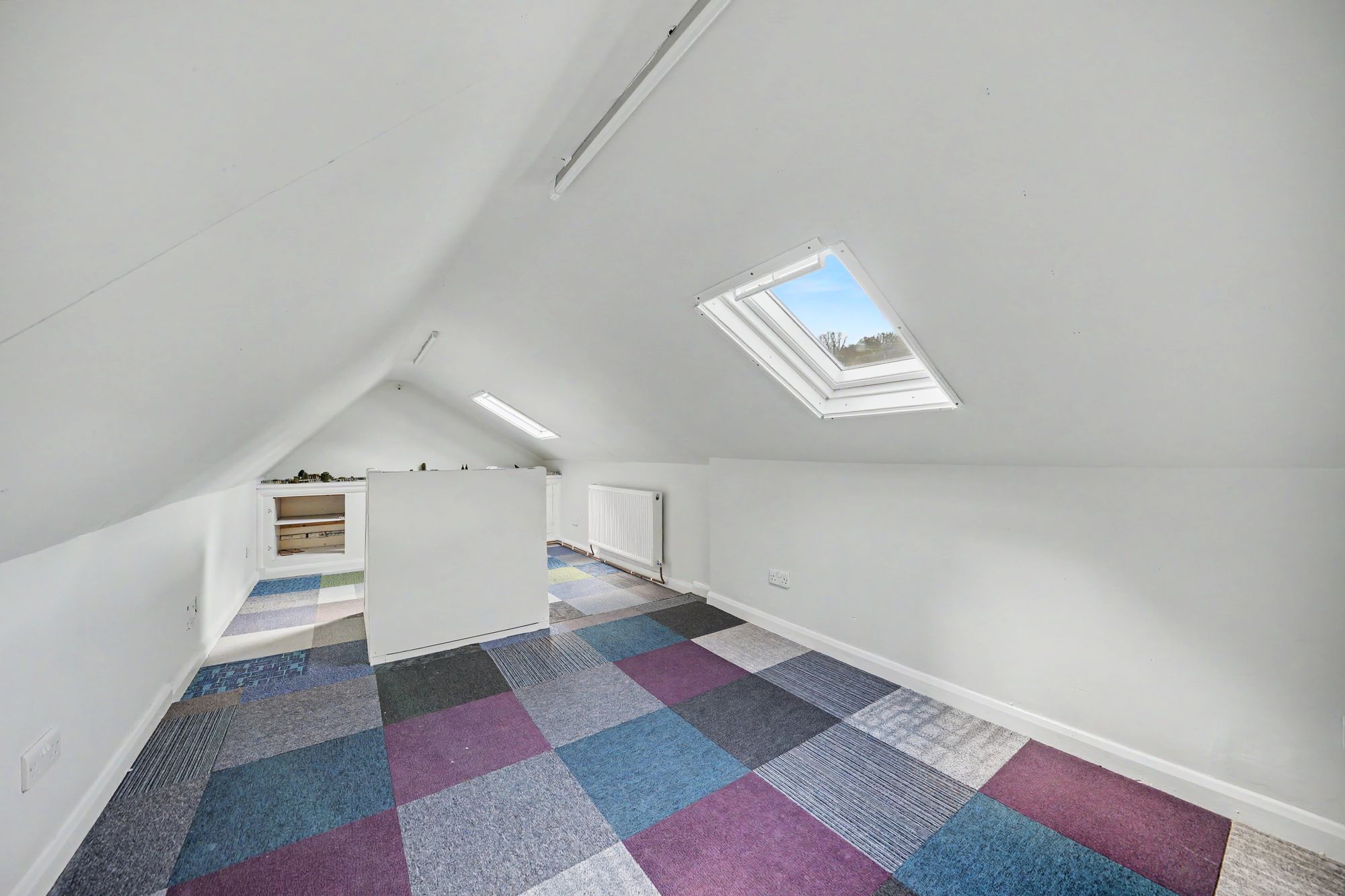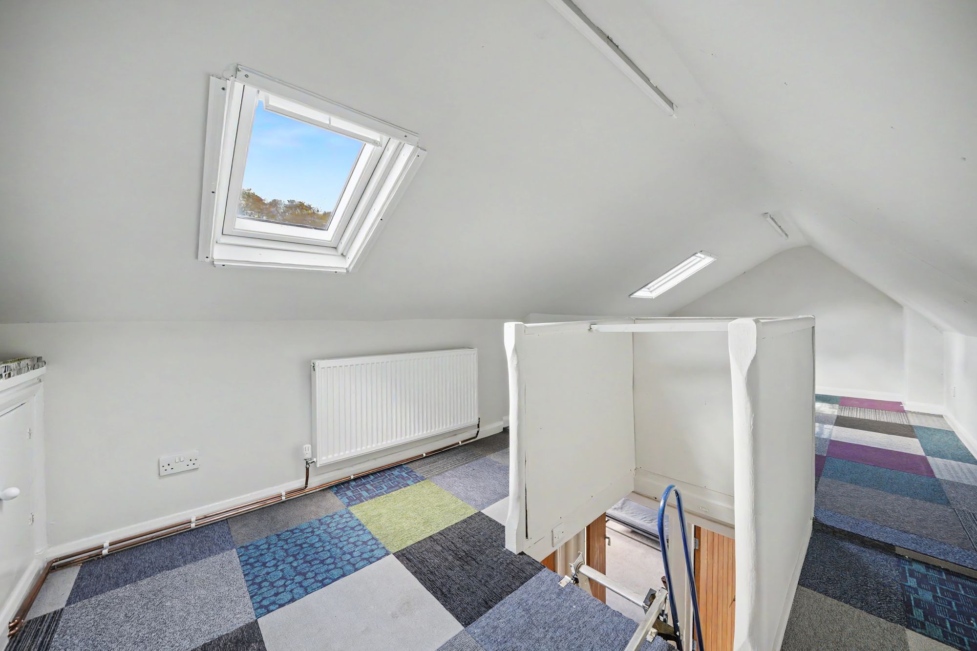 This is accessed via a retractable aluminium ladder from the landing and is boarded, carpeted, there is a central heating radiator, storage cupboards, two ceiling light points and two Velux double glazed windows.