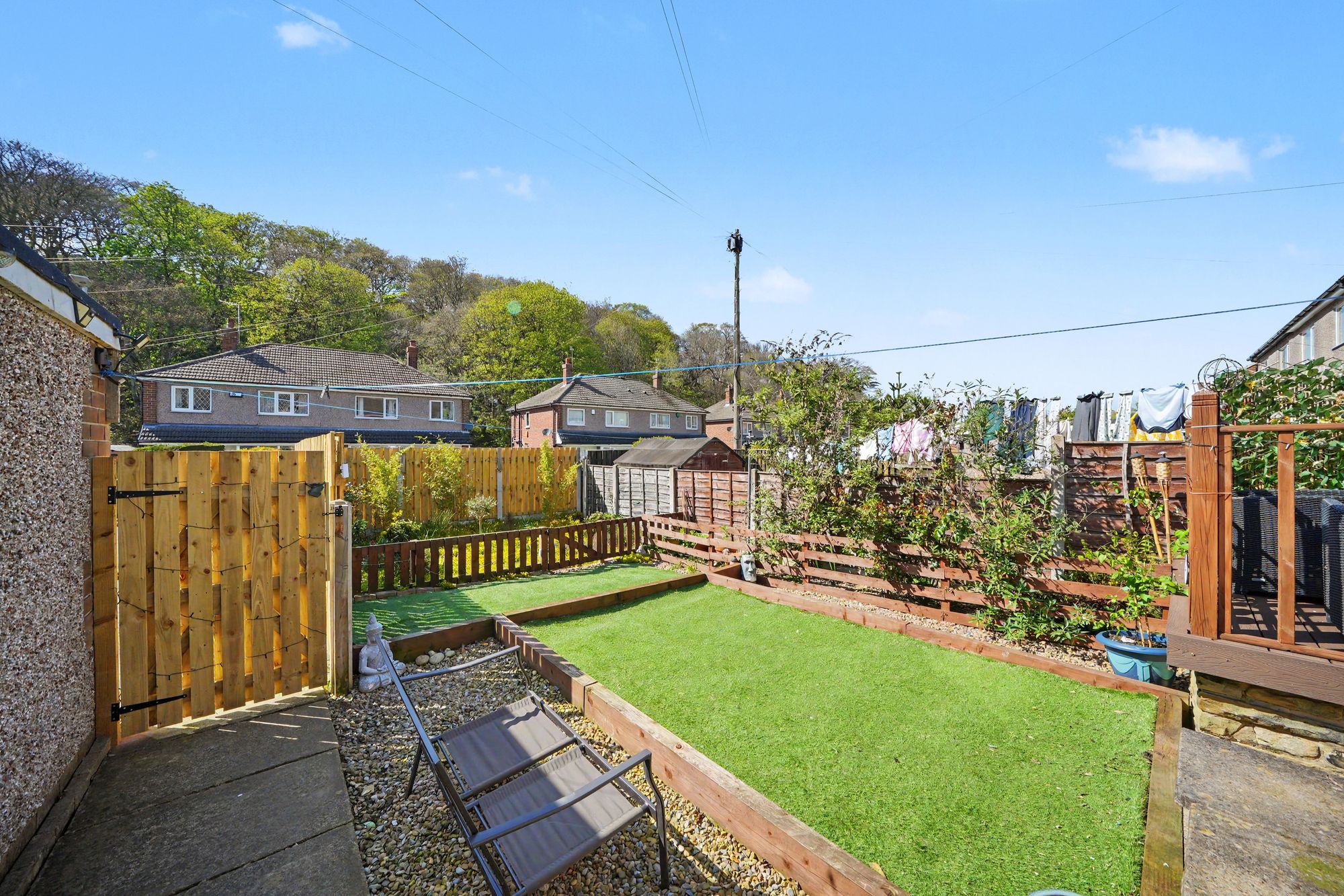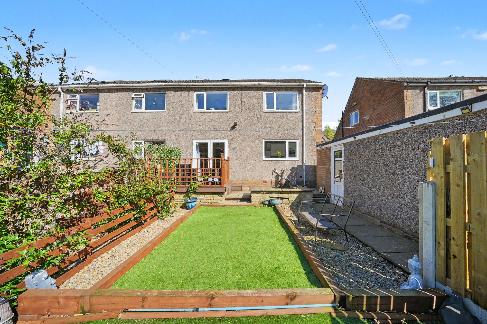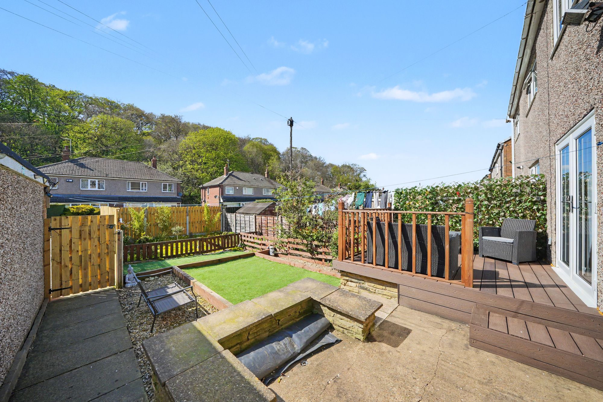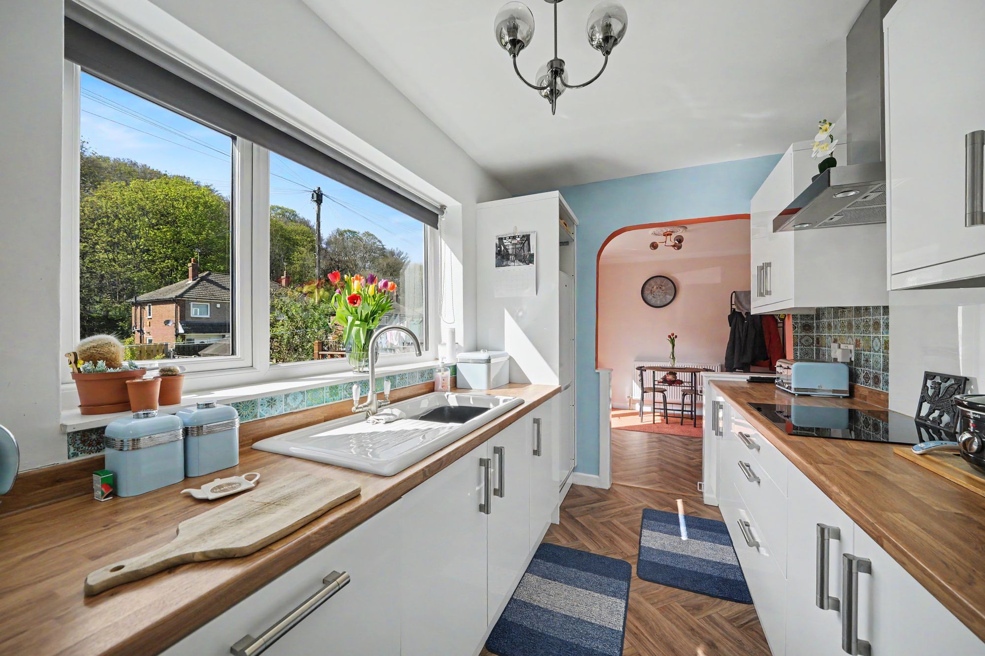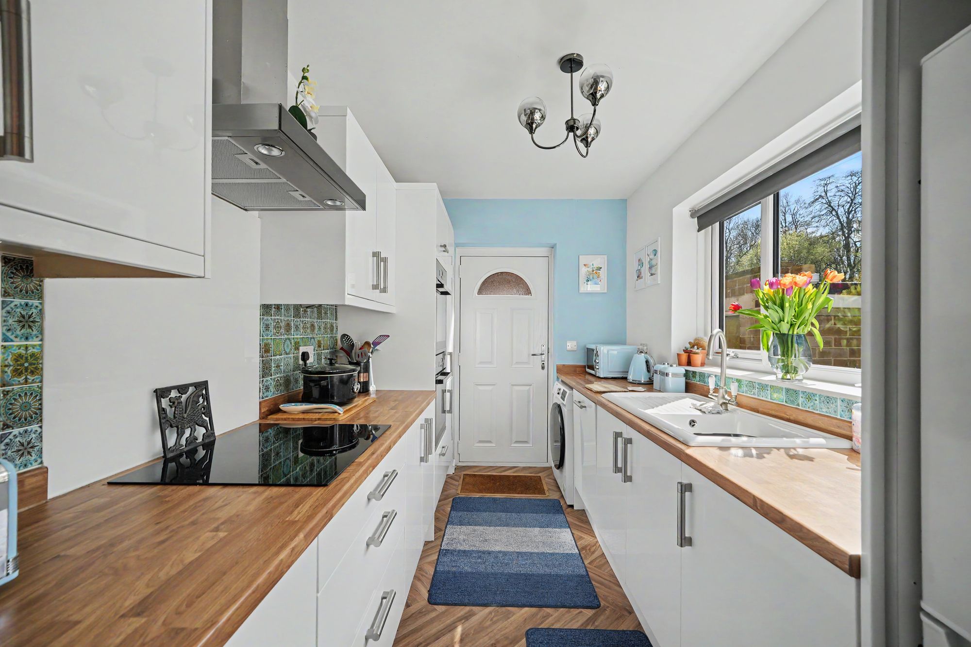 This is accessed from an archway in the dining room and has a uPVC double glazed window looking out over the rear garden together with a composite panelled and frosted double glazed door giving access to the side. There is a ceiling light point, herringbone wood effect vinyl flooring and fitted with a range of white gloss base and wall cupboards with concealed lighting beneath, drawer, pan drawers and these are complimented by brushed stainless steel handles with contrasting overlying timber effect worktops together with silicon Mediterranean style tiled splashbacks, four ring induction hob with stainless steel extractor hood over, twin stainless steel integrated electric fan assisted ovens, integrated dishwasher, under counter space for washing machine, housing for fridge freezer, inset single drainer sink with brushed stainless steel mixer tap and floor matt with hatch to the sub floor.