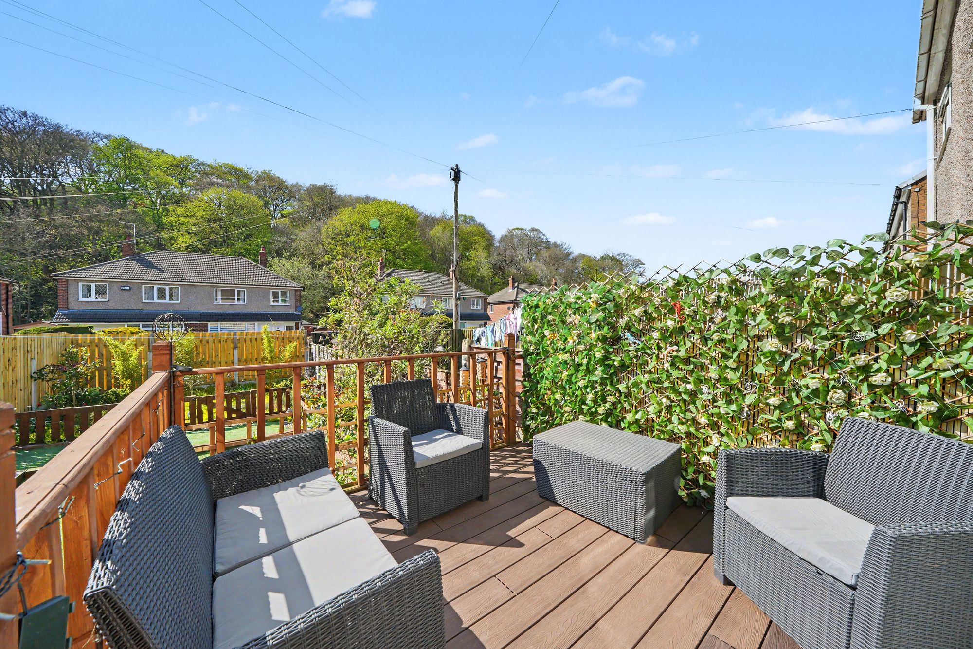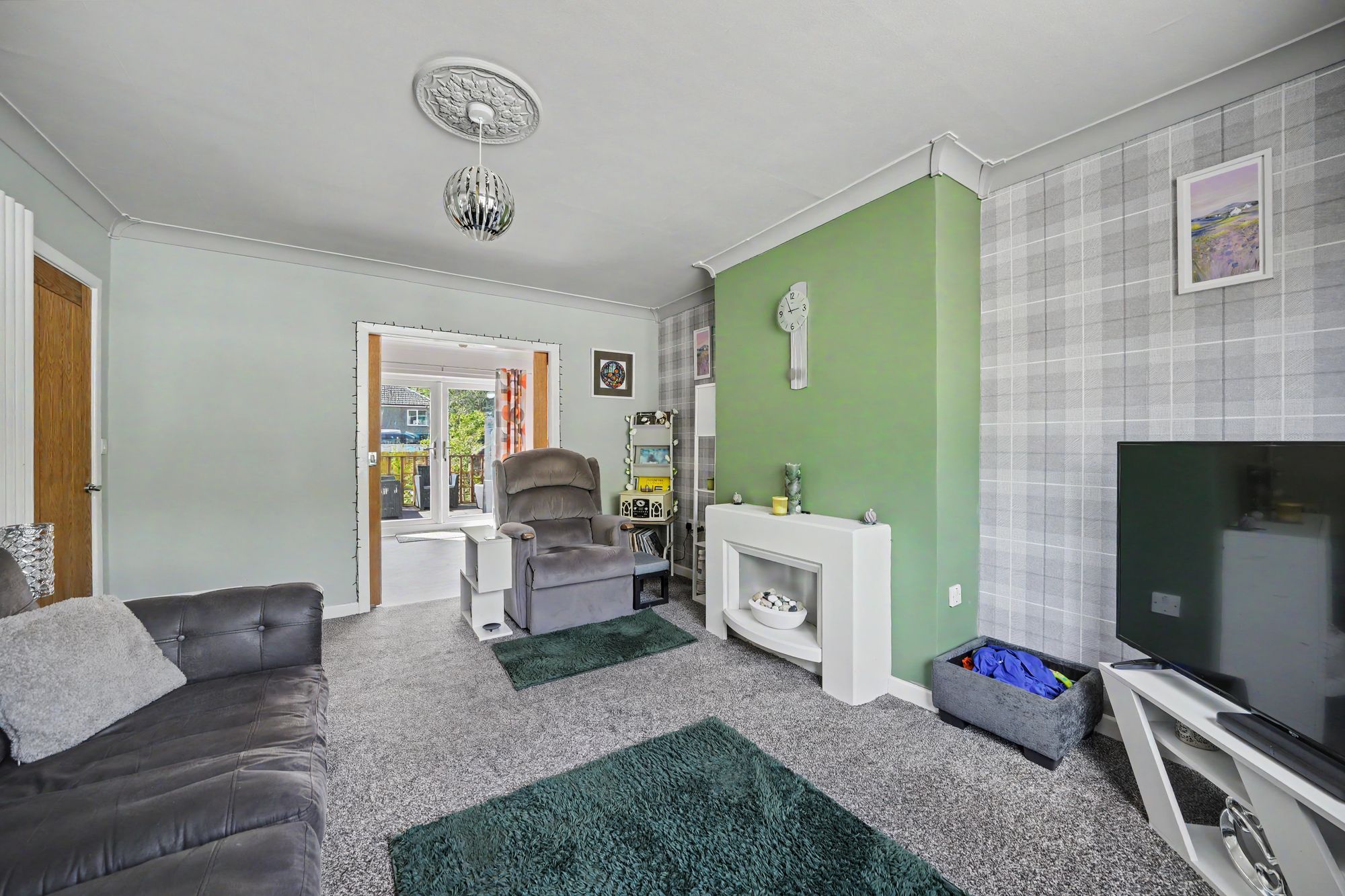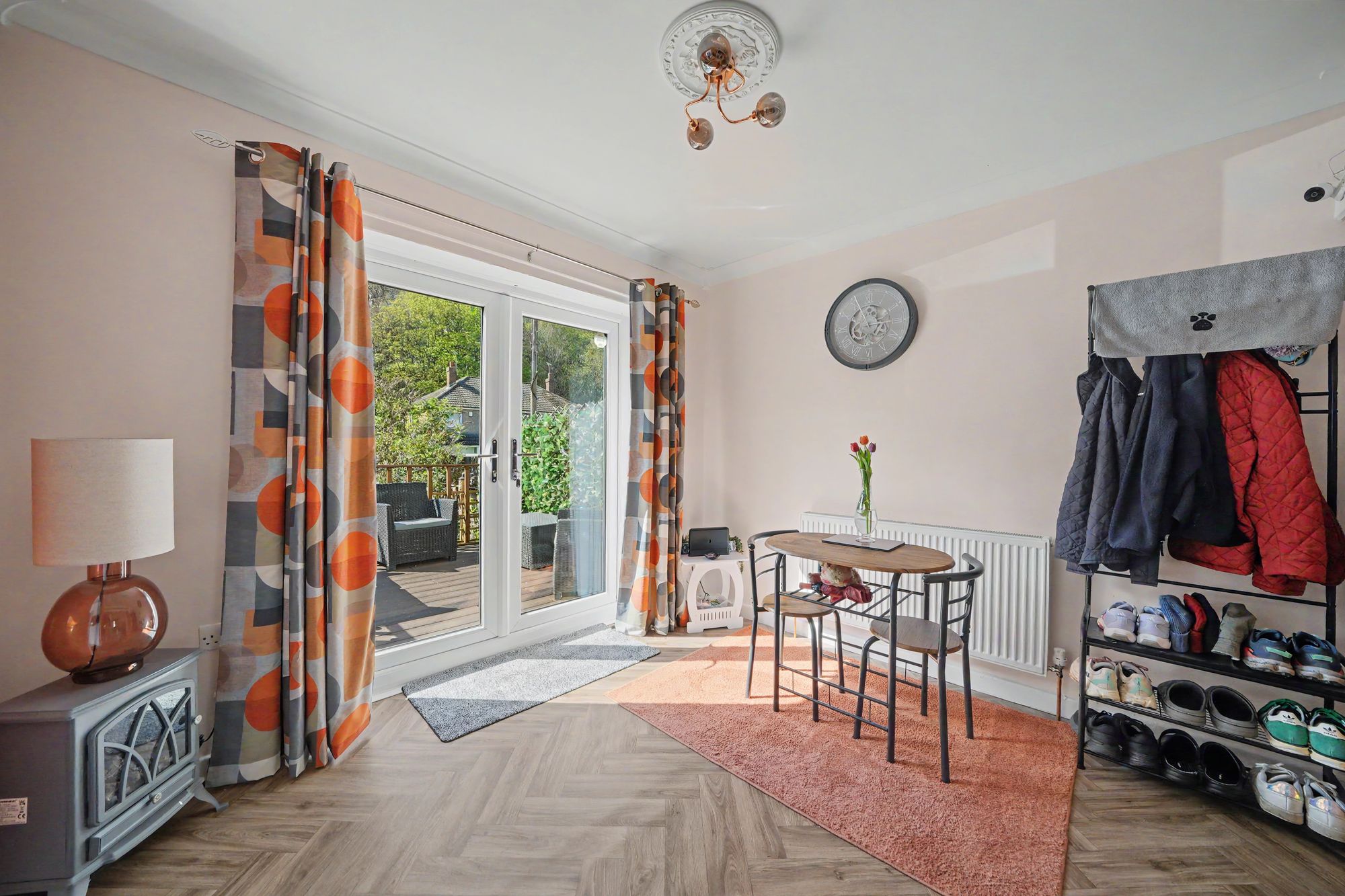 To one side there is a recess with cloaks hanging rail and inset ceiling downlighter. With uPVC double glazed French doors opening on to an area of composite decking, there is a decorative ceiling rose with ceiling light point, ceiling coving, central heating radiator and herringbone wood effect vinyl flooring which continues through into the kitchen.