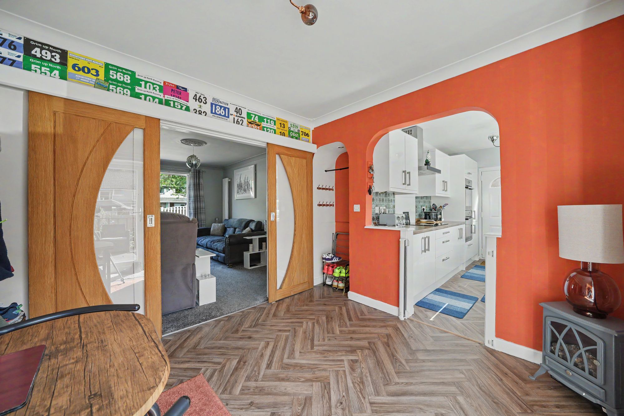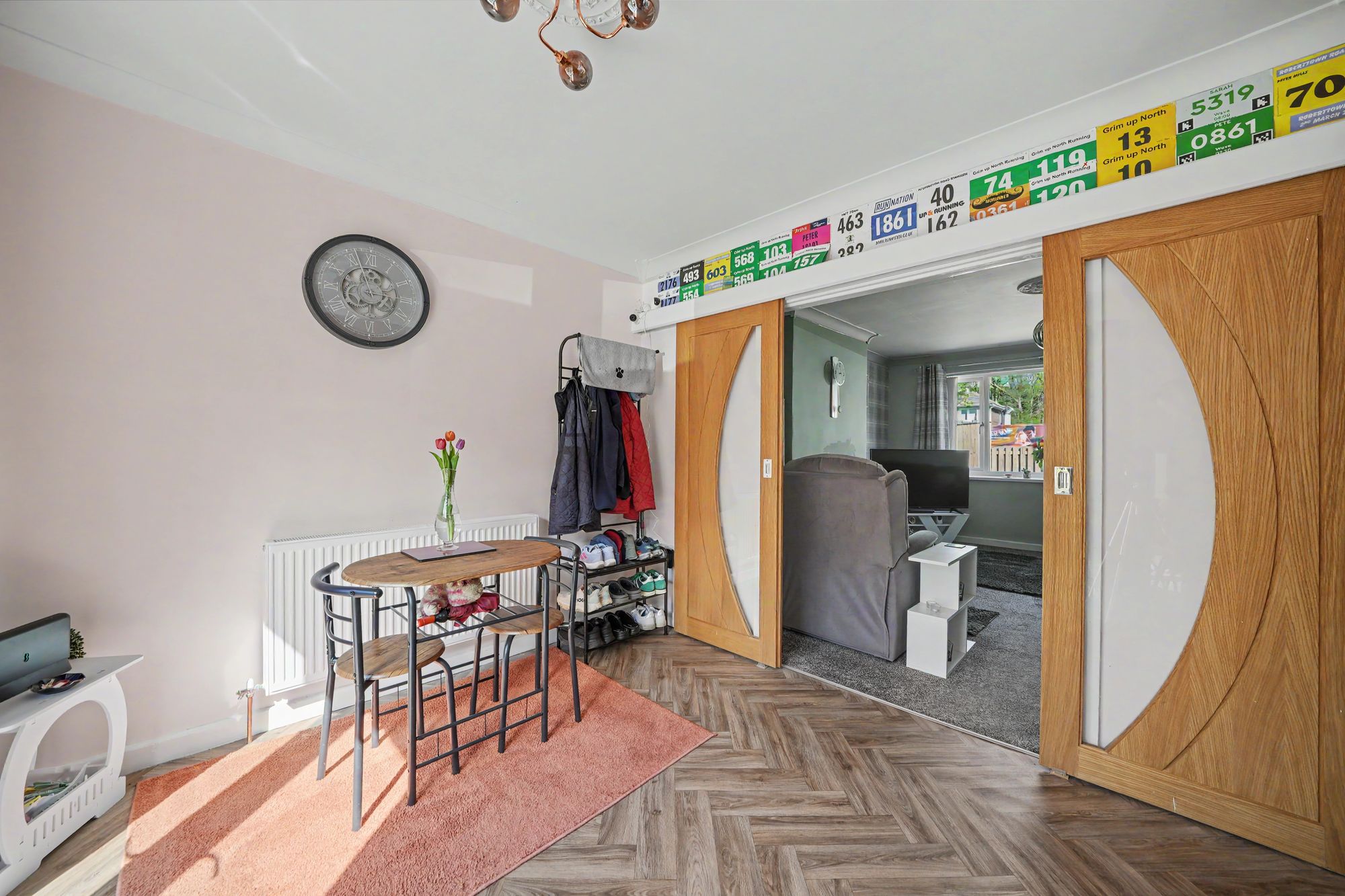 A comfortable and well-proportioned reception room with large uPVC double glazed window looking out over the front garden and providing the room with plenty of natural light. There is a decorative ceiling rose with ceiling light point, ceiling coving, two vertically hung column style radiators and as the main focal point of the room there is a chimney breast and mounted to this there is a fire surround with a pebble electric fire with convector heater. To the rear of the living room twin oak and glazed sliding doors give access to the dining room.