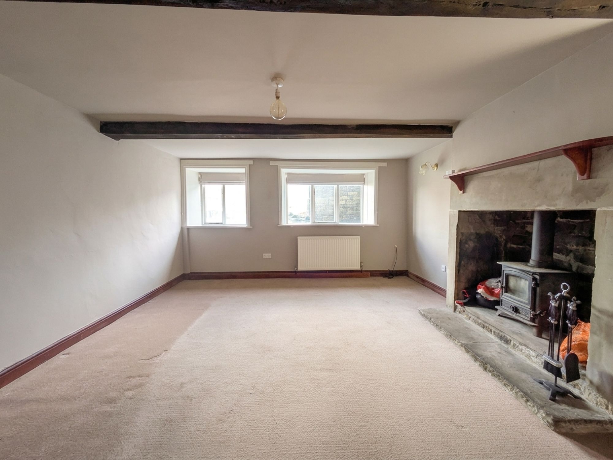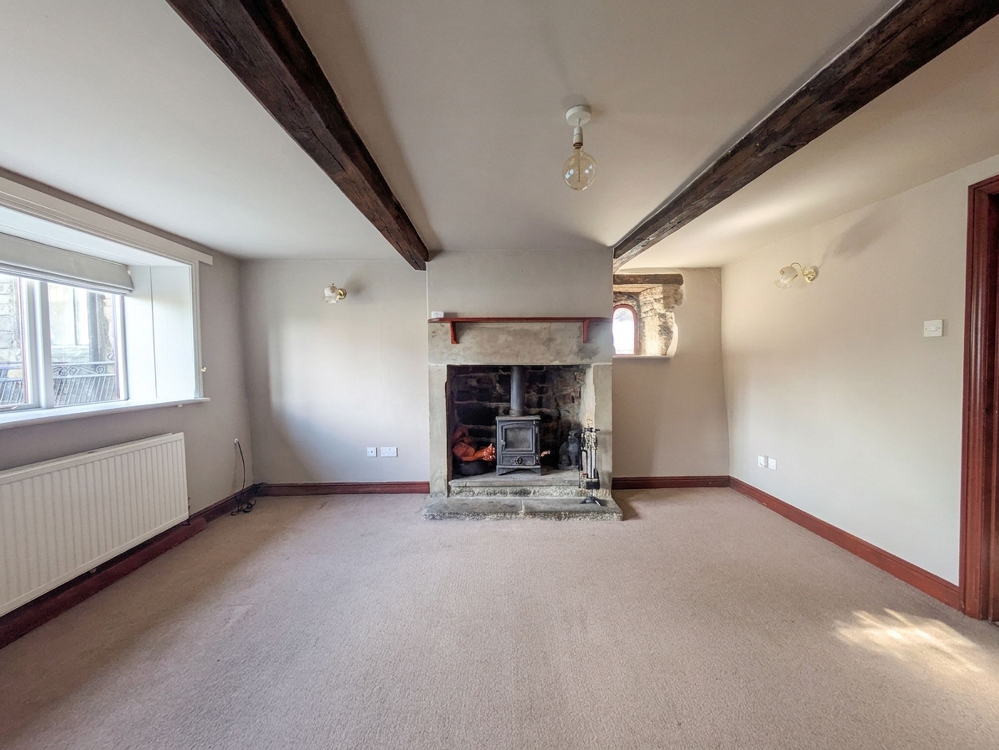 The sitting room is a light and airy, dual-aspect reception room, which features two banks of double-glazed windows to the front elevation and an additional, feature, arched window with stone surround to the side elevation. There is a ceiling light point and two wall light points, a radiator and the focal point of the room is the Ingle Nook, stone fireplace with a cast-iron, Hunter stove which is set upon a raised, stone hearth.