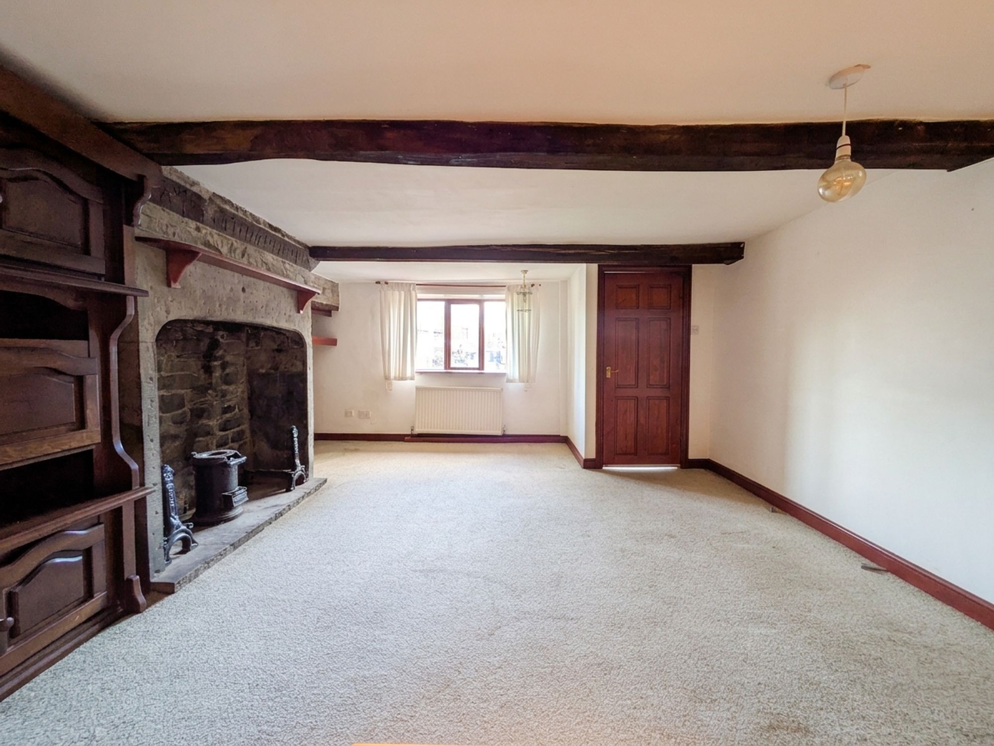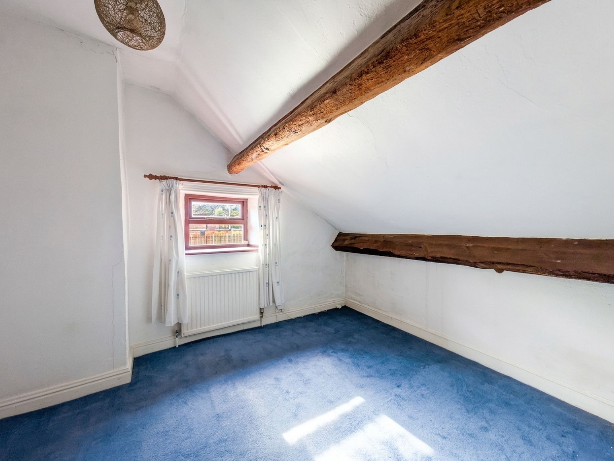 Bedroom three is situated at the rear of the property and can accommodate a double bed with space for free-standing furniture. There are fabulous, exposed timber beams on display, a radiator, a double-glazed window to the side elevation and a ceiling light point.