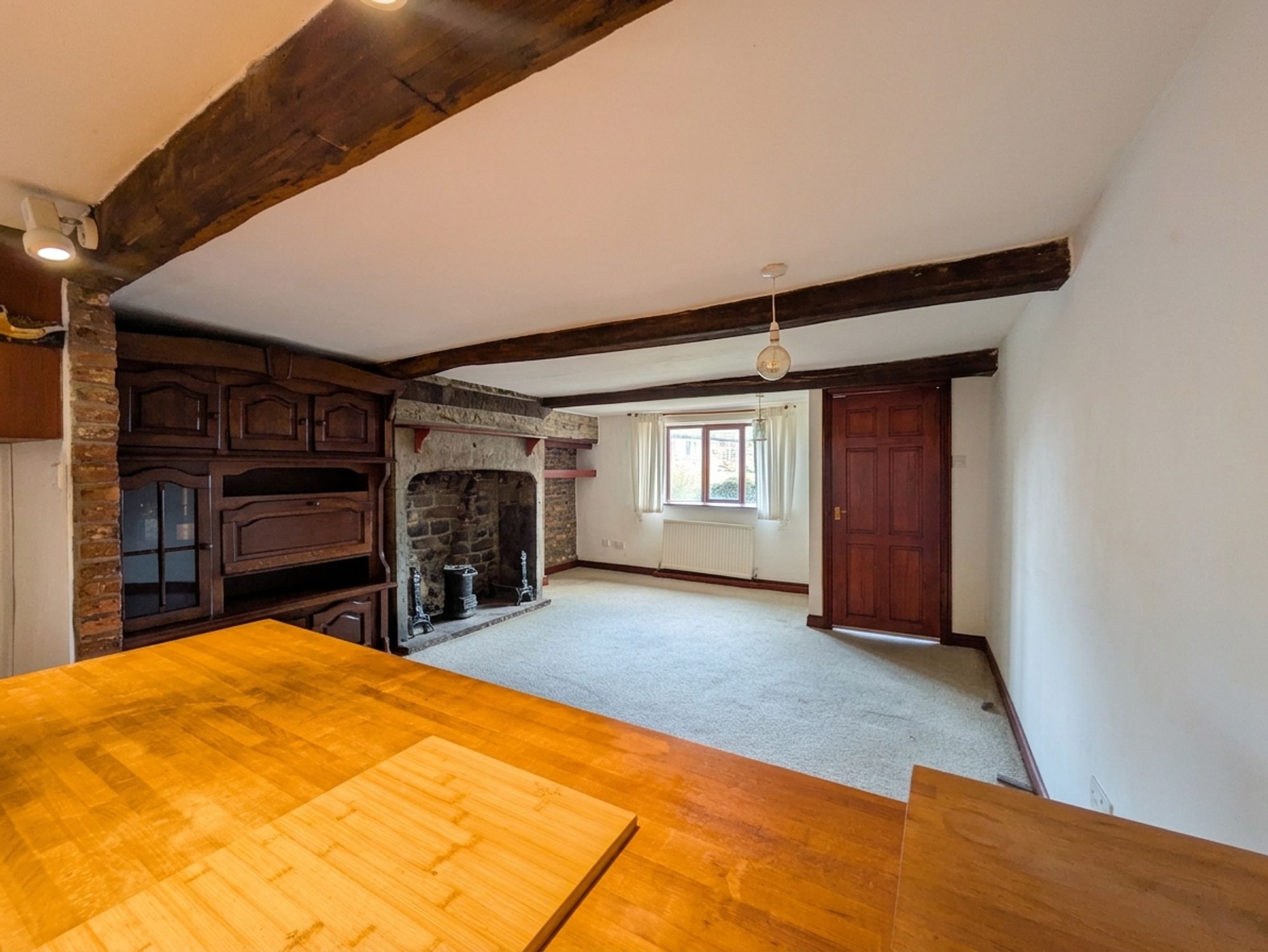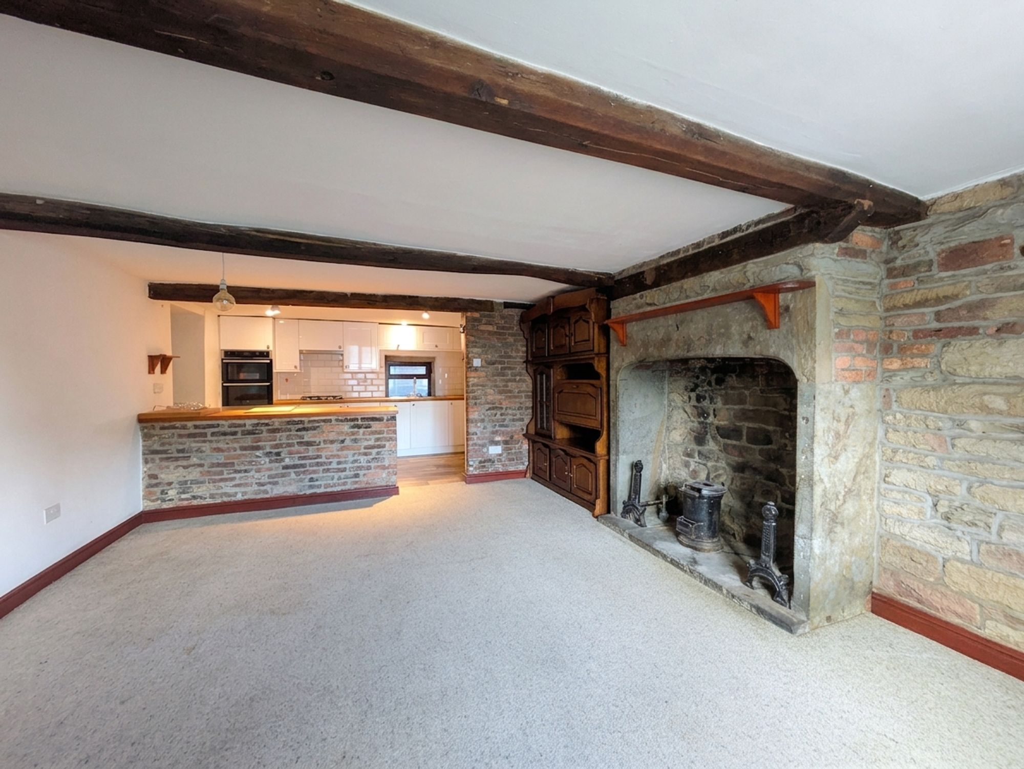 As the photography suggests, the open plan living/dining and kitchen room is brimming with charm and character features with exposed timber beams to the ceiling, fabulous, partly-exposed stone and brick walling and a stunning, focal point, Ingle Nook, stone fireplace with exposed stone cheeks and raised, stone hearth. The living/dining area features a bank of double-glazed, hardwood windows to the front elevation and two ceiling light points. The living/dining area then seamlessly leads into the kitchen.