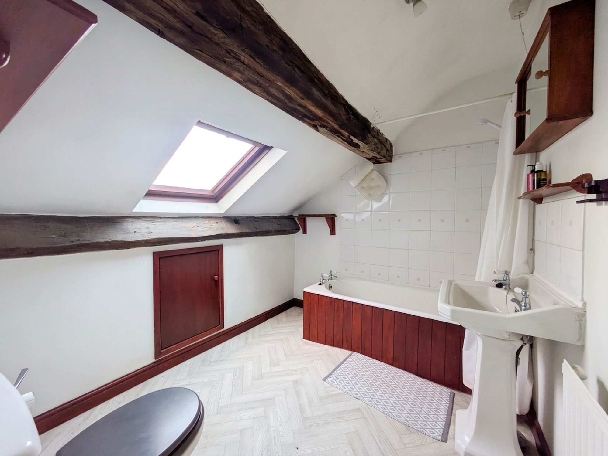 The bathroom features a white, three-piece suite which comprises of a panelled bath with electric Mira Jump shower over, a traditional, pedestal wash handbasin and a low-level WC. The bathroom has a radiator, ceiling light point, fabulous, exposed timber beams on display, a cupboard with useful, under-eaves storage and a skylight window to the rear elevation providing a wealth of natural light.