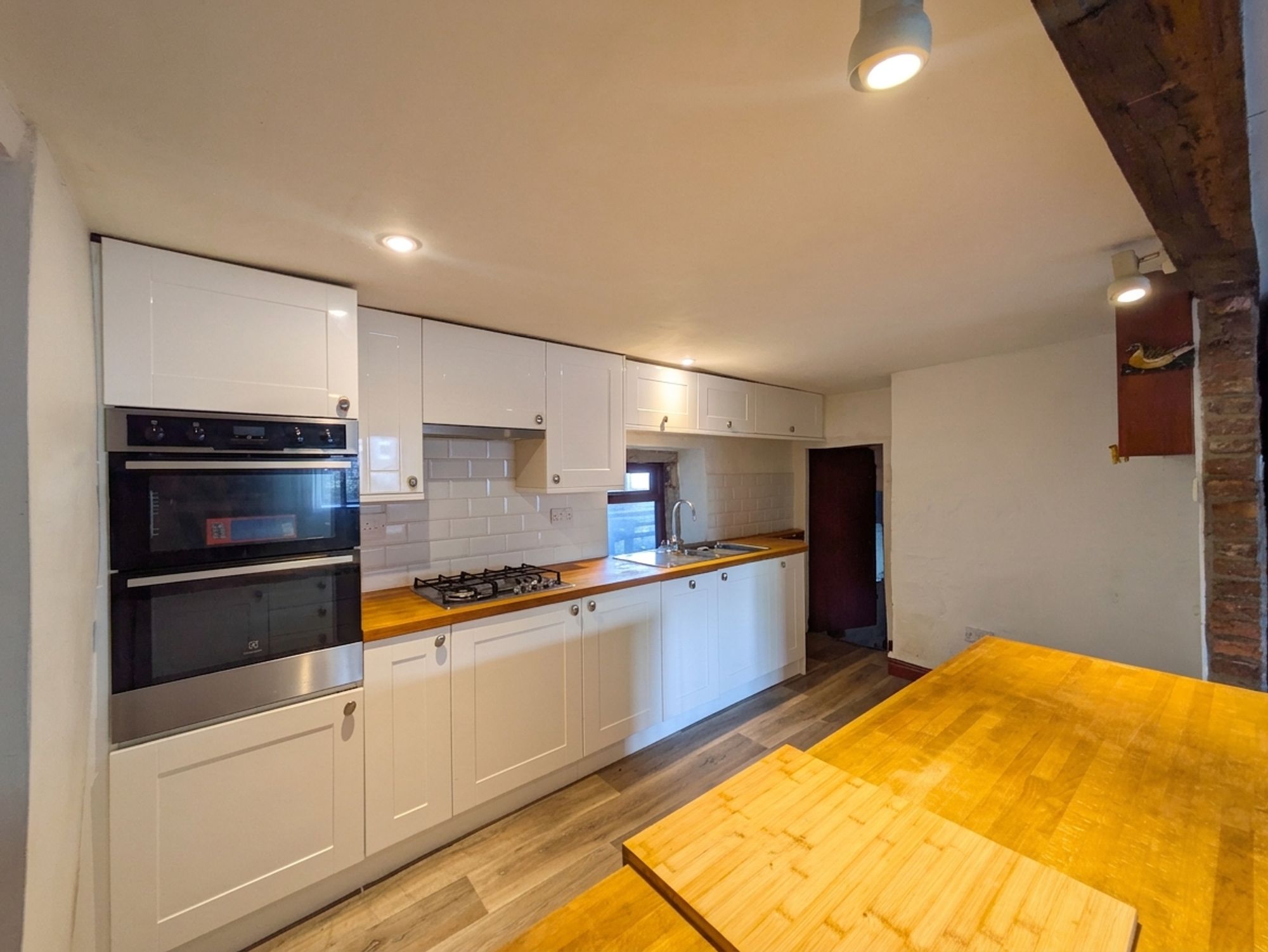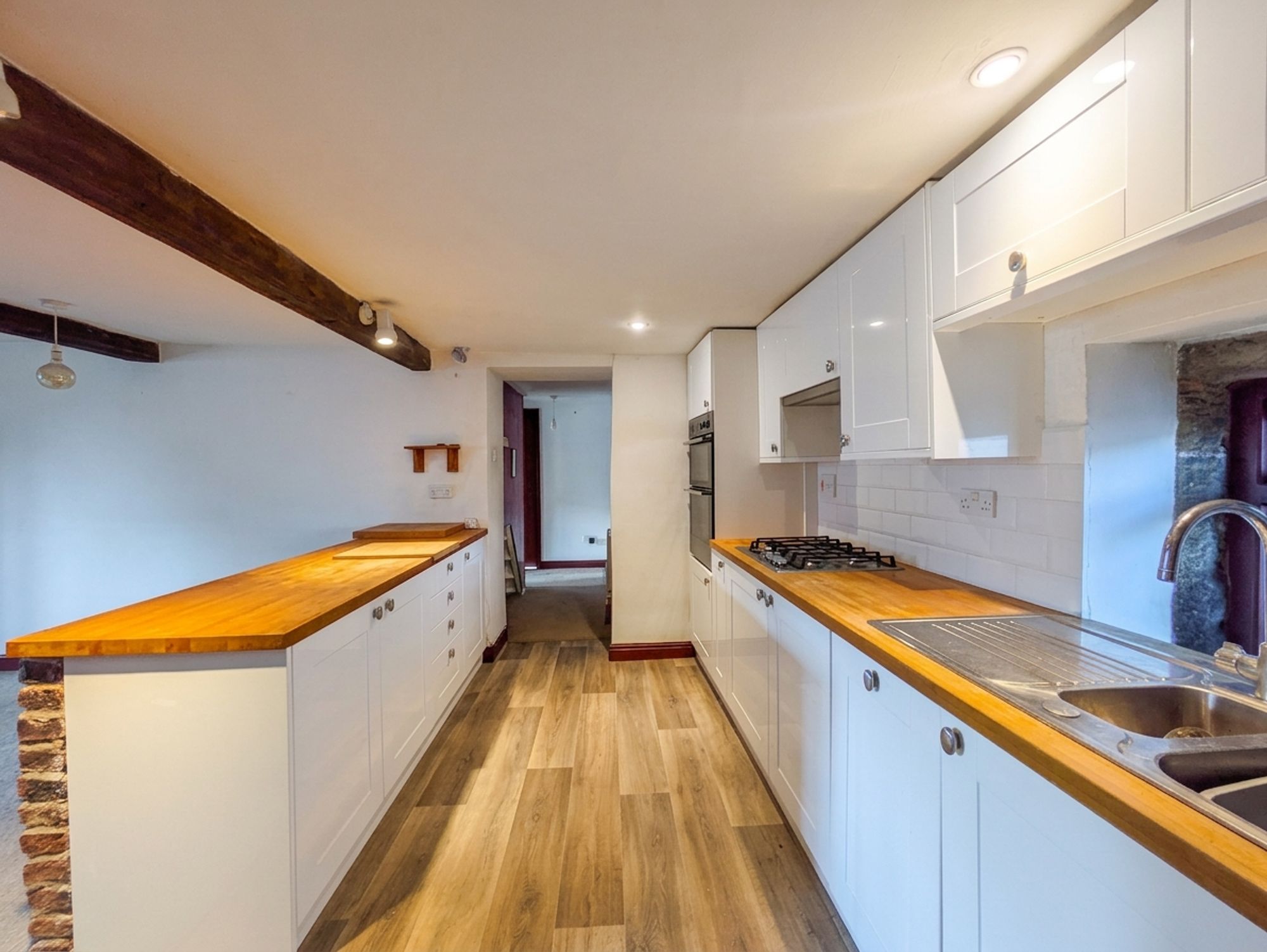 The kitchen features a wide range of wall and base units with high gloss, Shaker-style cupboard fronts and with complementary solid wood, work surfaces over, which incorporate a one-and-a-half-bowl stainless steel sink and drainer unit with chrome mixer tap. The kitchen is equipped with built-in appliances, with includes a four-ring, gas hob with integrated cooker hood over and a built-in, shoulder-level double oven. There is plumbing and provisions for an integrated dishwasher. The kitchen area features laminate style, vinyl flooring. There is inset spot lighting to the ceiling as well as two wall-mounted light points, a cottage-style door leads to the utility cellar and there is a radiator and double-glazed window with tiled sill to the rear elevation. A doorway then leads into the inner hallway.