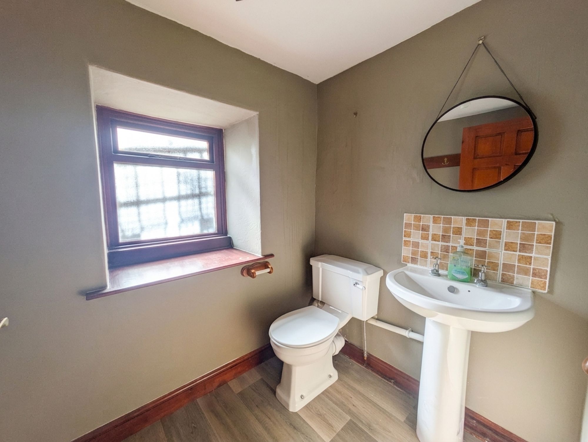 DOWNSTAIRS WCThe downstairs WC features a white two-piece suite, which comprises of a low-level WC, pedestal wash handbasin with tiled splashback. There is a double-glazed, hardwood window with obscure glass to the side elevation, a ceiling light point and radiator.