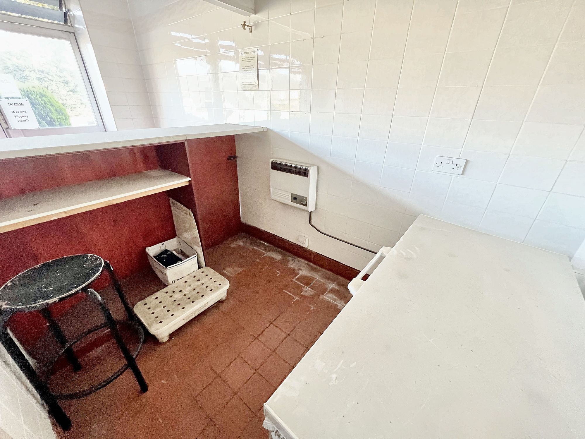 15’7” x 6’4” / Rear area 6’10” x 15’7” / Entirety 15’7” x 13’9” There is a double-glazed aluminium door to the front elevation providing access to the front of house where there is terracotta tiled flooring, tiled walls and adjoining aluminium windows to the front elevation, providing a great deal of natural light. A counter then divides the back of house where the terracotta tiled flooring continues through again with tiled walls, various plug points and fluorescent ceiling light points. There is a gas-powered wall mounted heater. A door then proceeds to the kitchen.
