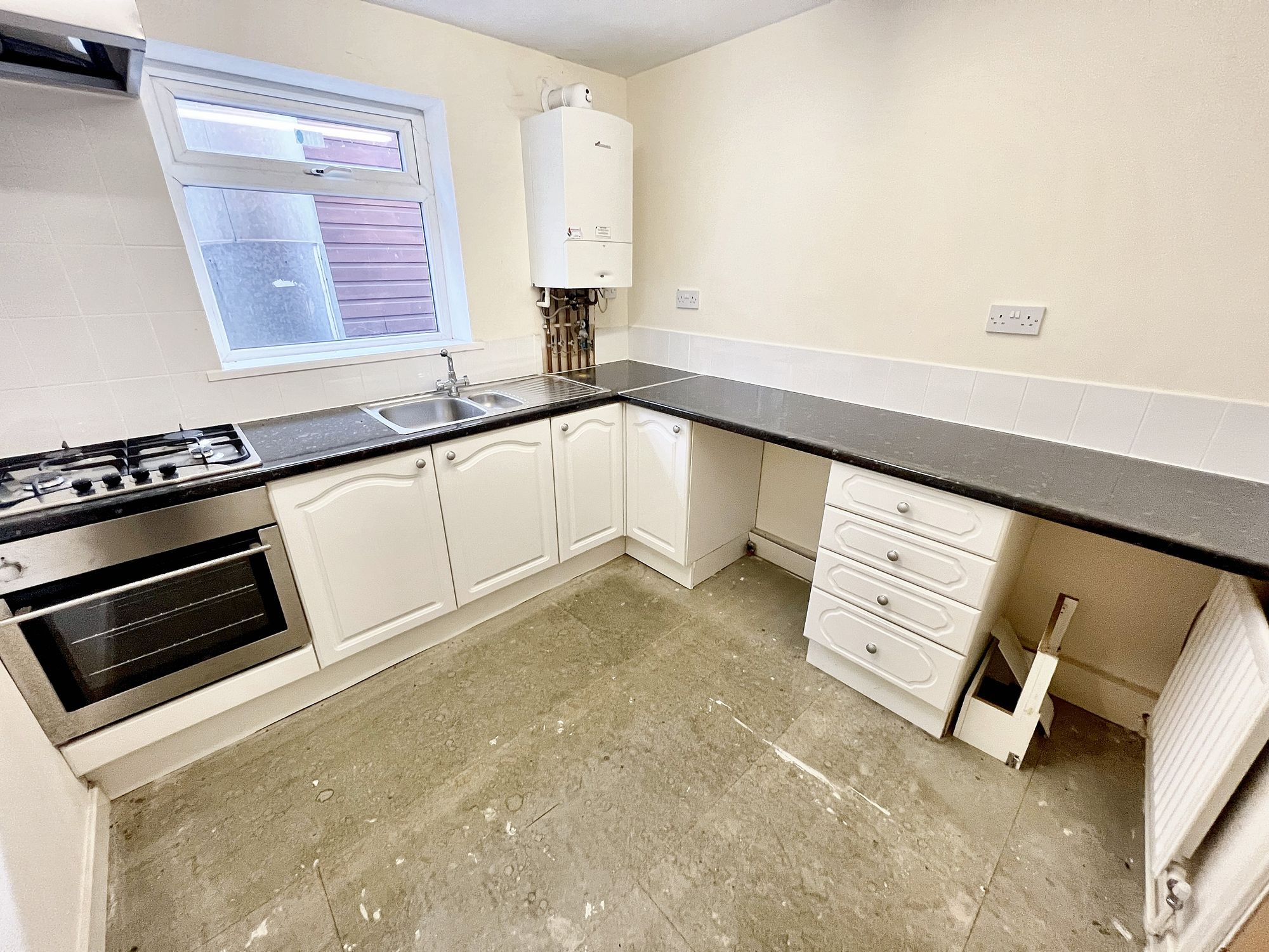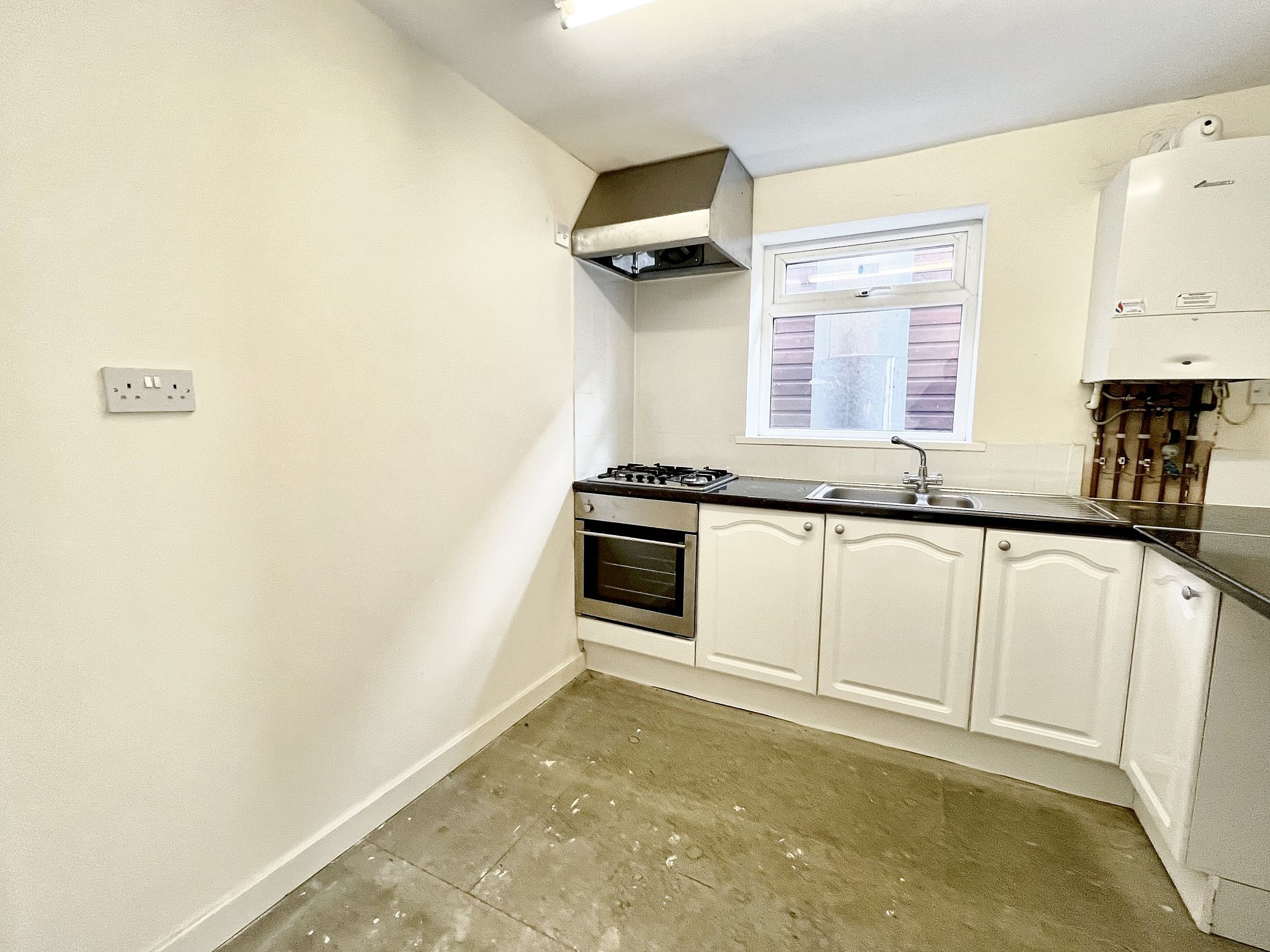 The kitchen features a range of fitted base units with shaker style cupboard fronts and with complementary rolled edge work surfaces over which incorporates a one-and-a-half bowl stainless steel sink and drain unit with chrome mixer tap. The kitchen is equipped with a four-ring gas hob with extractor fan above, a built-in electric oven and space and provisions for an automatic washing machine. There is a fluorescent ceiling light point, tiling to the splash areas, a radiator and a double-glazed window to the side elevation. Additionally, the kitchen houses the property combination boiler.