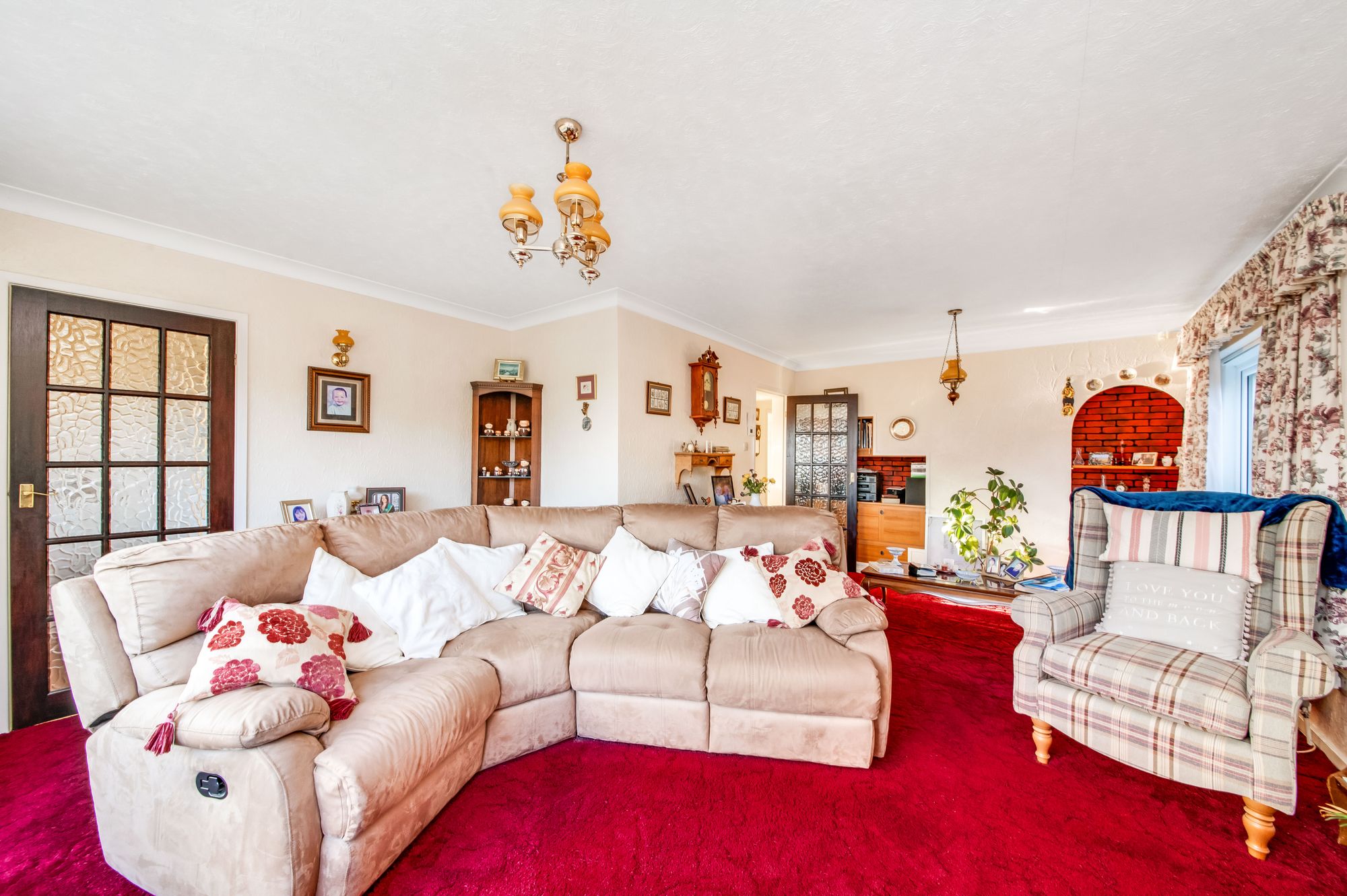 As the photography suggests, the open-plan living and dining room is a generously proportioned, light, and airy dual-aspect reception room. It features a bank of double-glazed windows to the front elevation and a further bank of windows to the side elevation. The room includes decorative ceiling coving, two ceiling light points, three wall light points, and two radiators. The focal point is the electric fireplace with a timber mantel surround and raised hearth. Recessed alcoves feature brick inlays with display shelving, complemented by a bank of bespoke cabinets with drawers, providing a significant amount of additional storage. A multi-panel timber and glazed door then leads back into the breakfast kitchen.