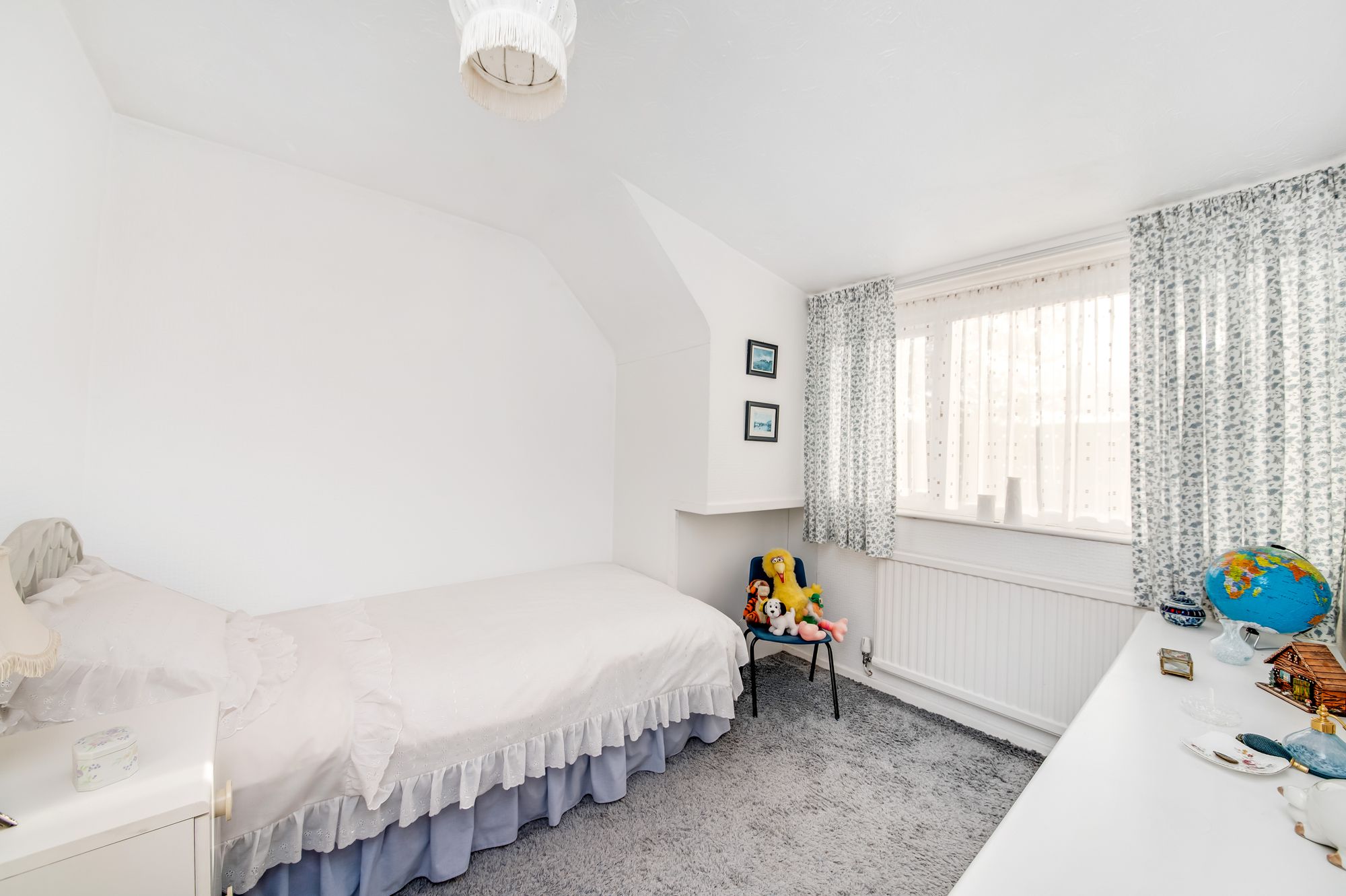 Bedroom three can accommodate a single bed and offers ample space for freestanding furniture. A bank of double-glazed windows to the side elevation provides natural light, and the room also features a ceiling light point and a radiator.