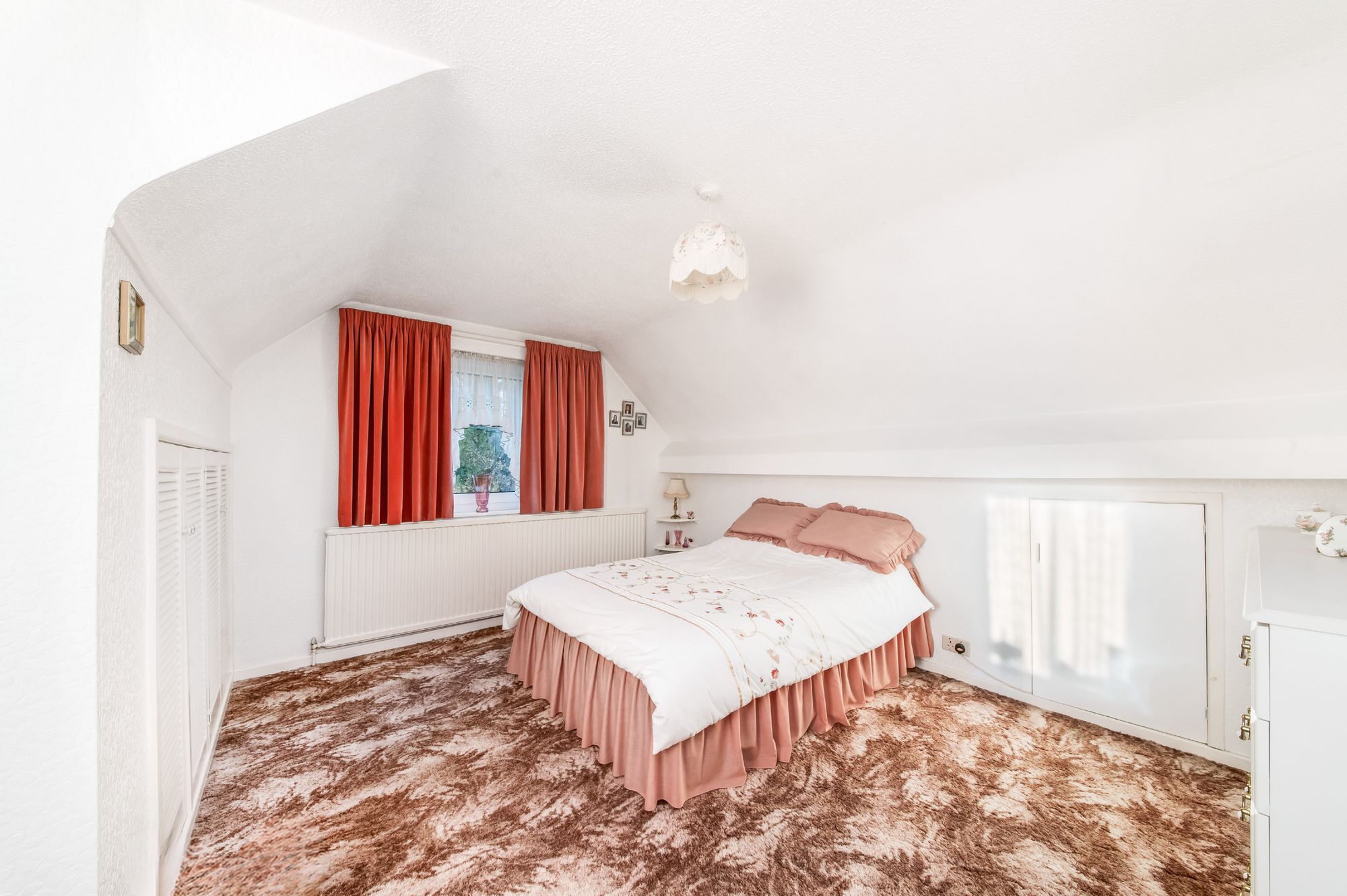 Bedroom one is a generously proportioned double bedroom with dual-aspect windows to the rear and side elevations, taking advantage of the pleasant tree-lined outlooks. The room features a ceiling light point, a radiator, and two access points to useful under-eaves storage cupboards.