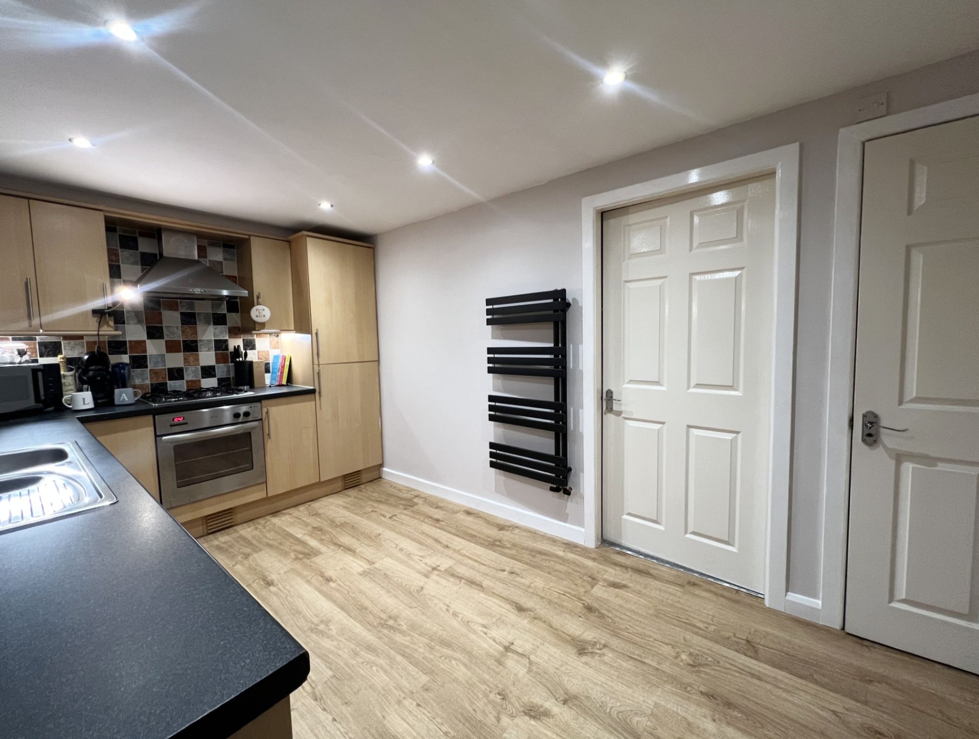 Enter the property through a double-glazed composite front door with obscure glazed inserts into the entrance. There is high quality flooring and a staircase rises to the first floor with wooden banister. There is an insert spotlight to the ceiling and the multi panel door proceeds to the dining kitchen.