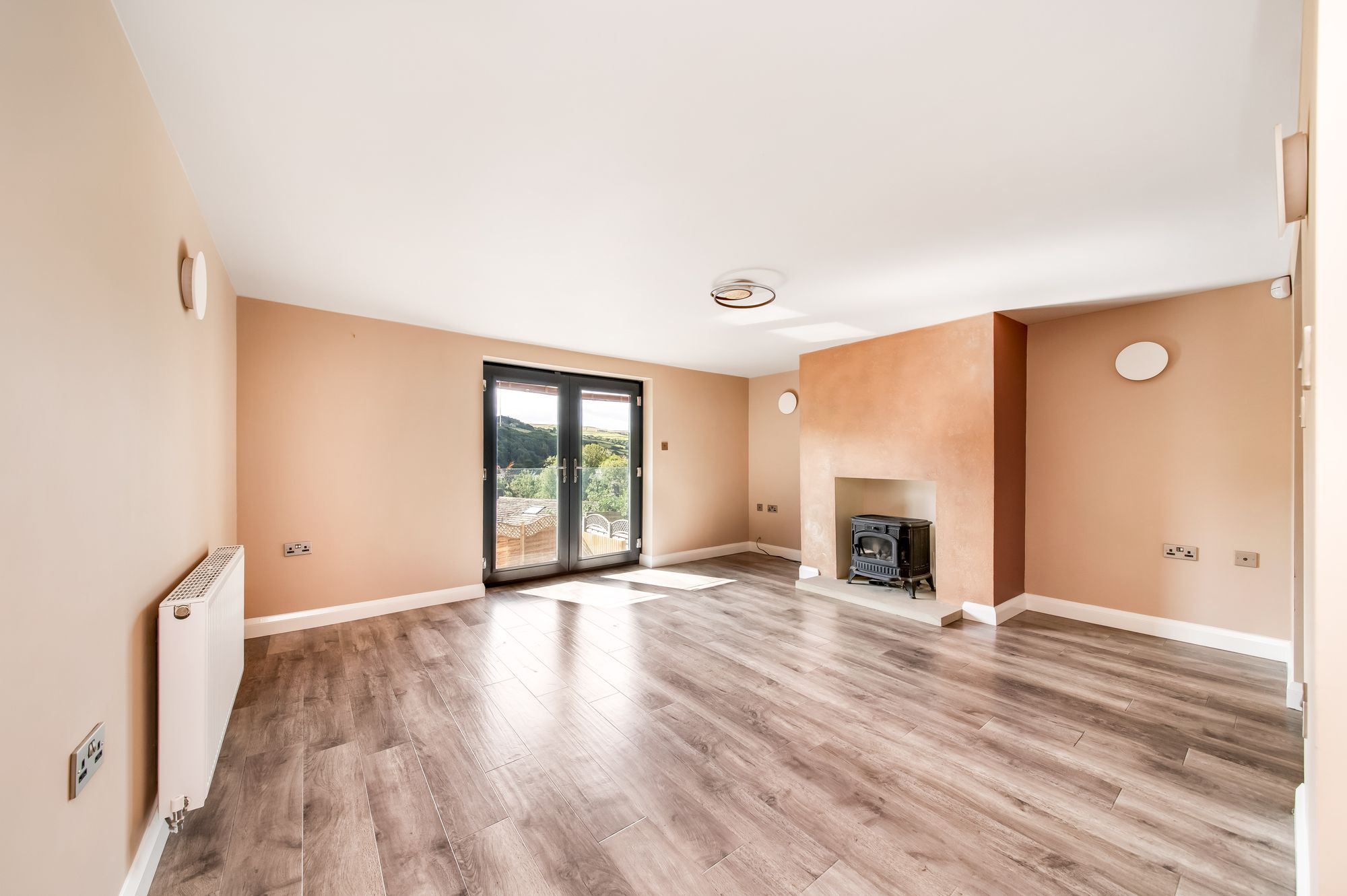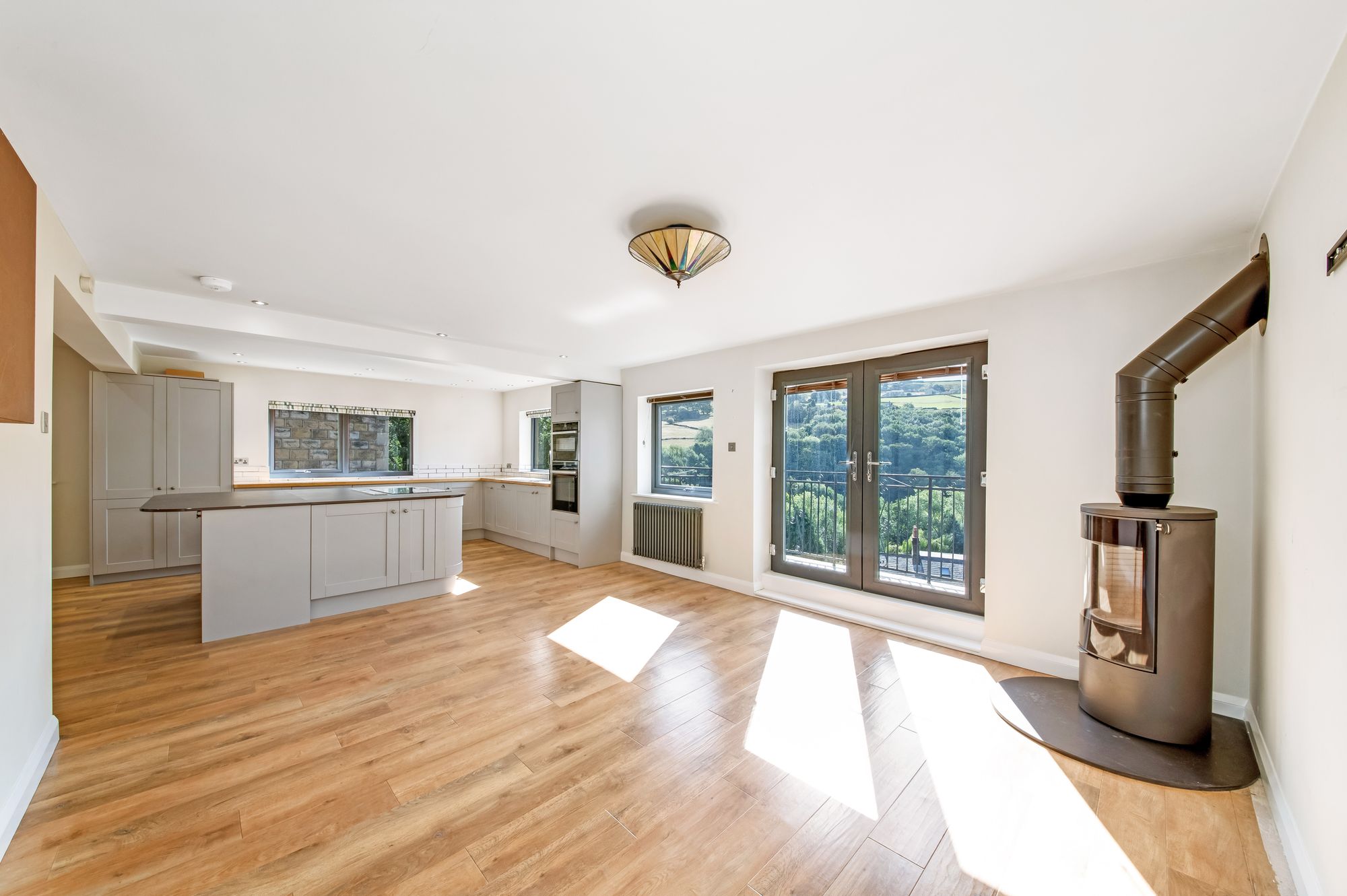 As the photography suggests the living area takes full advantage of the elevated position of the property with breath taking panoramic views across the valley and towards Holme Moss. There is a double-glazed window to the rear elevation and double-glazed French doors with integrated blinds which open out onto the balcony. The high-quality flooring continues through from the kitchen area and the living area features a central ceiling light point, a cast iron column radiator and the focal point of the room is the beautiful log burning stove with clear viewing glass set upon a raised granite hearth.