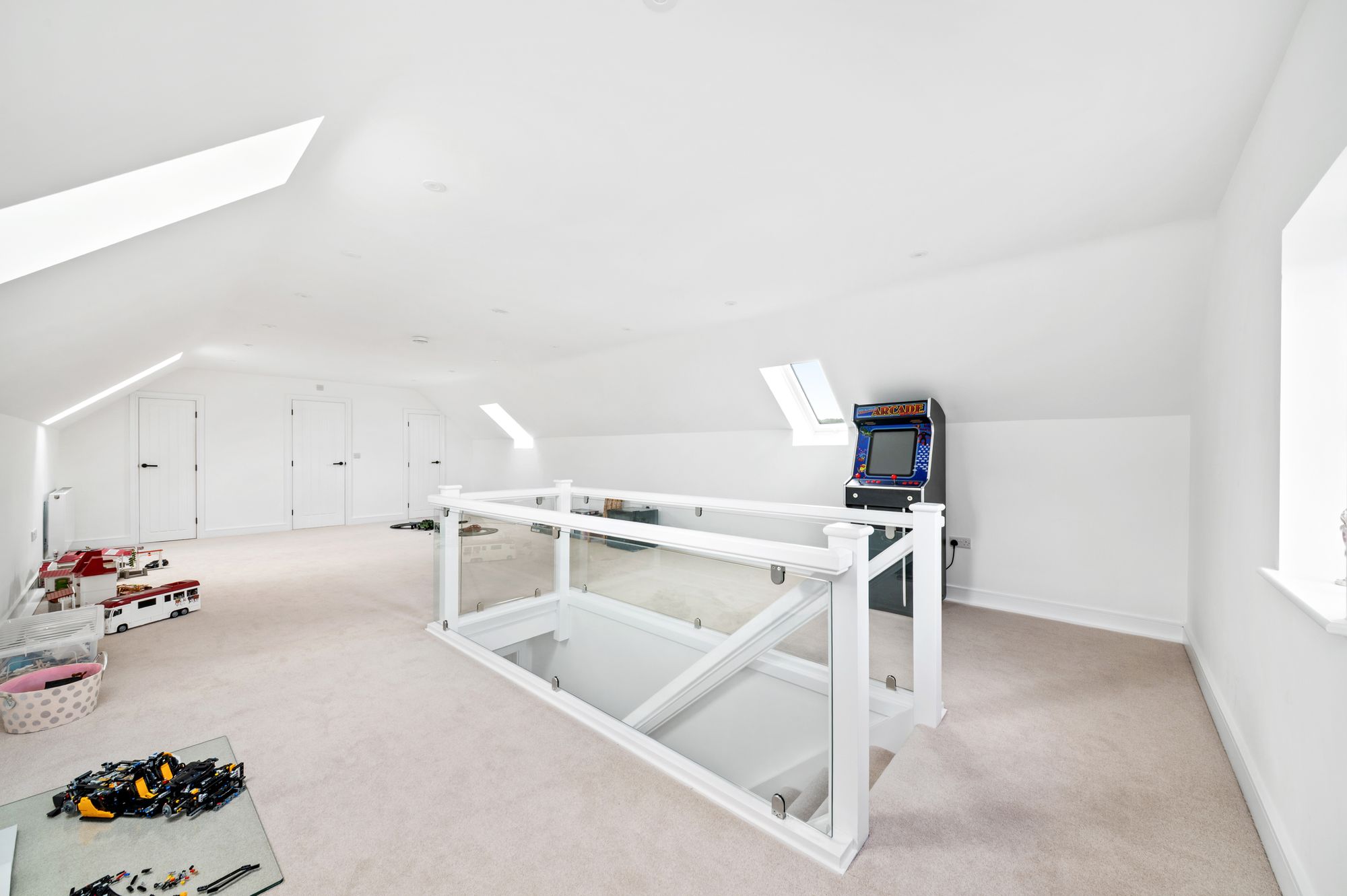 Taking the staircase from the first-floor landing, you reach the second-floor playroom, which is a more spacious, light and airy room with triple aspect windows, two skylight windows to the front and two to the rear and an additional double-glazed window to the side elevation. The room is currently utilised as a family room come games room and has ample plug points, two radiators and doors provide access to two useful storage cupboards and one to a central ensuite shower room. The room can be utilised as a double bedroom, should it be required.