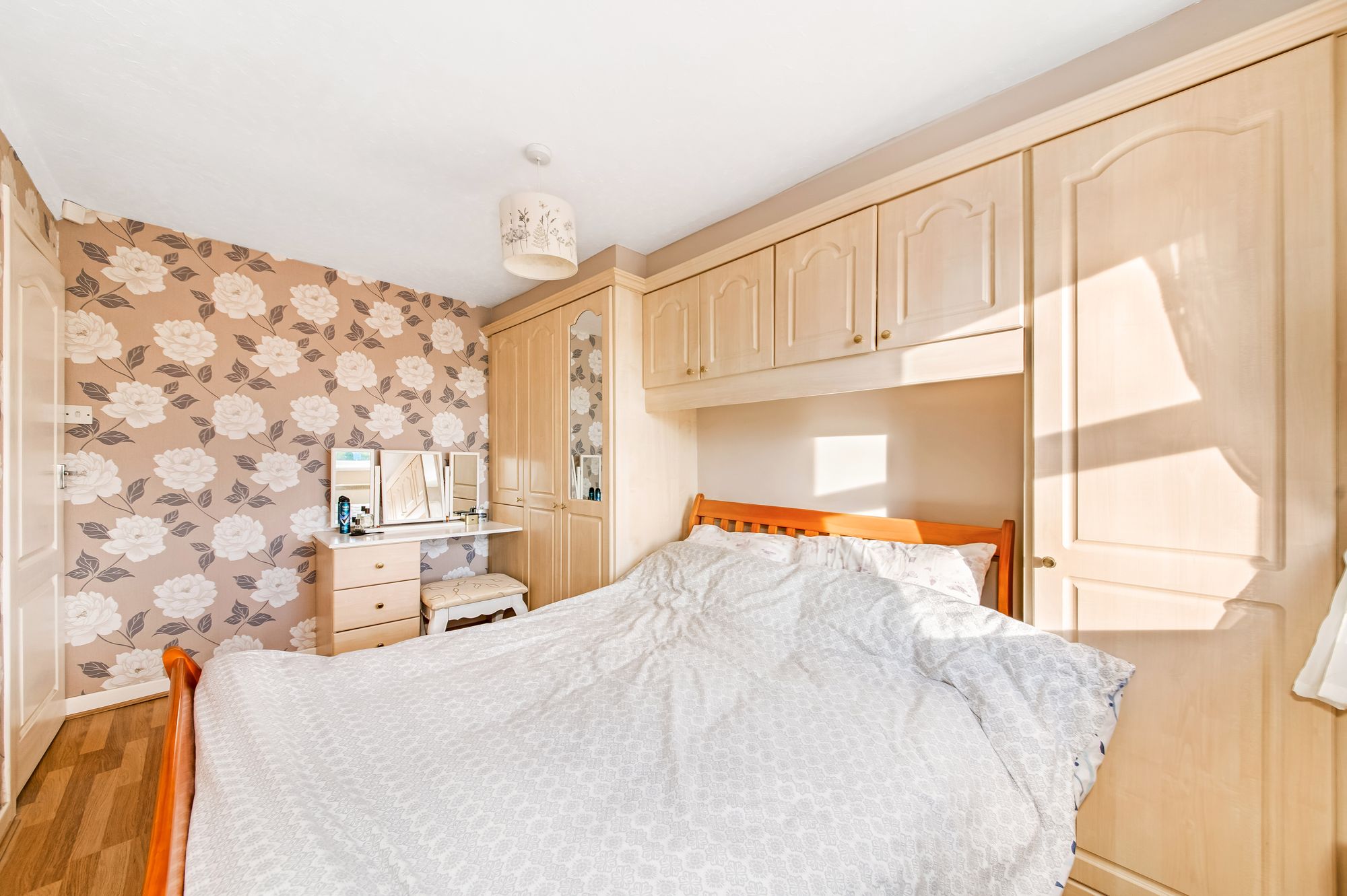 Bedroom two enjoys a great deal of natural light and can accommodate a double bed with space for freestanding furniture. There is laminate flooring, a ceiling light point, a double-glazed window to the front elevation, again taking full advantage of pleasant open aspect views. Additionally, there is a wall mounted storage heater and a bank of fitted wardrobes with hanging rails and shelving in situ.