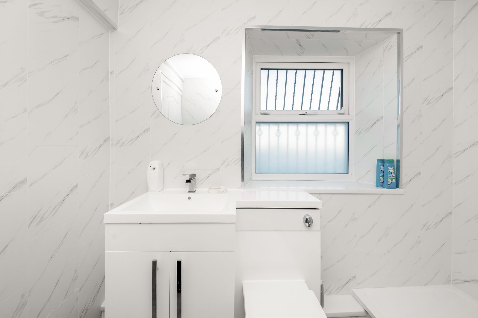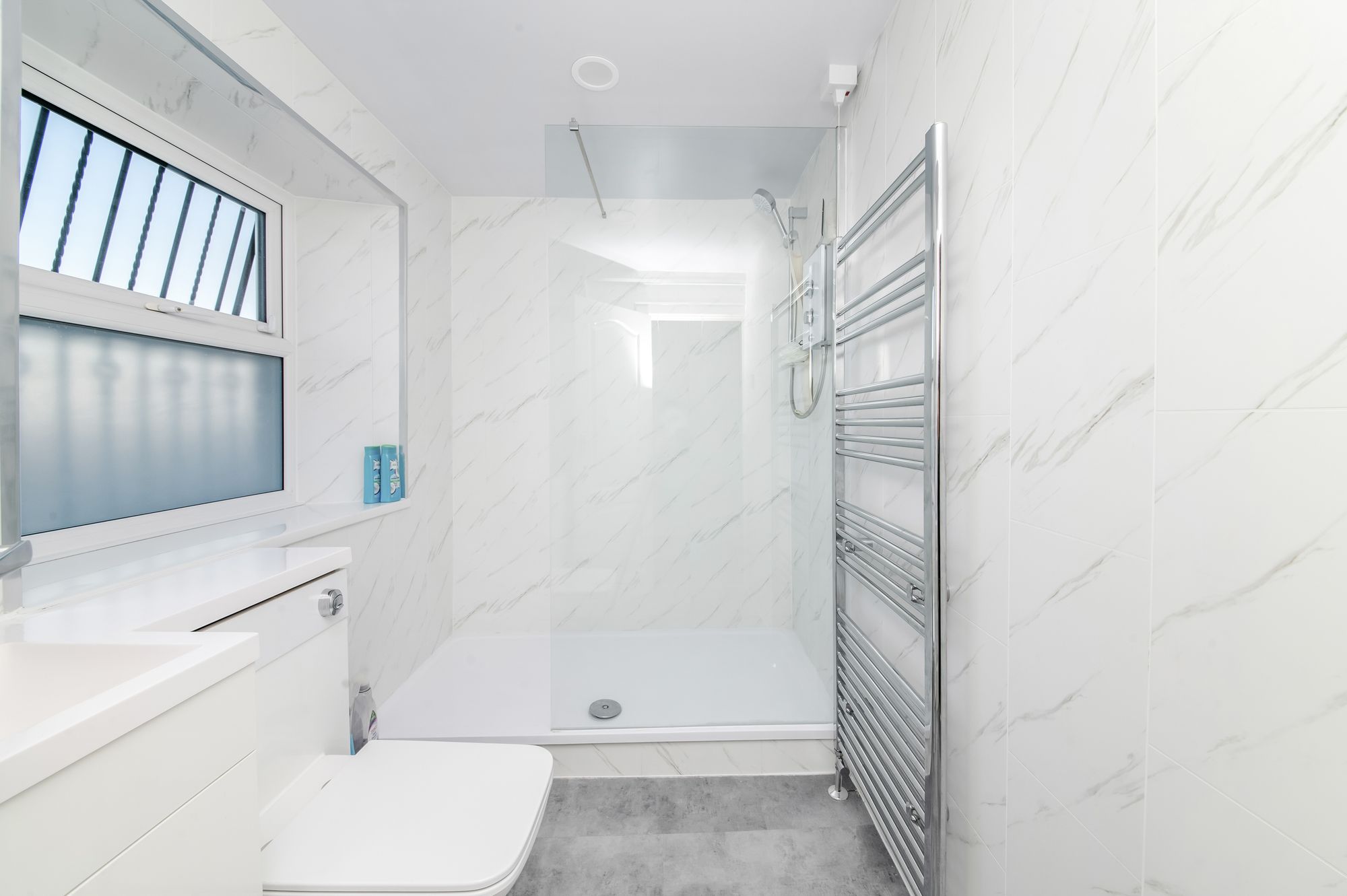 The shower room features a modern contemporary three-piece suite, which comprises of a fixed frame shower cubicle with electric Mira decor shower, a low-level WC with concealed cistern and push button flush, which incorporates a broad wash hand basin with vanity cupboards beneath, and cascading waterfall mixer tap. There is tile effect vinyl flooring, attractive marble effect wall panelling, a panelled ceiling with inset spotlighting and a wall mounted chrome ladder style radiator. Additionally, the shower room has a double-glazed window to the rear elevation with part obscure glazed inserts which offers fabulous panoramic open aspect views across the valley.