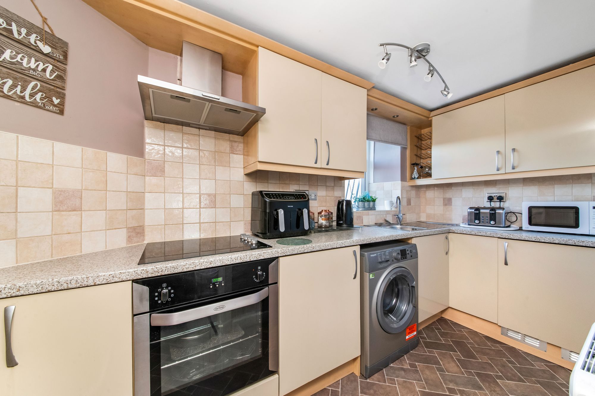 The kitchen features a range of fitted wall and base units with high gloss cupboard fronts and with complimentary work surfaces over which incorporates a single bowl stainless steel sink and drainer unit with chrome mixer tap. The kitchen is equipped with built-in appliances, which includes a four-ring ceramic hob with canopy style cooker hood over and a built-in electric fan assisted oven. There is an integrated under counter fridge unit and a built-in under counter freezer, plumbing and provisions for an automatic washing machine and a pantry cupboard situated under the stairs. Additionally, there is tiling to the splash areas, a ceiling light point, a wall mounted electric heater and a double-glazed window to the rear elevation.