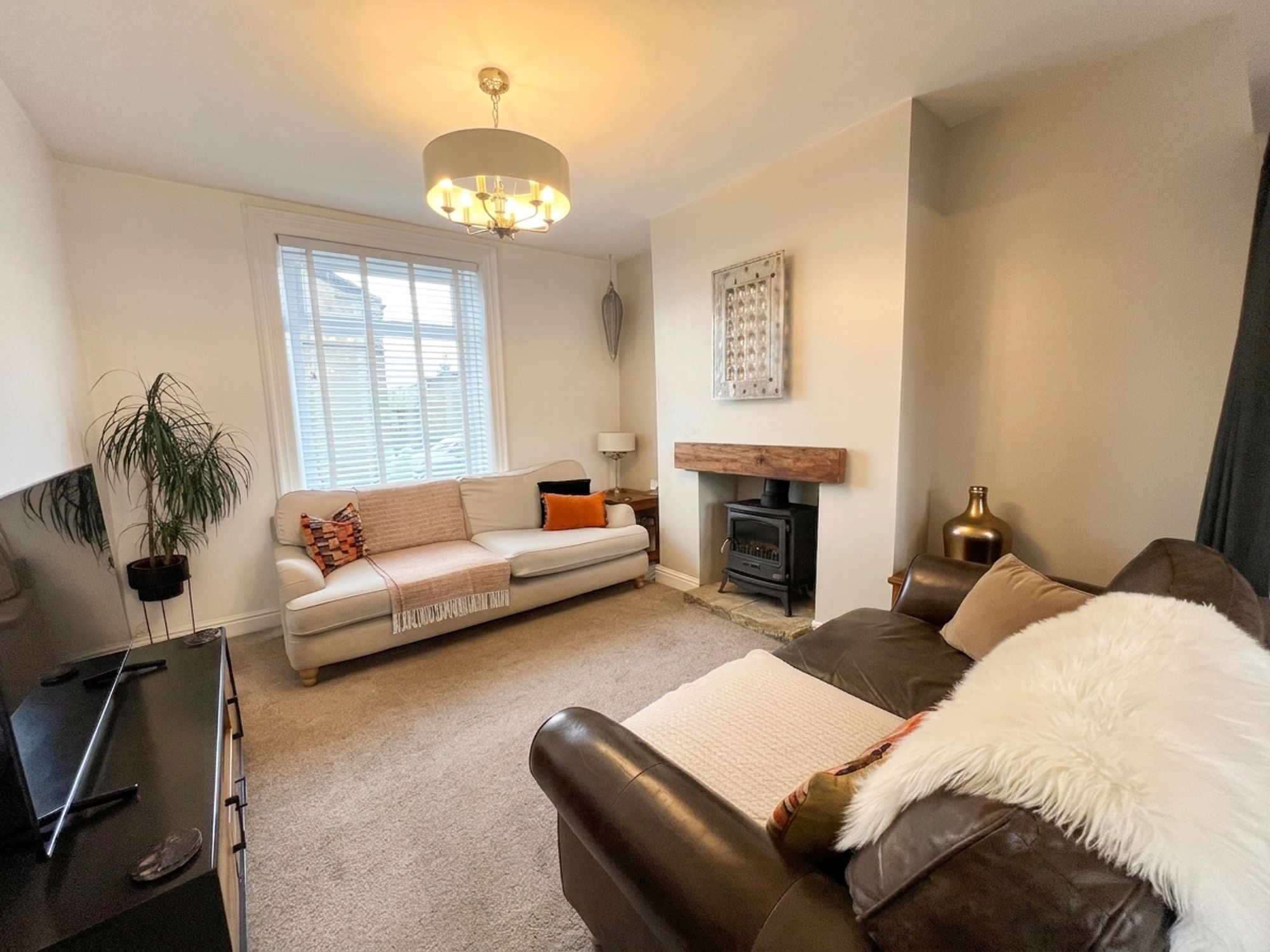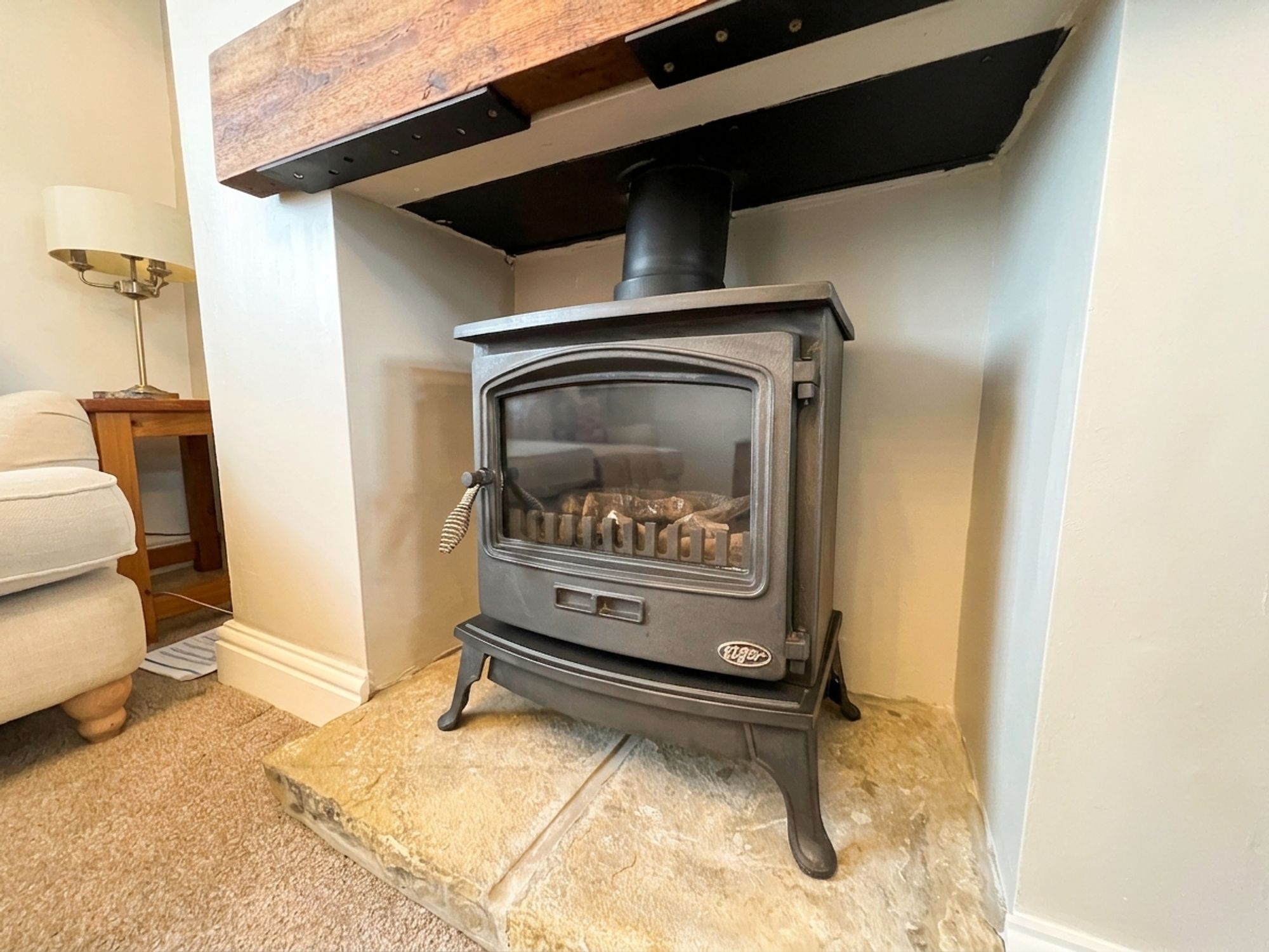 As the photography suggests, the lounge is a generously proportioned, light and airy reception room with a bank of double-glazed windows to the front elevation. There is a central ceiling light point, a radiator and the focal point of the room is the inset fireplace with a cast-iron wood-burning stove, set upon a raised stone hearth.