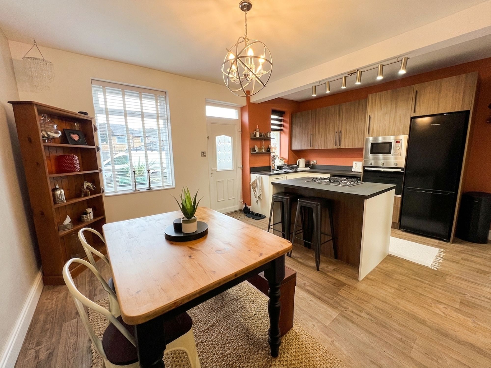 Enter the property through a double-glazed, PVC front door with obscure-glazed inserts to the entrance hall. The entrance hall features a wooden handrail with traditional spindle balustrade which proceeds to the first floor with essential carpet runner, a cast-iron, vertical column radiator with vanity mirror with ceiling light point, decorative dado panelling and a door provides access to the open plan dining kitchen.