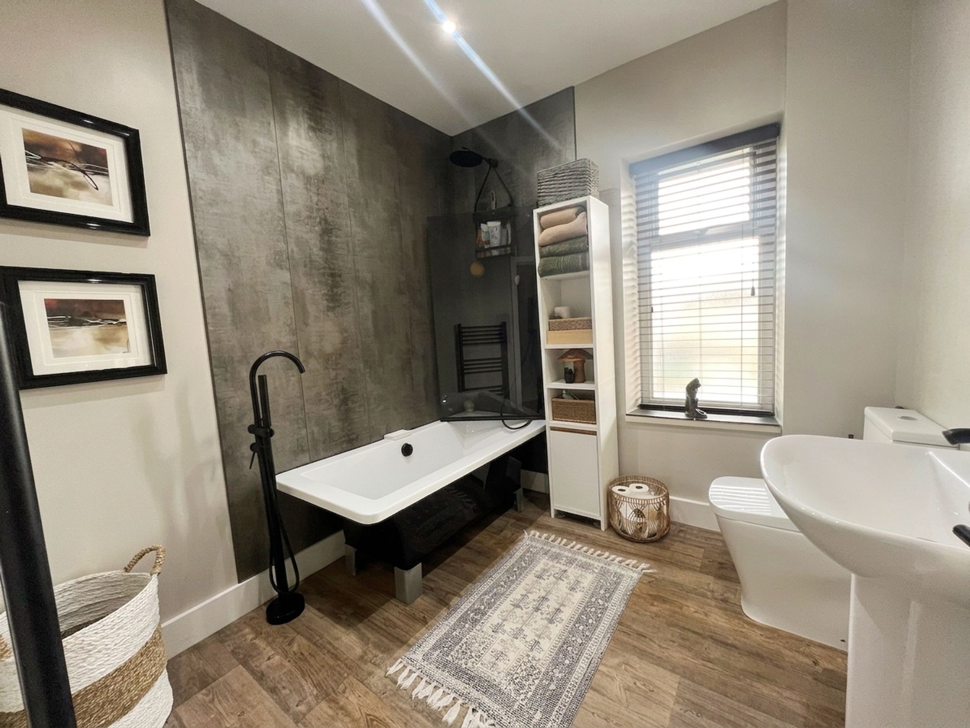 The bathroom features a modern, contemporary, three-piece suite which comprises of a free-standing, double ended bath with floor-mounted shower head mixer tap. The bath has a thermostatic, rainfall shower over with glazed shower guard, there is a low-level w.c. with push-button flush and a broad, pedestal wash handbasin with Monobloc mixer tap and tiled splashback. There is attractive panelling into the splash areas, inset spot lighting to the ceilings, a horizontal, ladder-style radiator and a double-glazed window with obscure glass and tiled sill to the rear elevation.