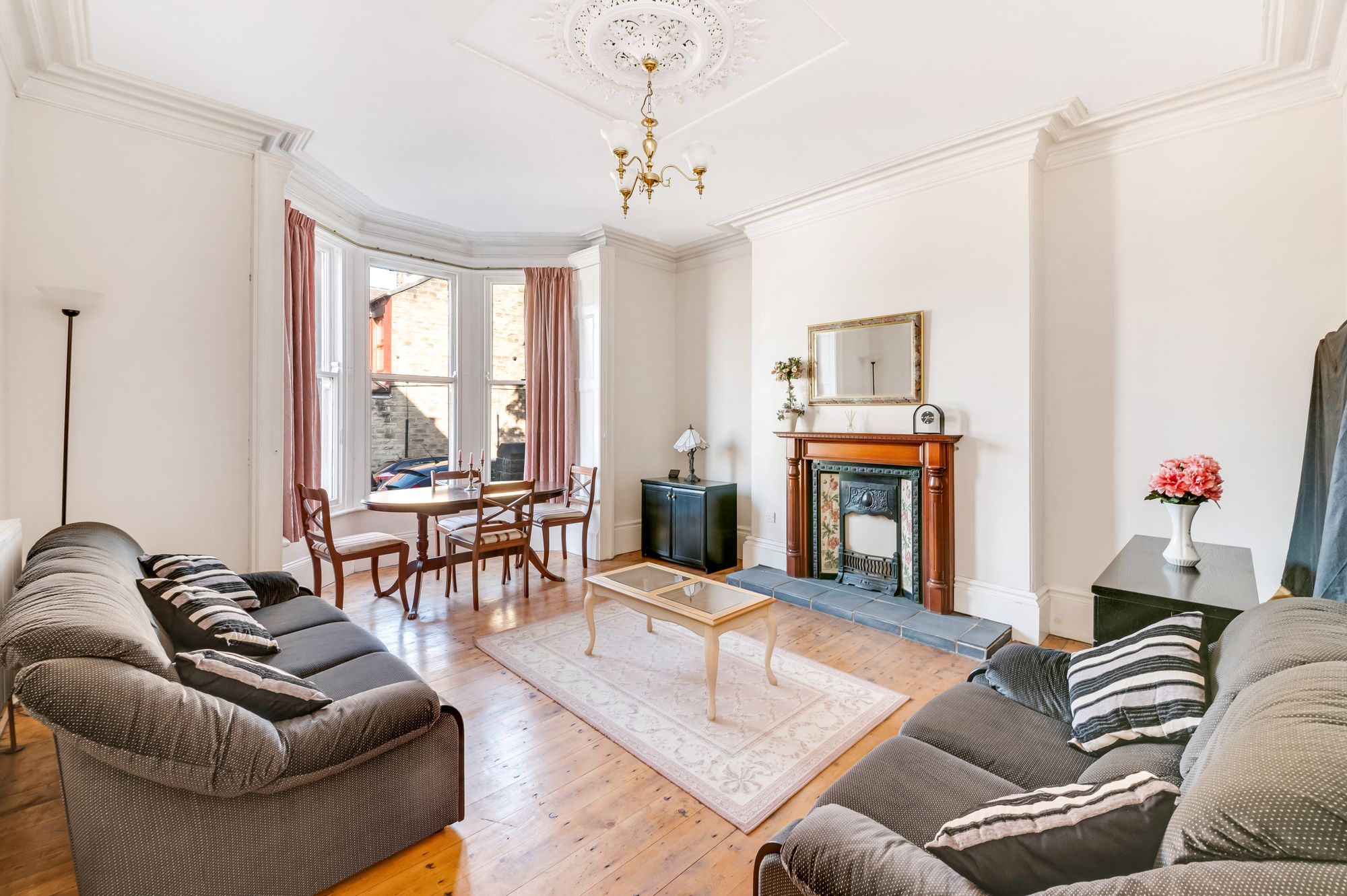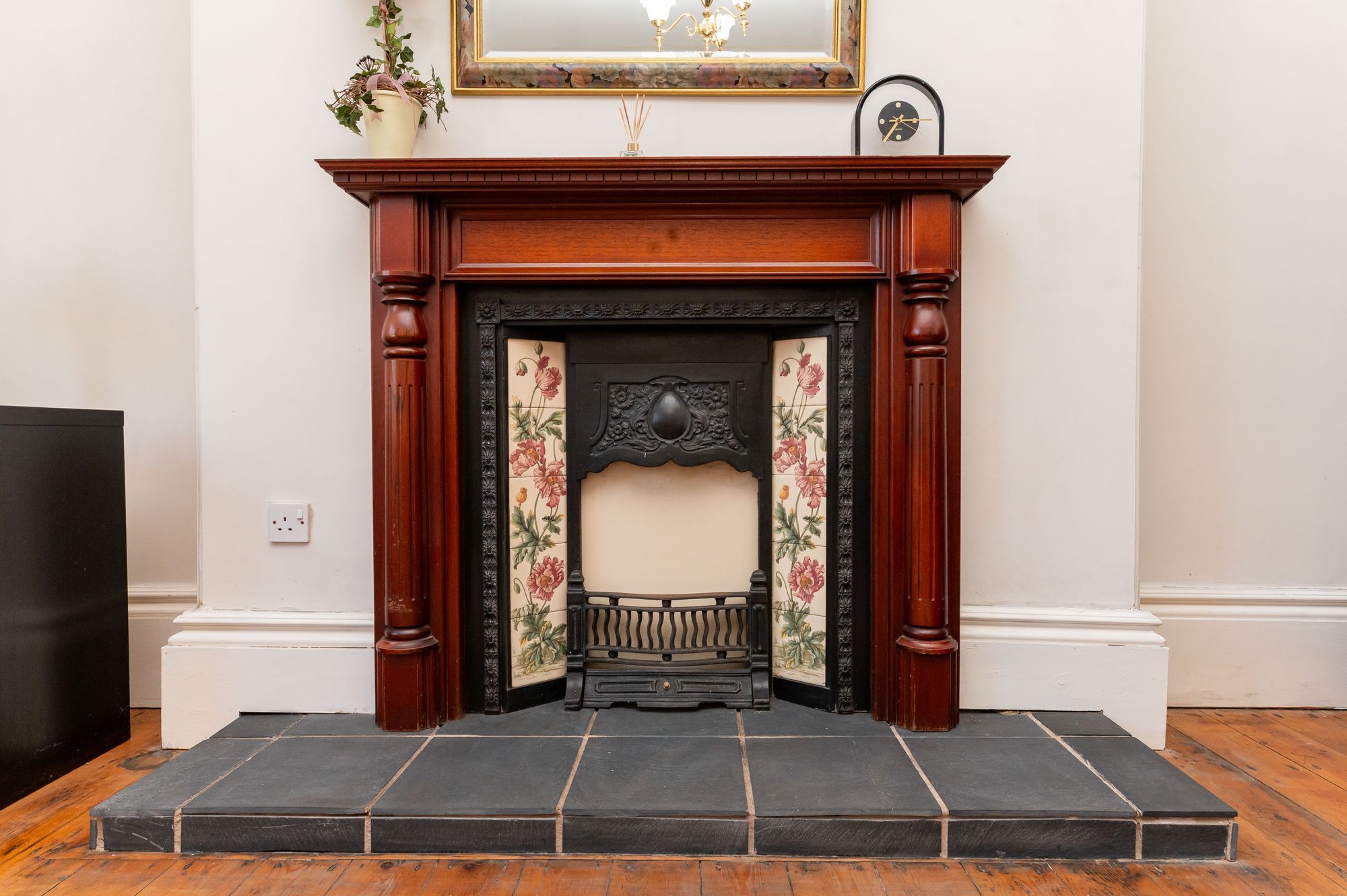 LIVING ROOMA spacious reception room with the main focal point of the room being a cast iron fire fireplace with tiles and wooden mantle. There is a ceiling light with ceiling rose, coving to the ceiling, wooden floor, two central heating radiators and three wooden framed sash windows.