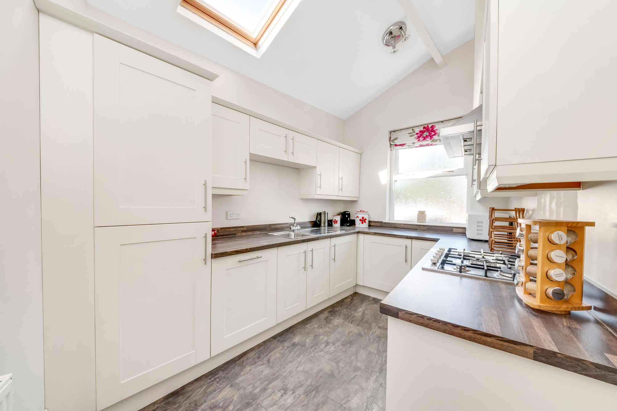 DINING KITCHENA large spacious dining kitchen divided into two areas. The kitchen itself has a range of wall and base units in a shaker style with wood effect laminate worktops over with matching upstands. There is an Integrated electric oven with five ring burner with stainless steel chimney style extractor fan over and one and half bowl stainless steel sink with chrome mixer tap over. The room has two ceiling lights, Velux skylight, central heating radiator, slate effect laminate flooring and obscure uPVC double glazed window.