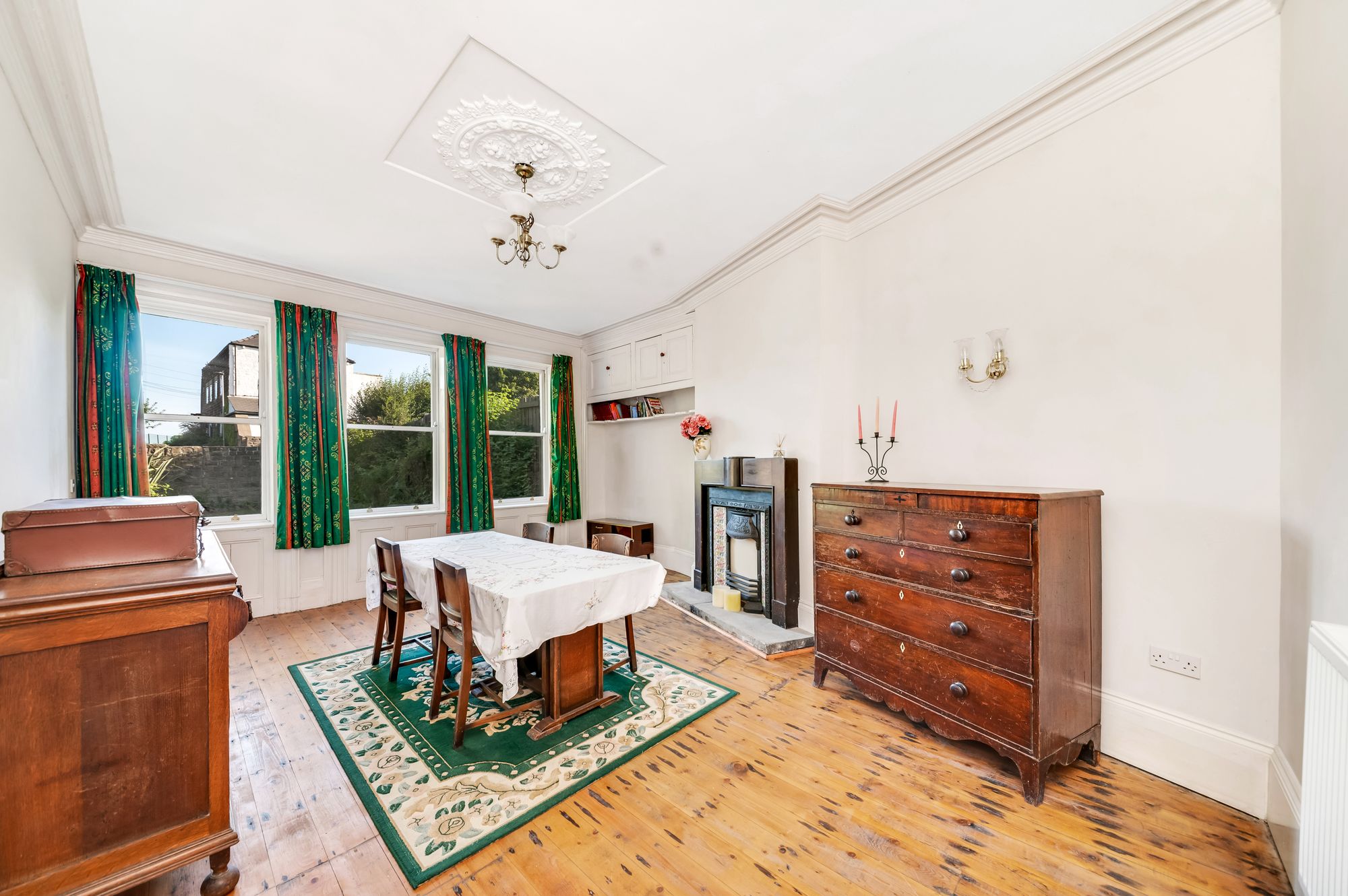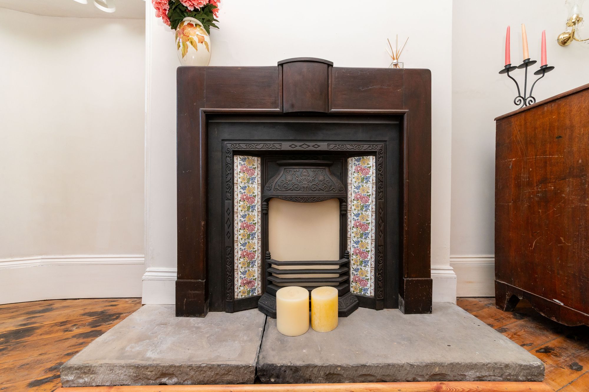 DINING ROOMA well sized dining room with coving to the ceiling, ceiling light with ceiling rose, cast iron fireplace with tiled surround and stone hearth, wooden flooring, two central heating radiators and three wooden framed sash windows.
