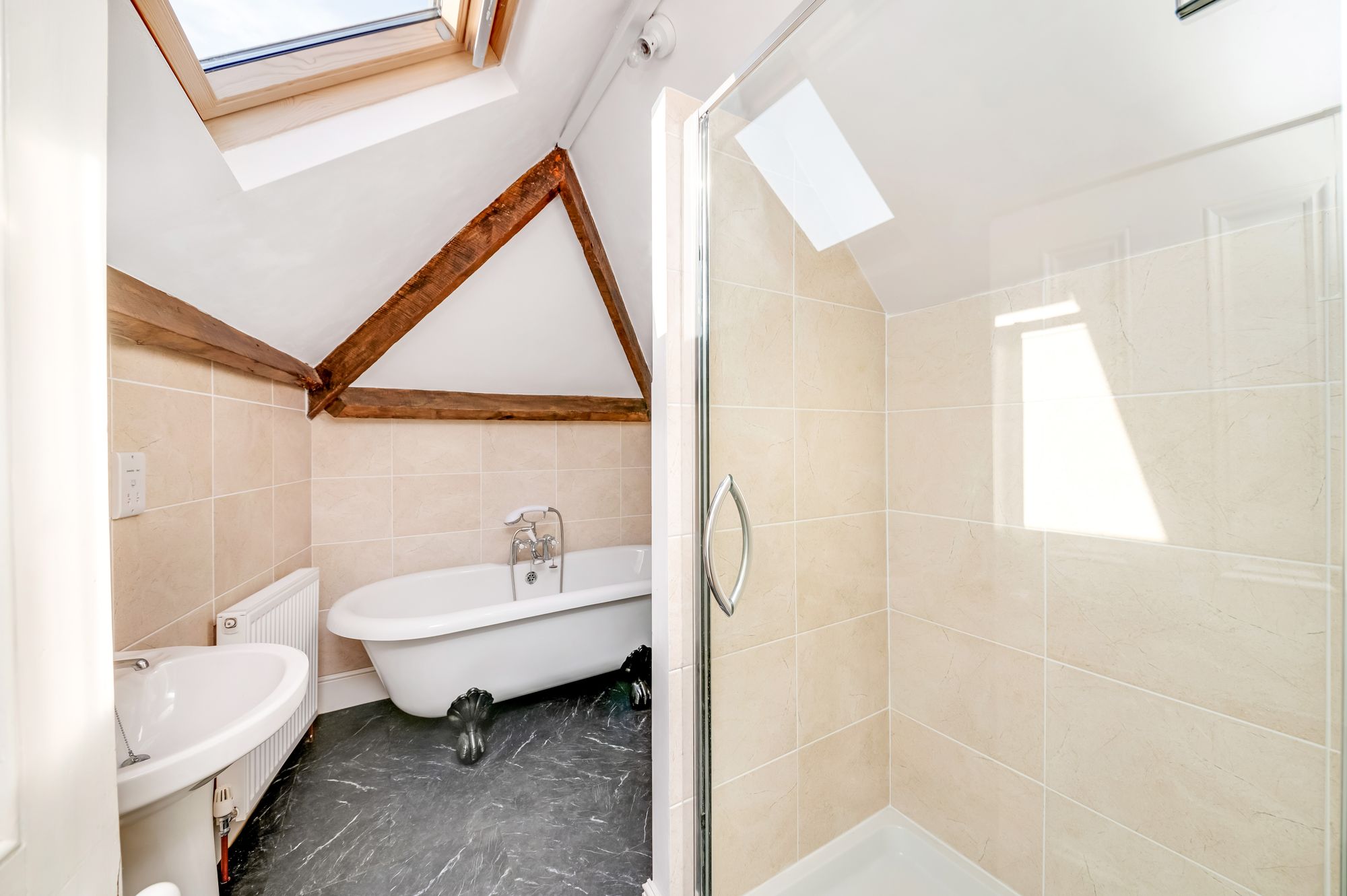 BATHROOMComprising of a four-piece suite in the form of; close coupled W.C, pedestal basin with mixer taps over, shower cubicle with Triton electric shower within and a roll top bath with handheld shower attachment and chrome mixer taps over. The room has a ceiling light, central heating radiator, part tiling to walls, shaver socket, extractor fan, exposed beams and Velux skylight.