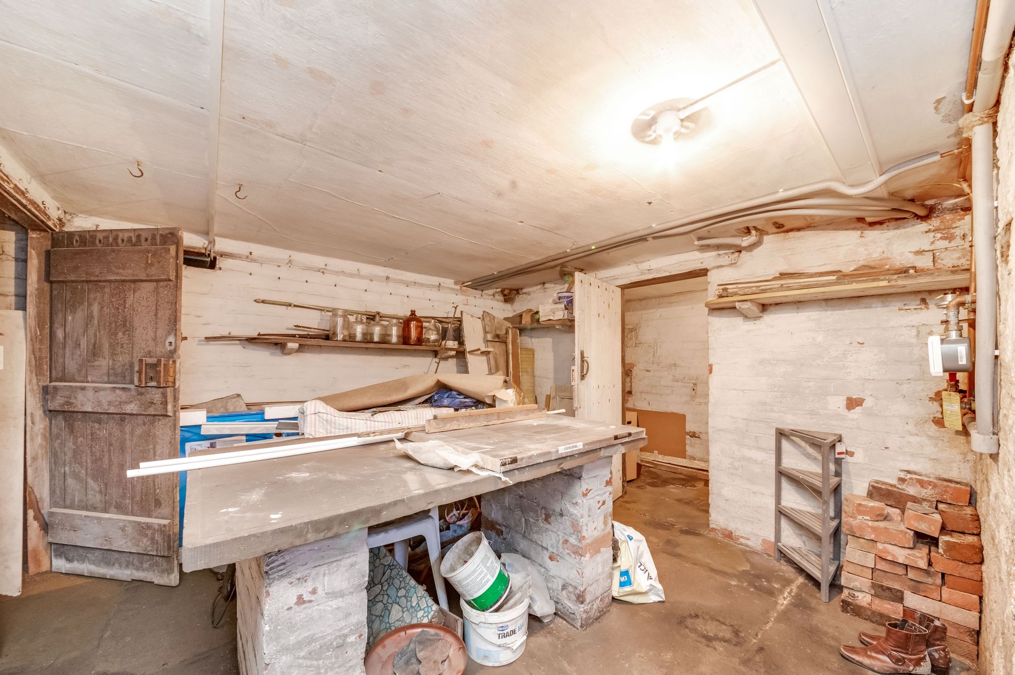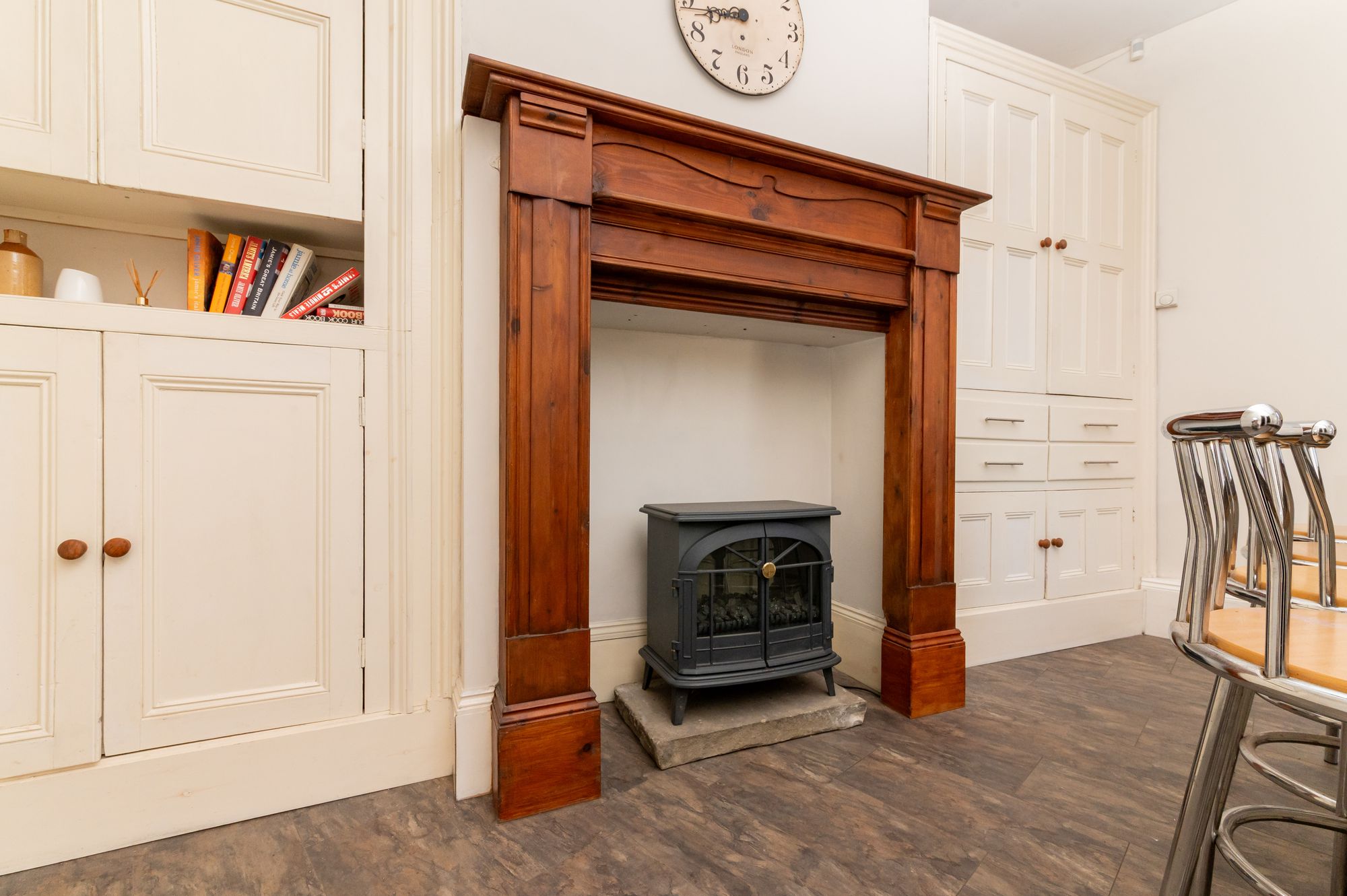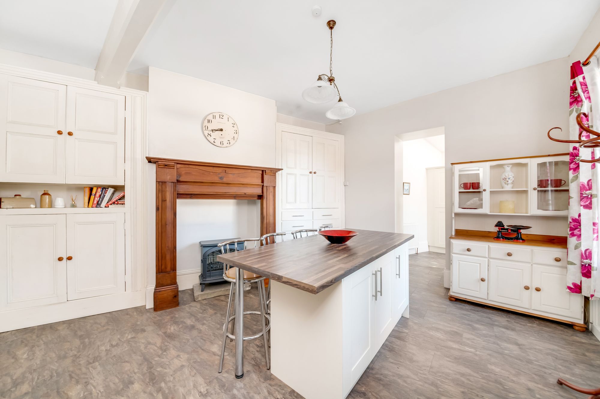 DINING KITCHENThe dining section has a island seating bar with shaker style base units and wood effect laminate worktop. The room has the original butler cupboards, central heating radiator, feature fireplace with flame effect electric fire, wooden framed sash window, wall light, wooden door leading to the side of the property and access to the cellar.