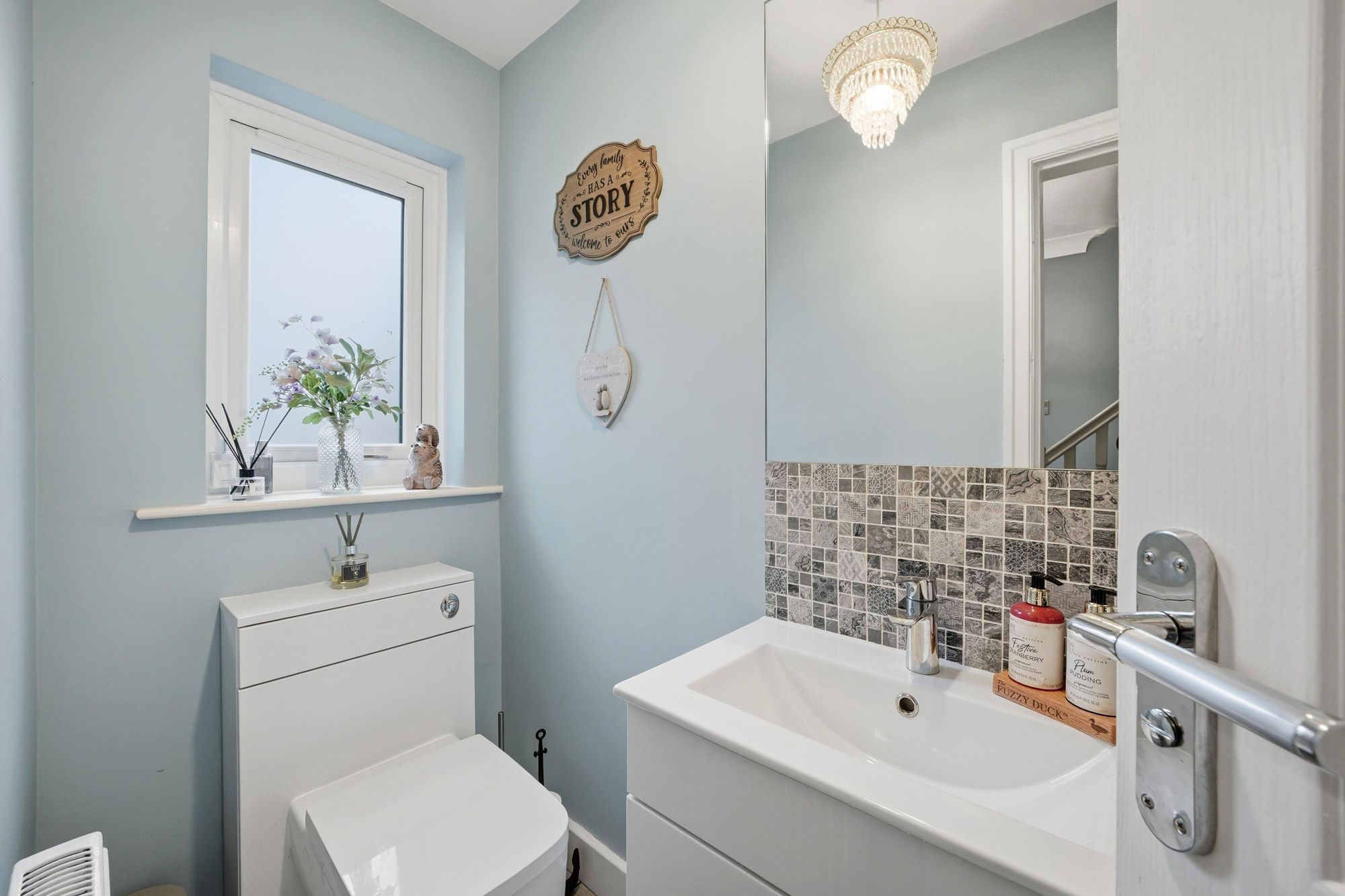 With frosted pvcu double glazed window, ceiling light point, central heating radiator, tiled floor and fitted with a suite comprising vanity unit incorporating wash basin with chrome monobloc tap and tiled splashbacks together with a low flush wc with concealed system.